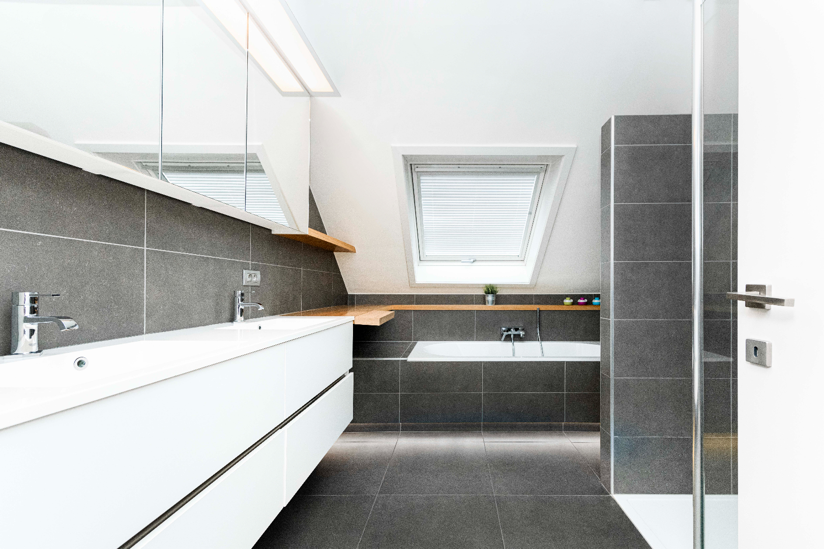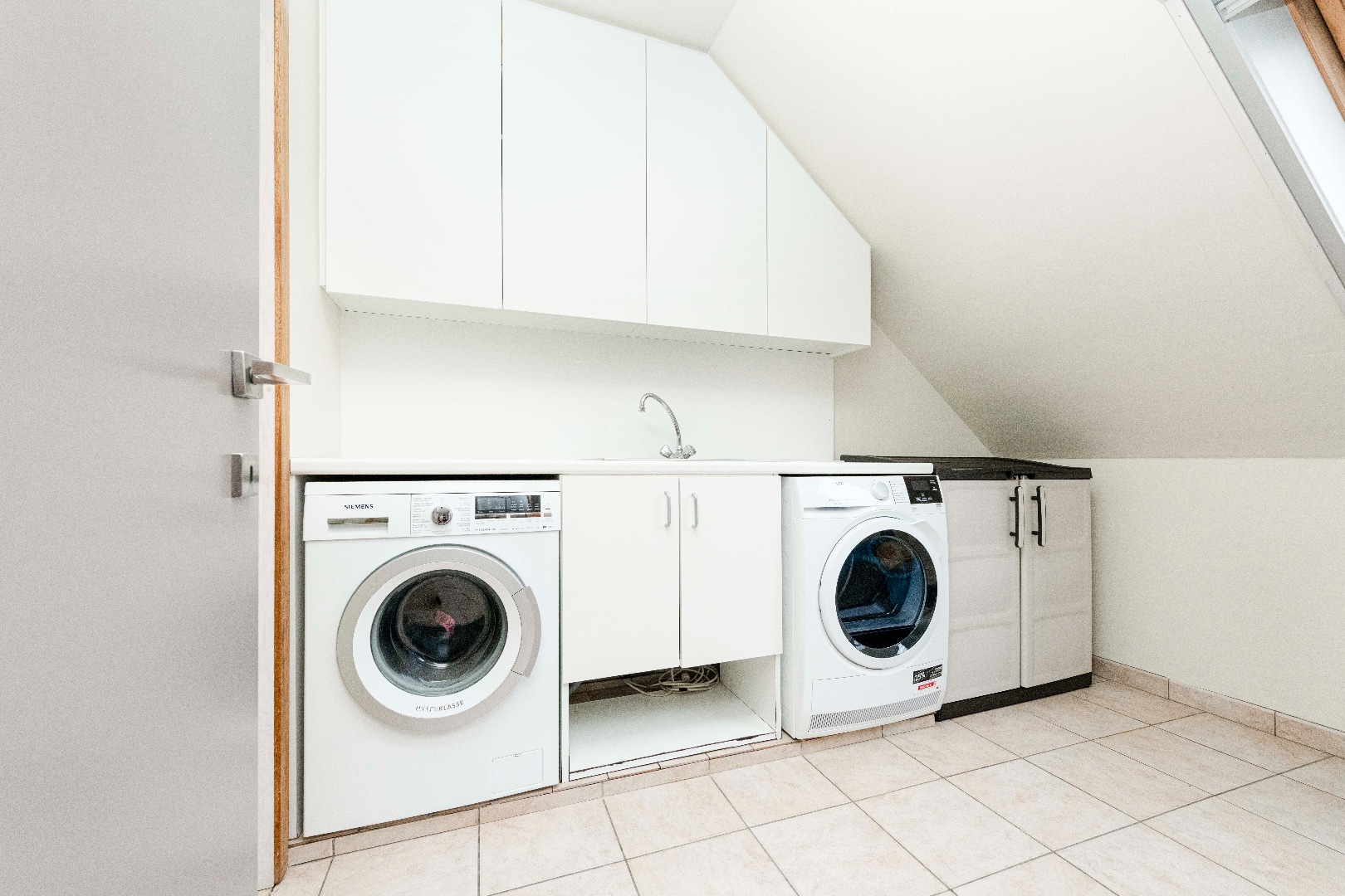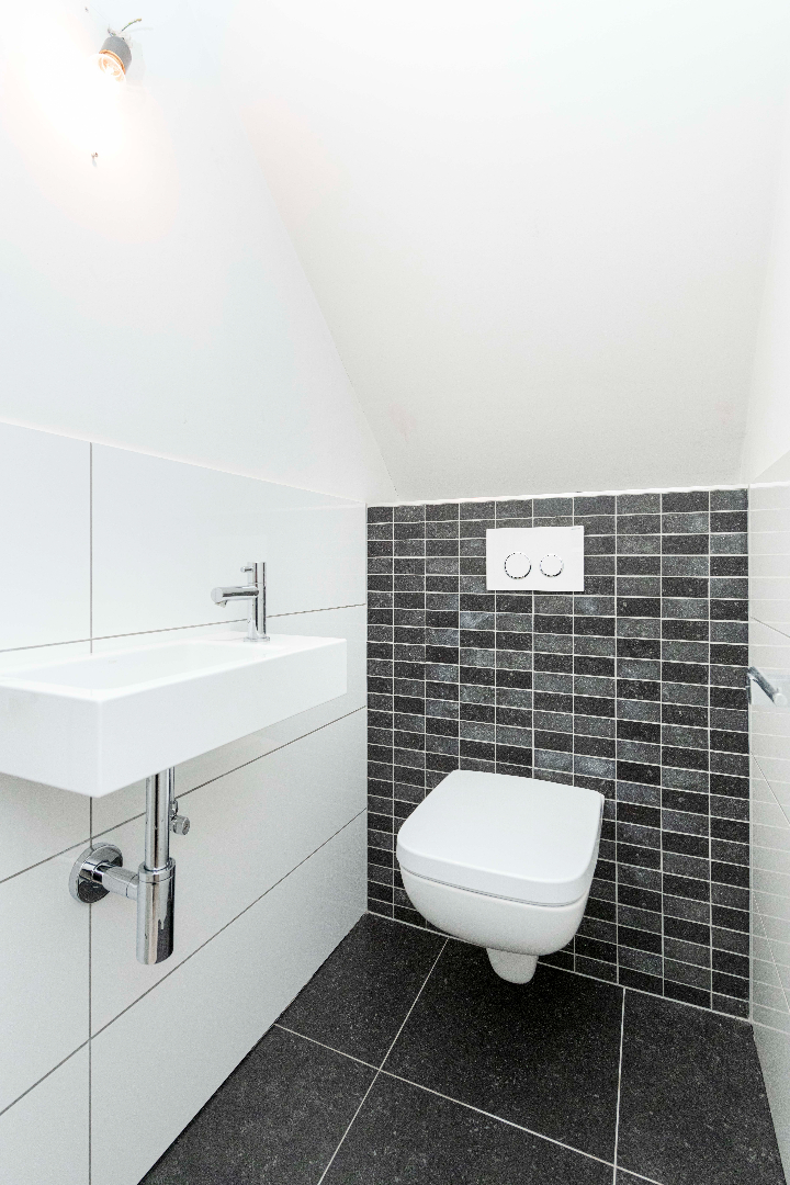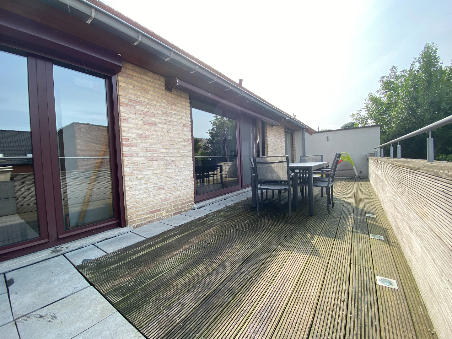 Het ruime terras achteraan met een oppervlakte van maar liefst 30 m² is zuidgericht en beschikt over een aparte berging en een automatische zonneluifel. Het terras aan de voorgevel is bereikbaar via de leefruimte en omvat een oppervlakte van 5,50 m². Er is mogelijkheid tot aankoop van een garage van 23 m² met aansluiting water en elektriciteit.