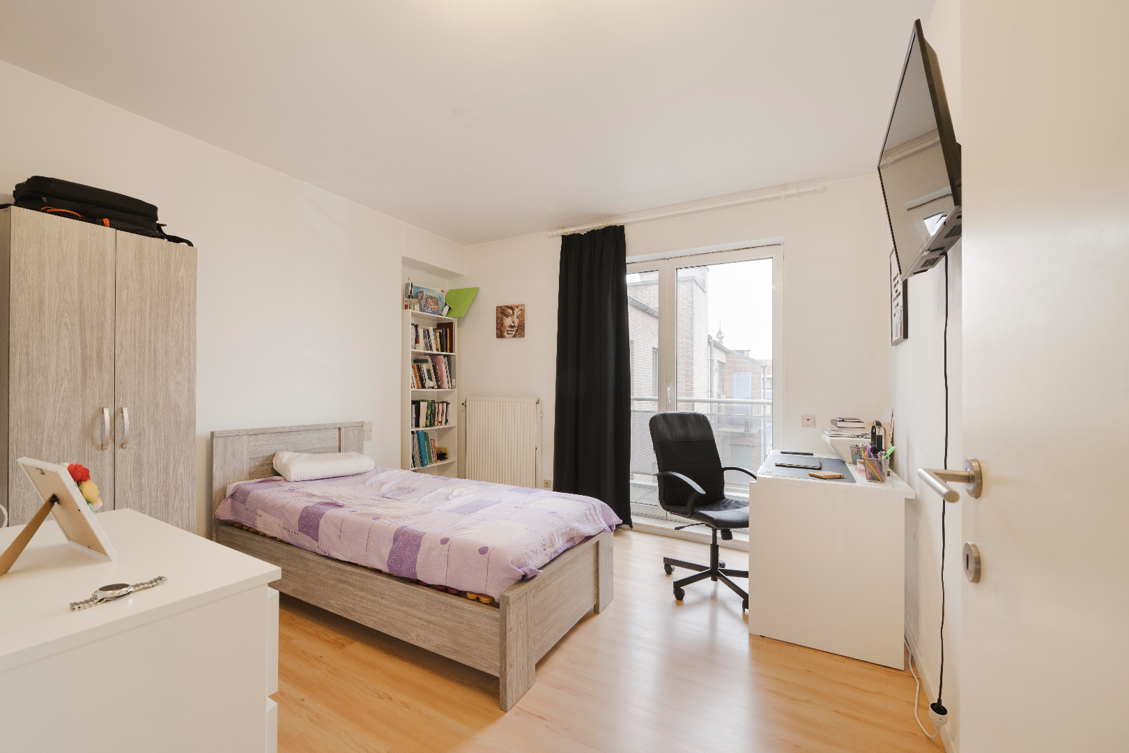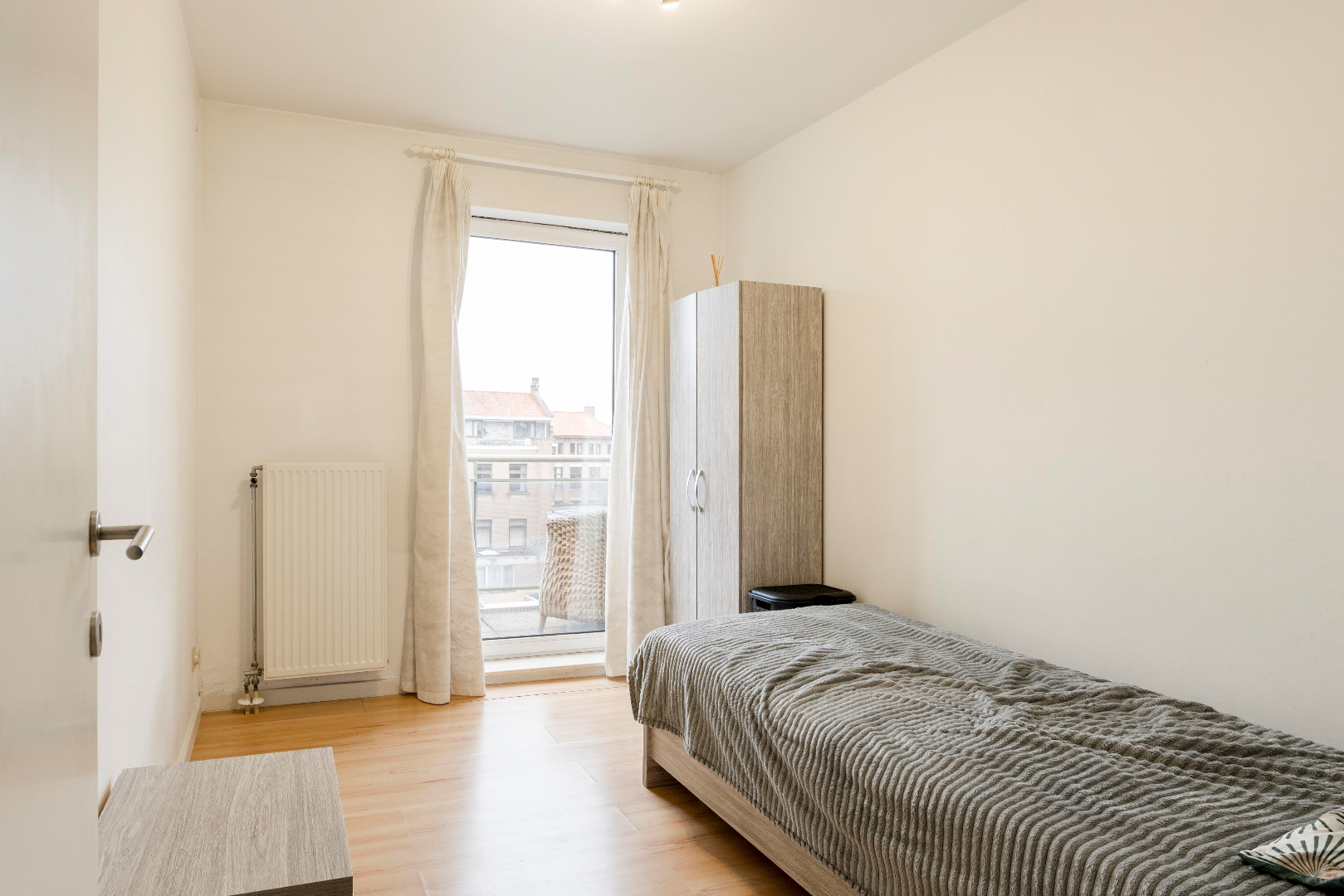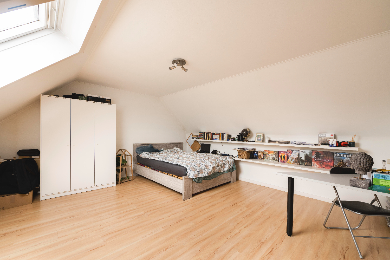 Vanuit de inkom is er tevens toegang tot de badkamer (ligbad/douche/dubbele lavabo met meubel), slaapkamer 1 (8,75 m²) en slaapkamer 2 (12,25 m²) met beide toegang tot het terras op de achtergevel. Via vaste trap naar het volgende verdiep komen we in de polyvalente ruimte of derde slaapkamer. Gezien de oppervlakte van 21,50 m² is dit een extra troef!