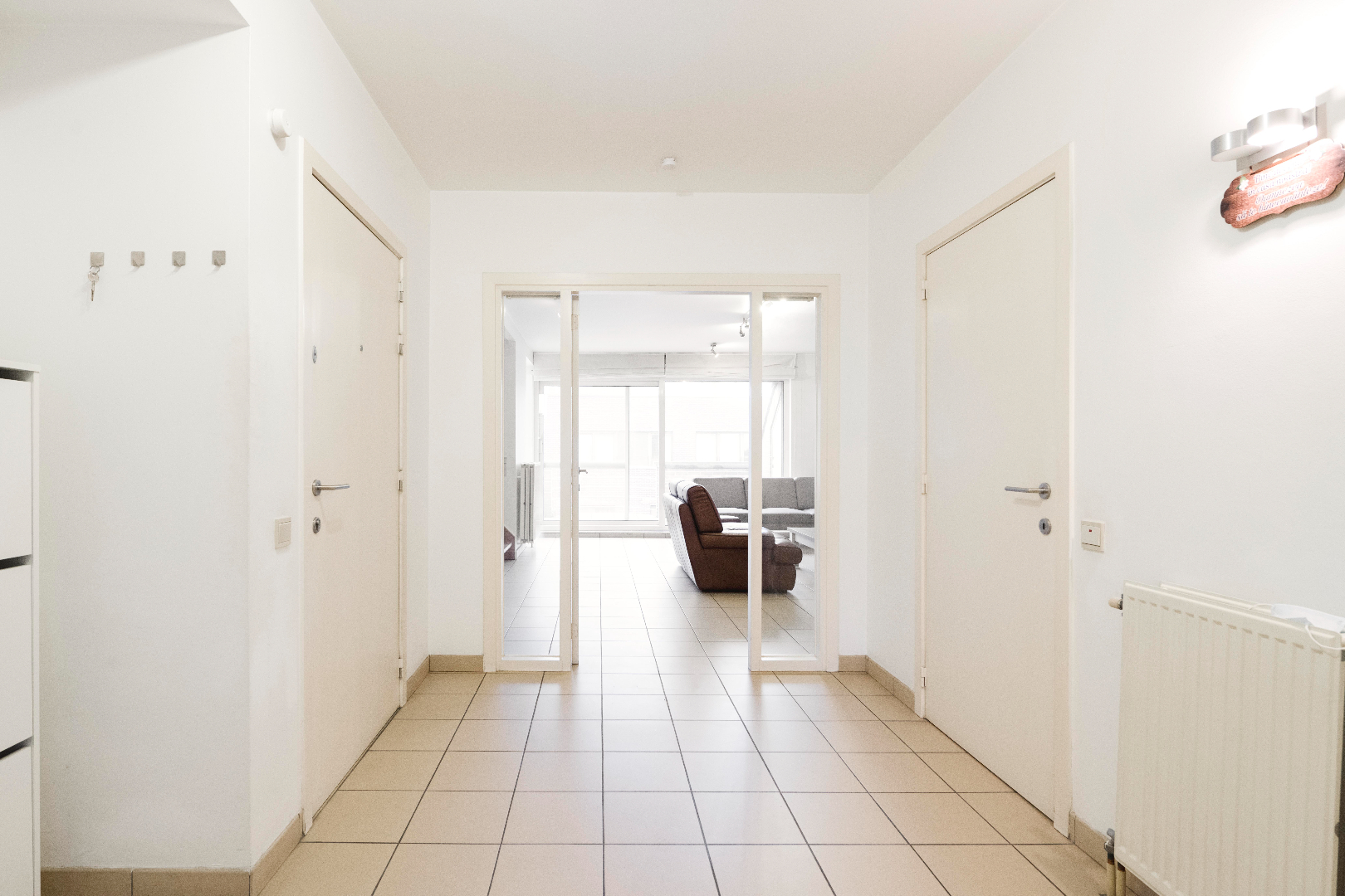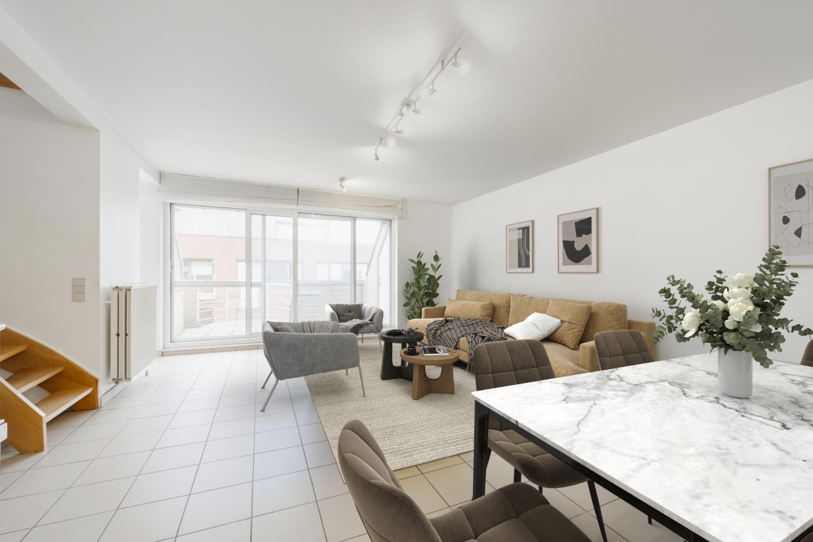 U komt de résidentie binnen via de Noordstraat, deze is voorzien van een conforme lift met trappenhal. Het eigenlijke appartement beschikt over een zeer praktische inkom (10m²) met toegang tot het gastentoilet. Via de dubbele glazen deur komt U de lichtrijke leefruimte binnen van 26,75 m² met directe toegang tot het terras aan de Noordstraat. Verder is er de half open keuken (volledig ingericht met toestellen | 5,50 m²) met aansluitend handige koele berging (3,5 m²).