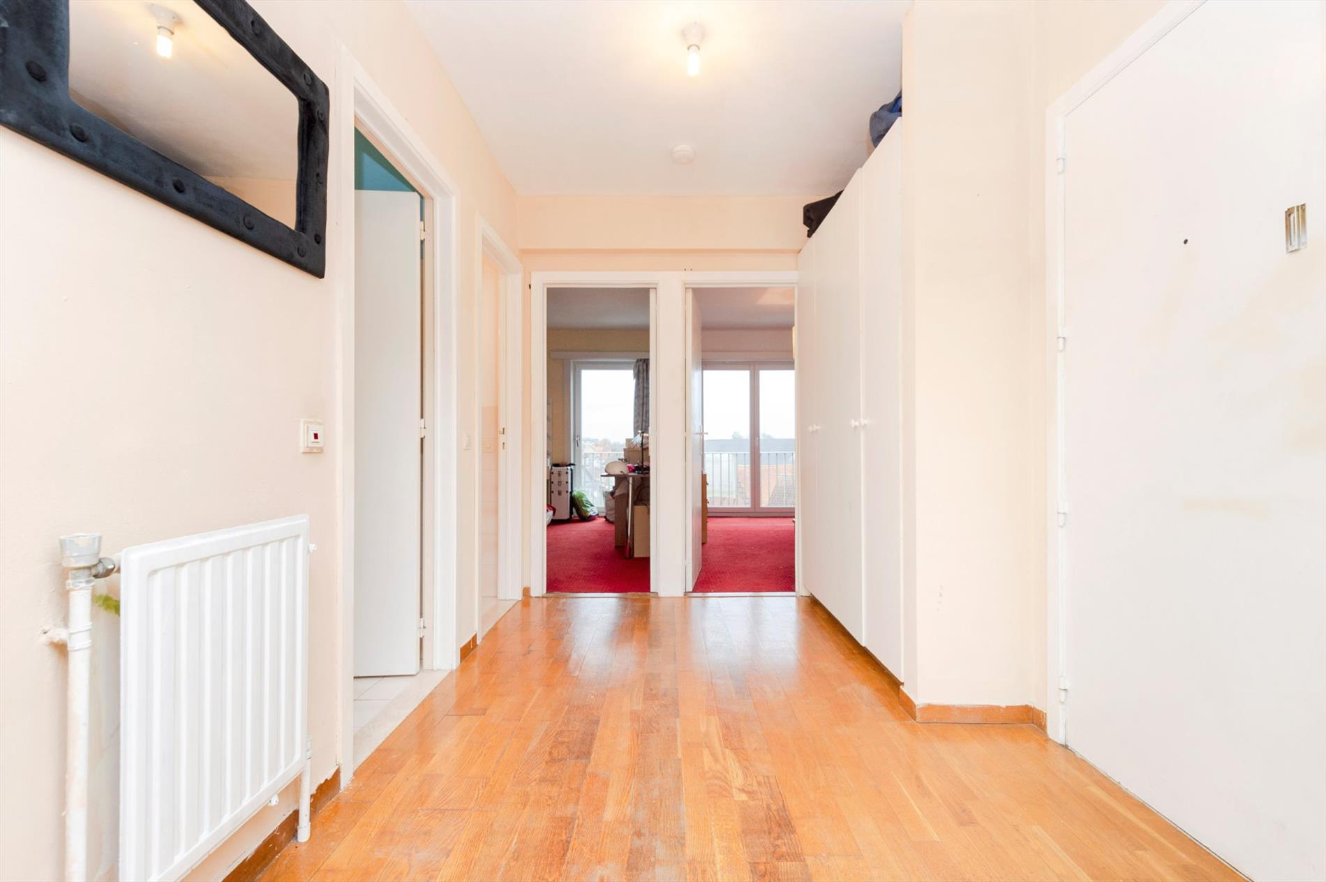We komen binnen in de inkomhal die toegang biedt tot de 2 slaapkamers, de badkamer, het afzonderlijk toilet en de ruime leefruimte.