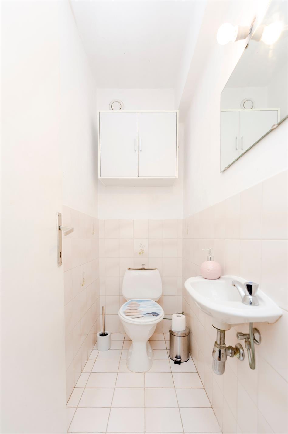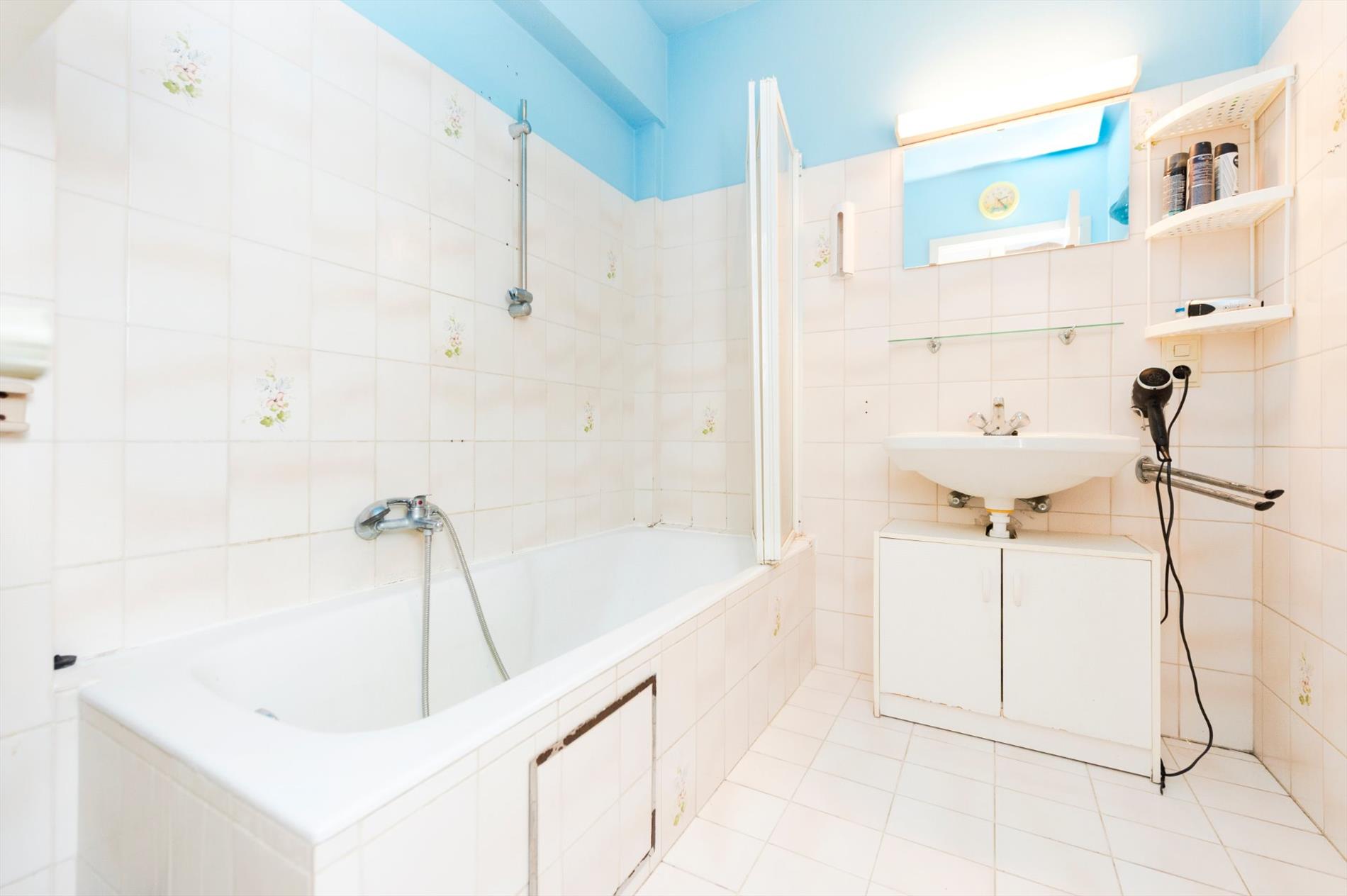 Terug in de inkomhal komen we terecht in de badkamer. Deze is voorzien van een ligbad met douchekop, enkele lavabo met meubel. Naast de badkamer hebben we het afzonderlijk toilet.