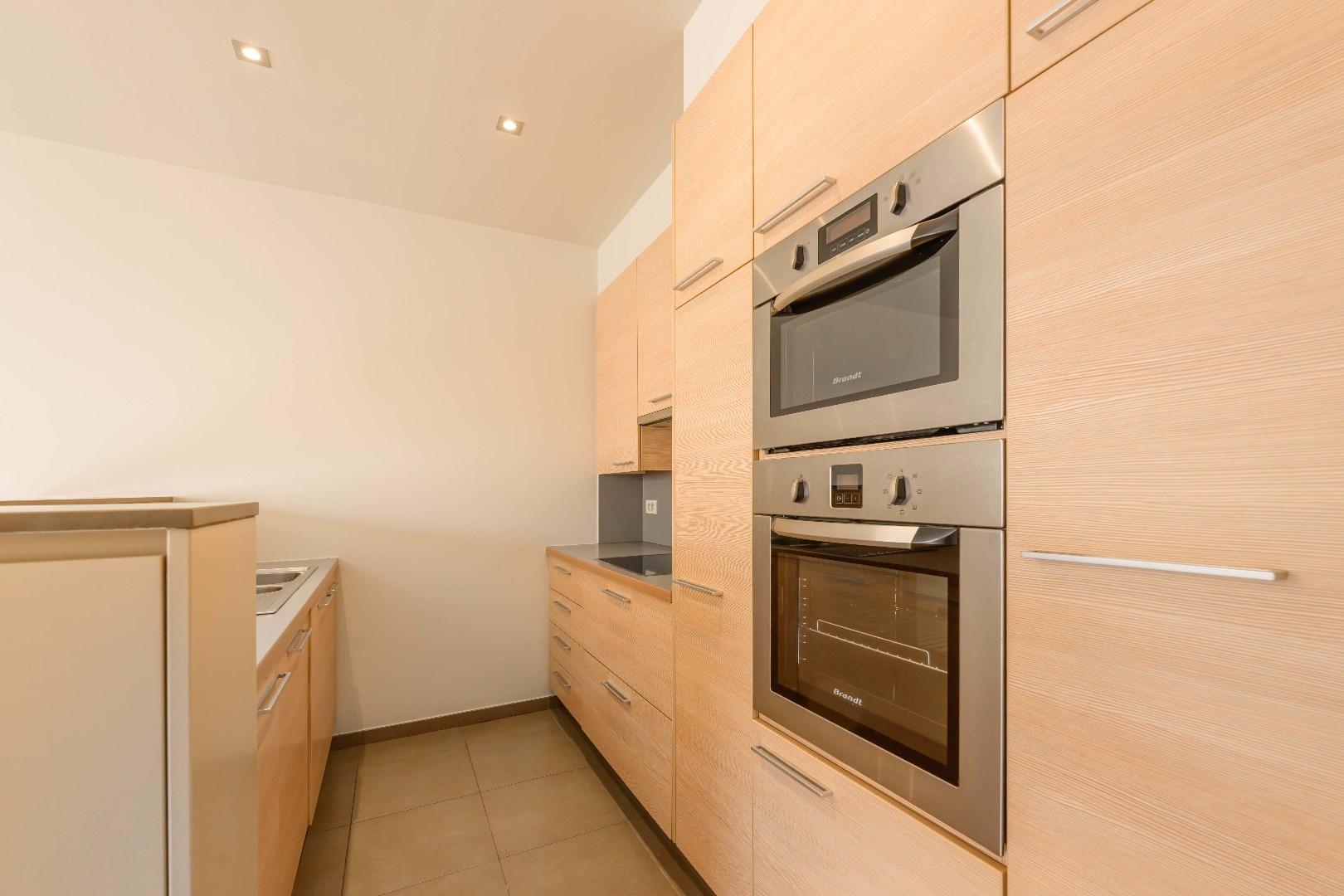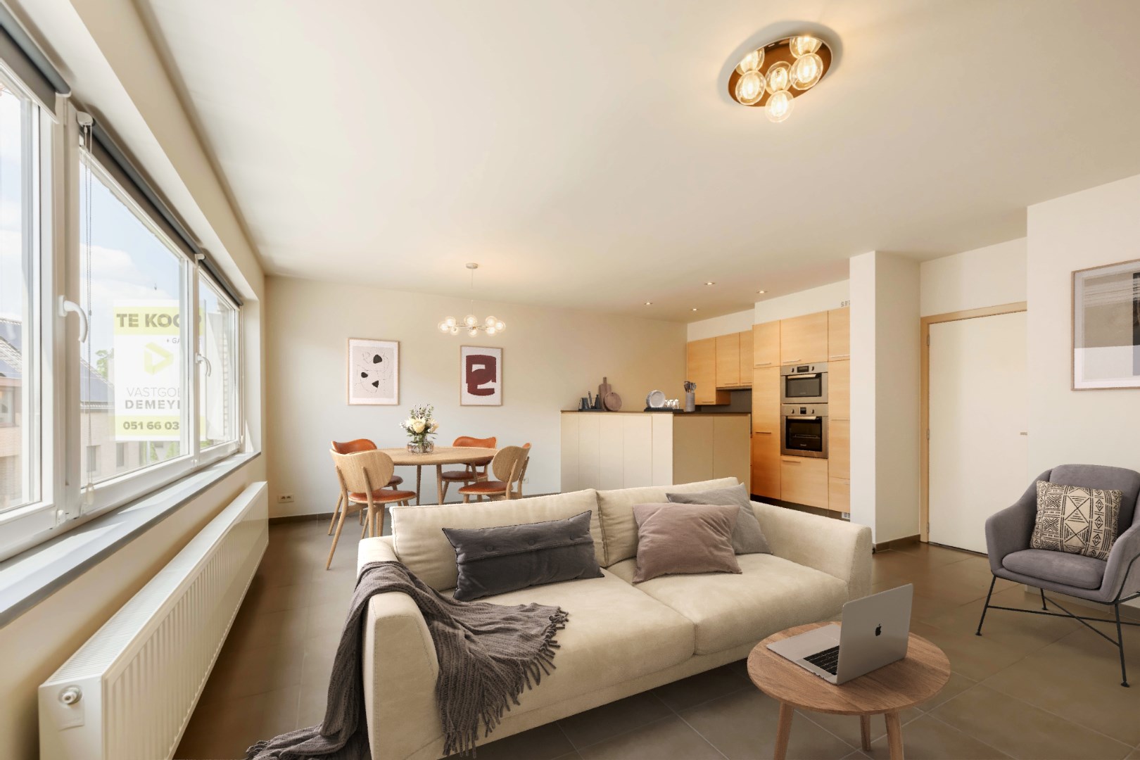 De lichtrijke en ruime leefruimte met volledig ingerichte keuken (kookplaat | dampkap | 1,5 spoelbak | oven | frigo) geeft je onmiddellijk "thuis" gevoel.