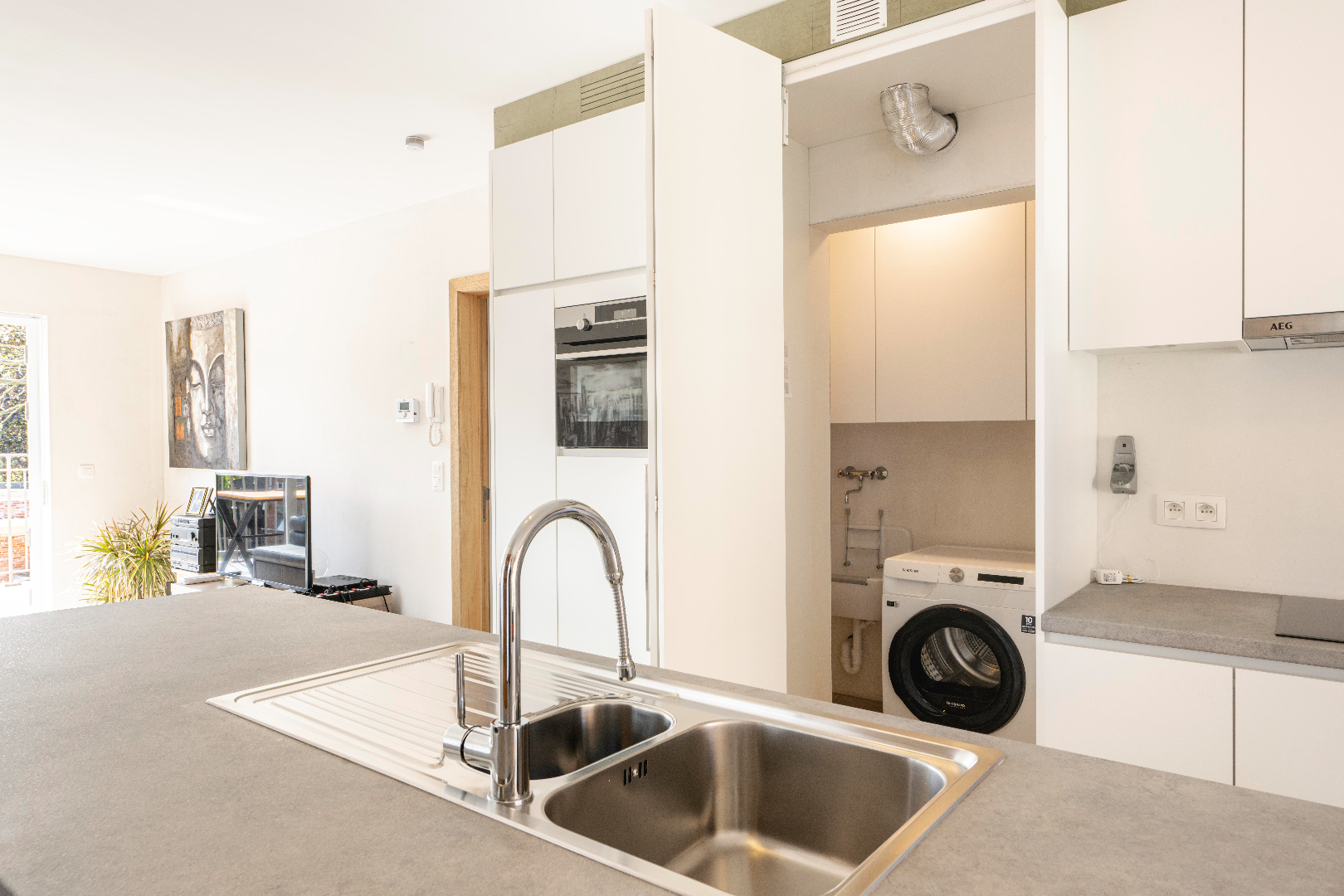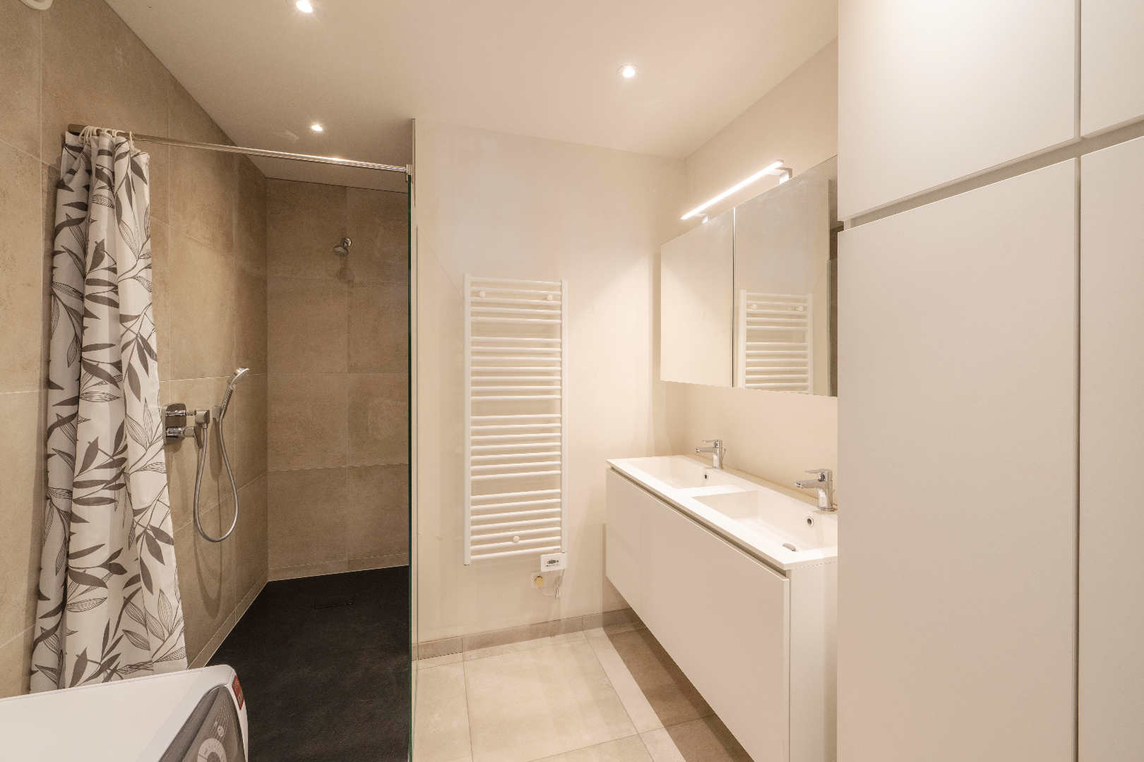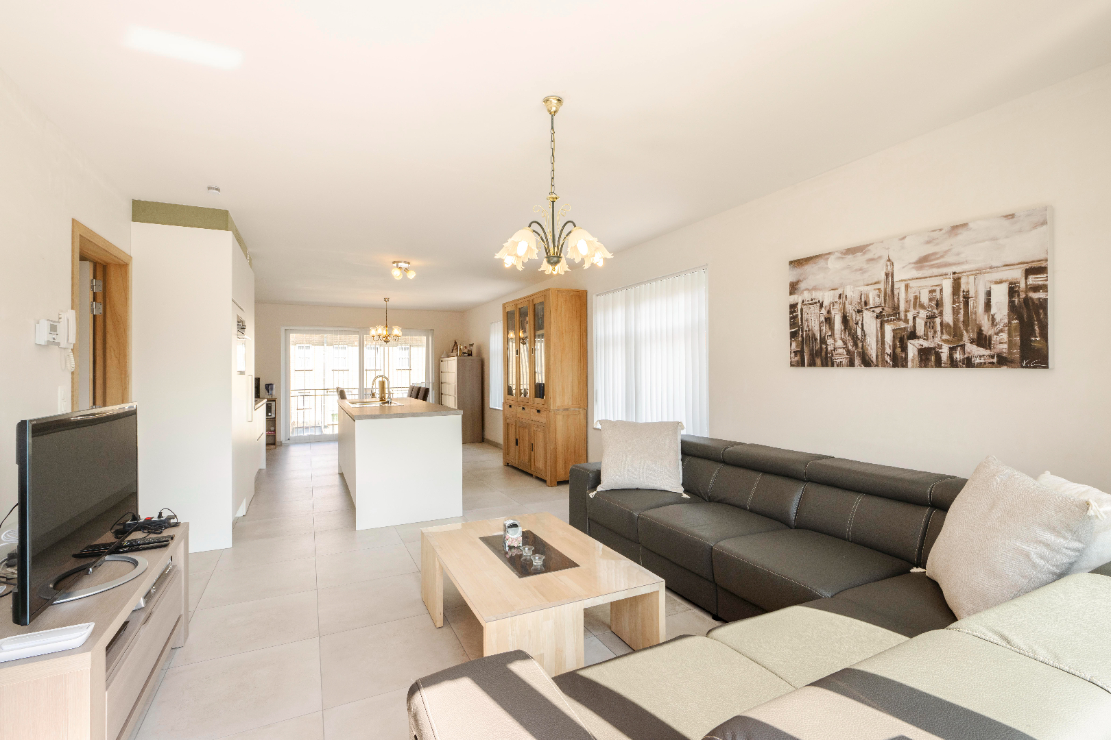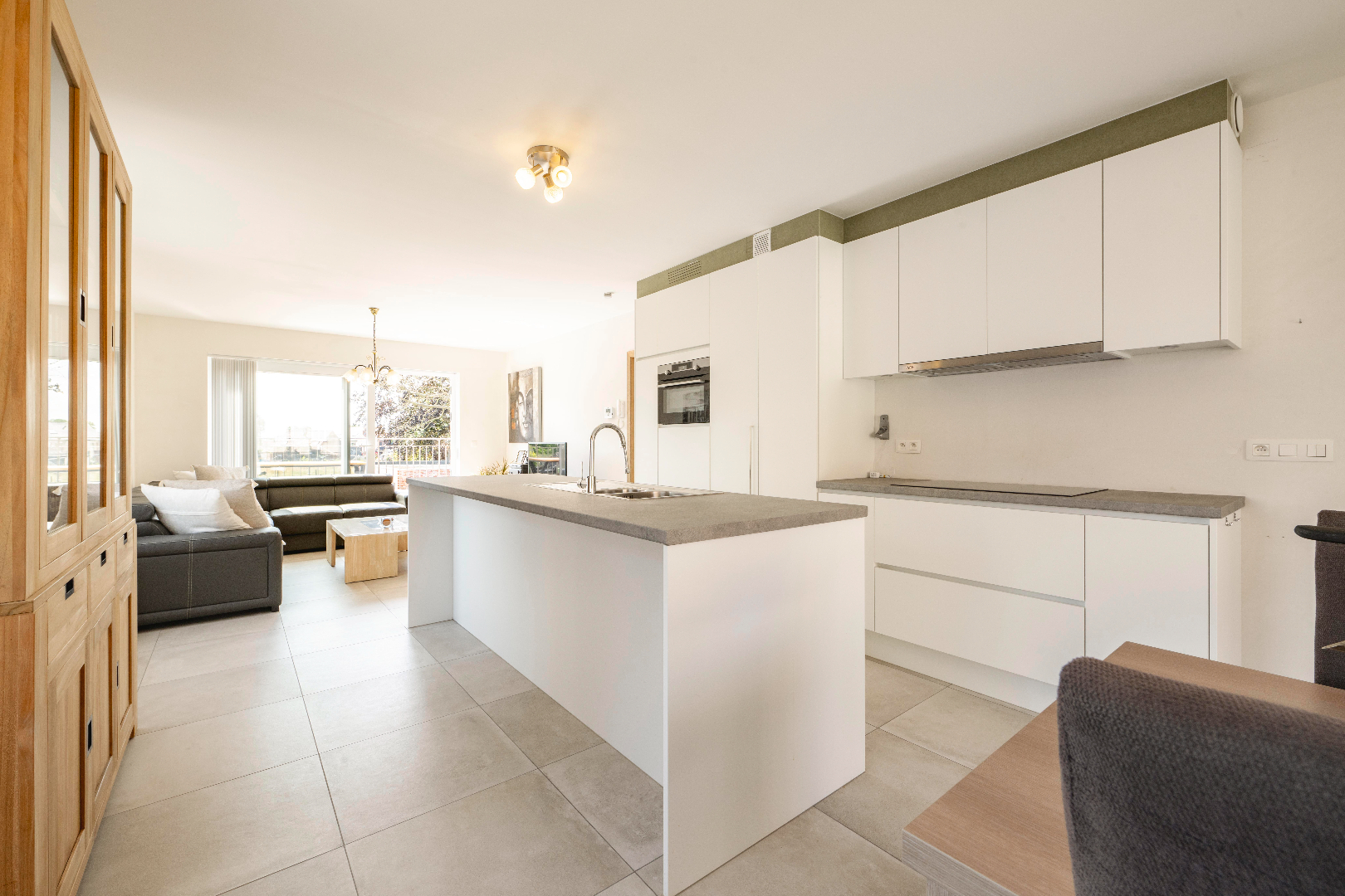 Verder komt U terecht in de ruime en lichtrijke leefruimte rechts de zithoek en links de open ingerichte keuken met kookeiland 40 m² (inductiekookplaat | dampkap | spoelbak | vaatwasmachine | oven | frigo) en eetplaats. In deze ruimte is er directe toegang tot zowel het terras vooraan (4 m²) als achteraan (15 m²). Via de keuken is er toegang tot de praktische berging. Vervolgens is er de nachthal met toegang tot nogmaals twee slaapkamers (13 m² | 8 m²) voorzien van inbouwkasten en de badkamer (inloopdouche | dubbele lavabo met meubel | aansluiting wasmachine/droogkast).