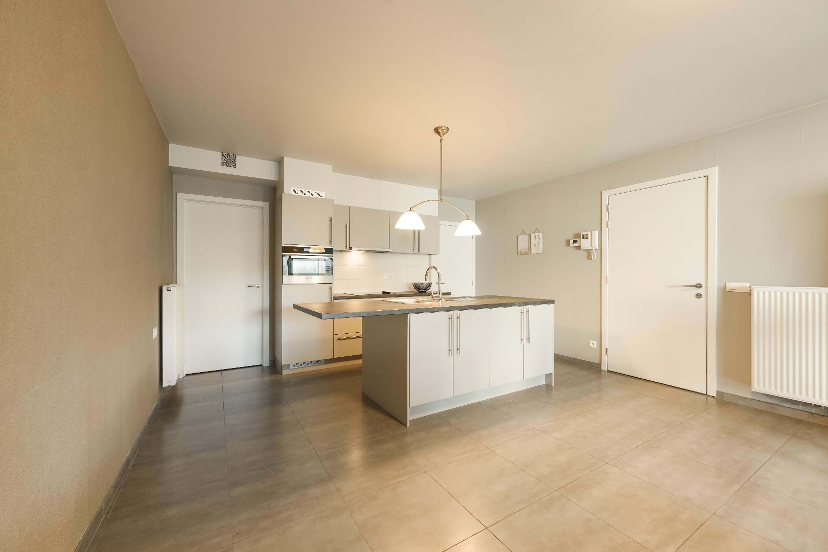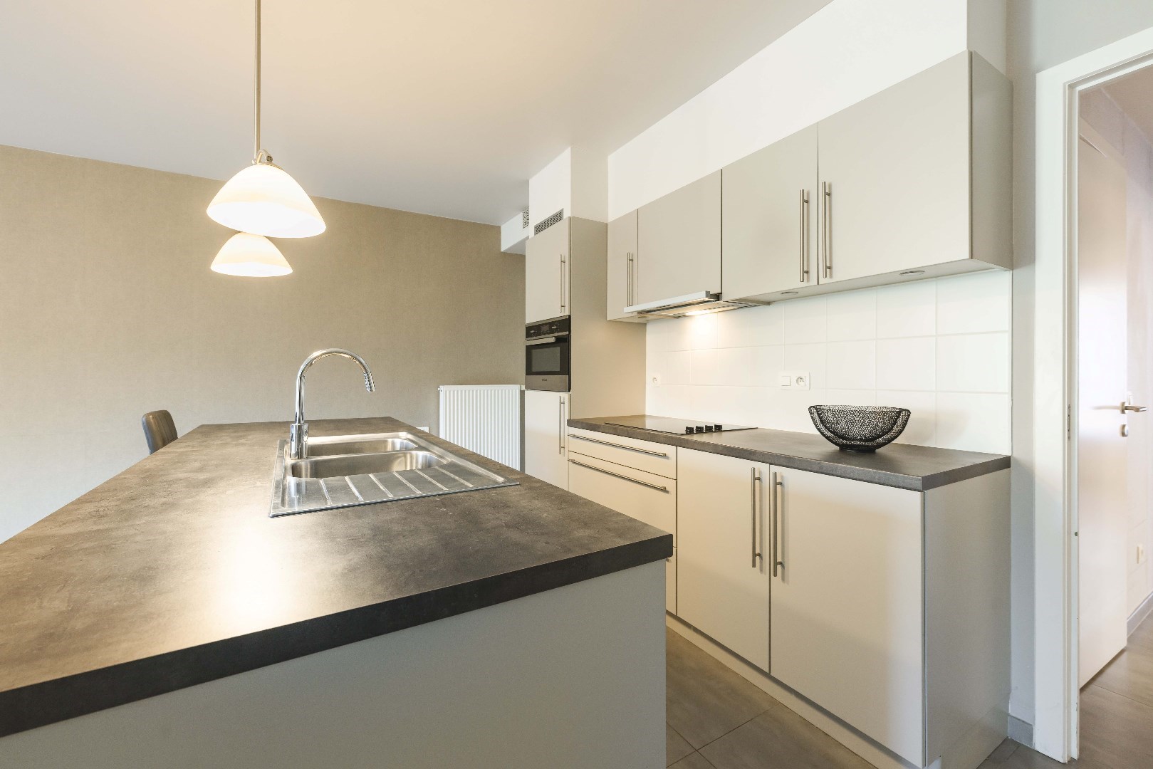 U beschikt over een volledig ingerichte open keuken, met eiland en moderne apparatuur: kookplaat, dampkap, spoelbak, oven, frigo en ruimte voor vaatwasser. Aansluitend is er de praktische berging met aansluiting voor wasmachine en droogkast alsook stapelruimte.