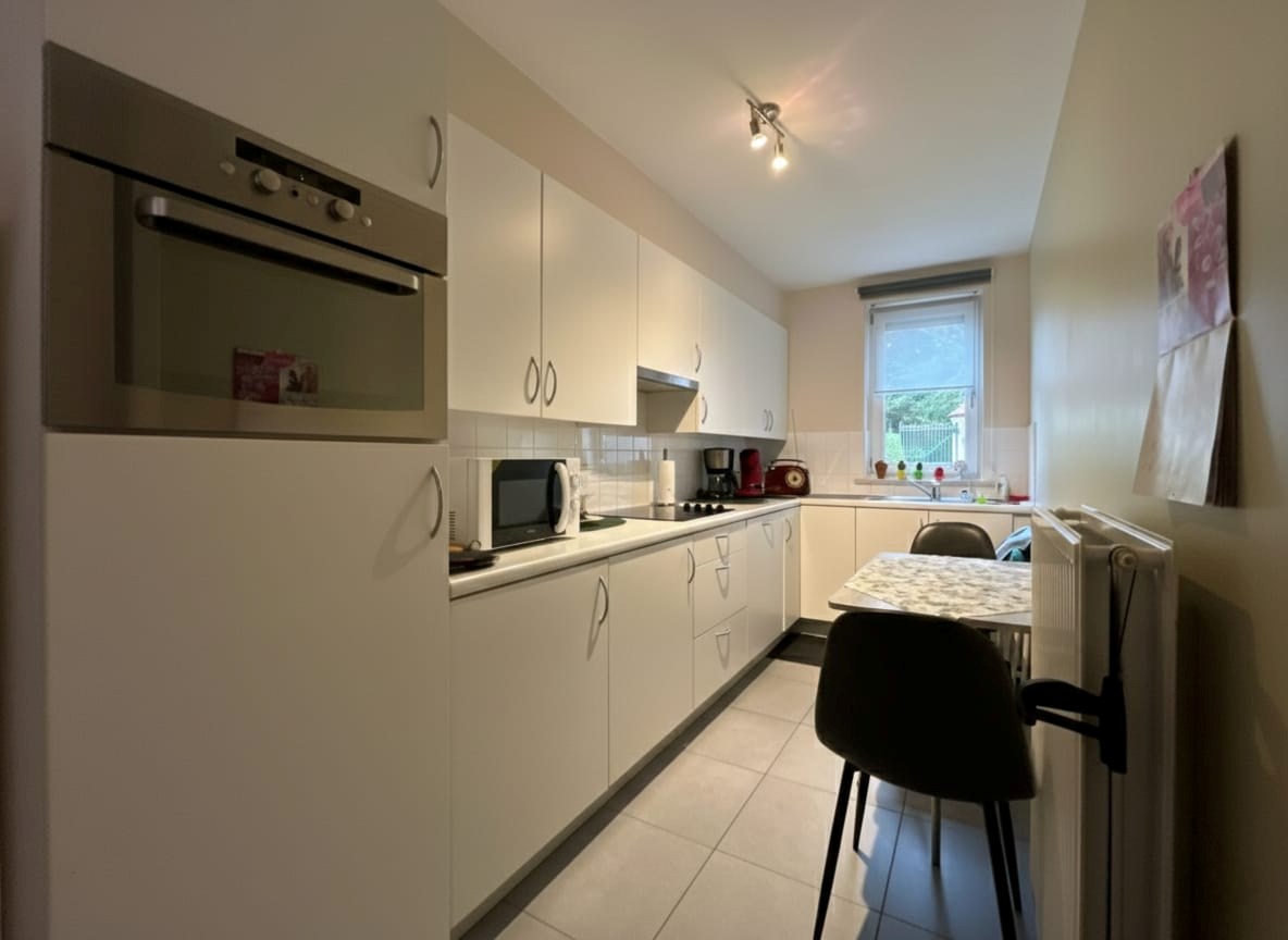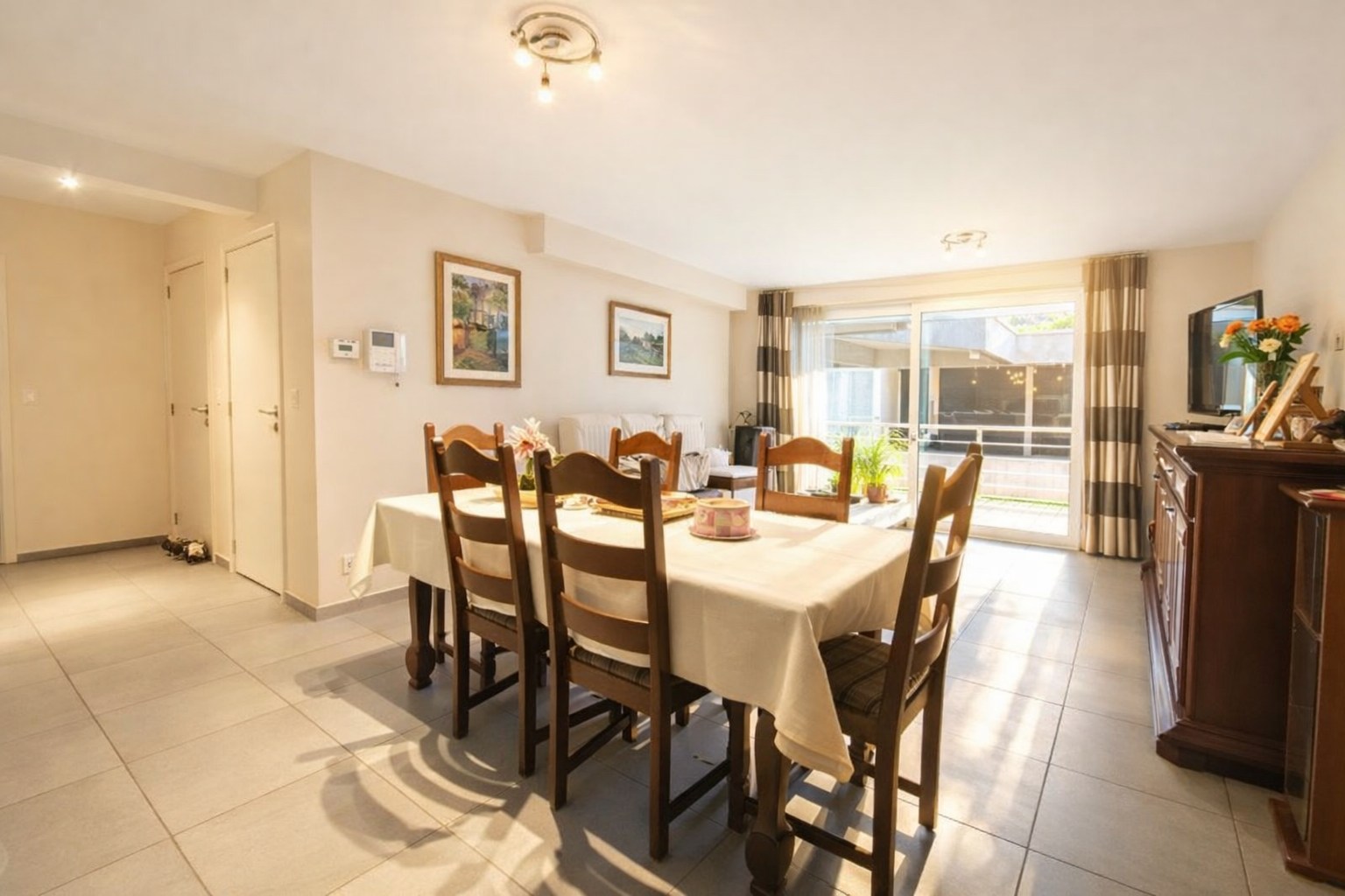 De inkomhal met apart gastentoilet leidt U naar de ruime leefruimte (23 m²) met directe toegang tot het zuidgericht terras (12 m²). Verder is er de open ingerichte keuken 8 m² (kookplaat | dampkap | spoelbak | frigo | oven | vaatwasser).