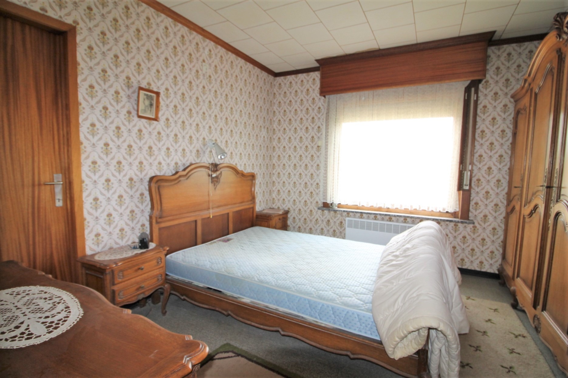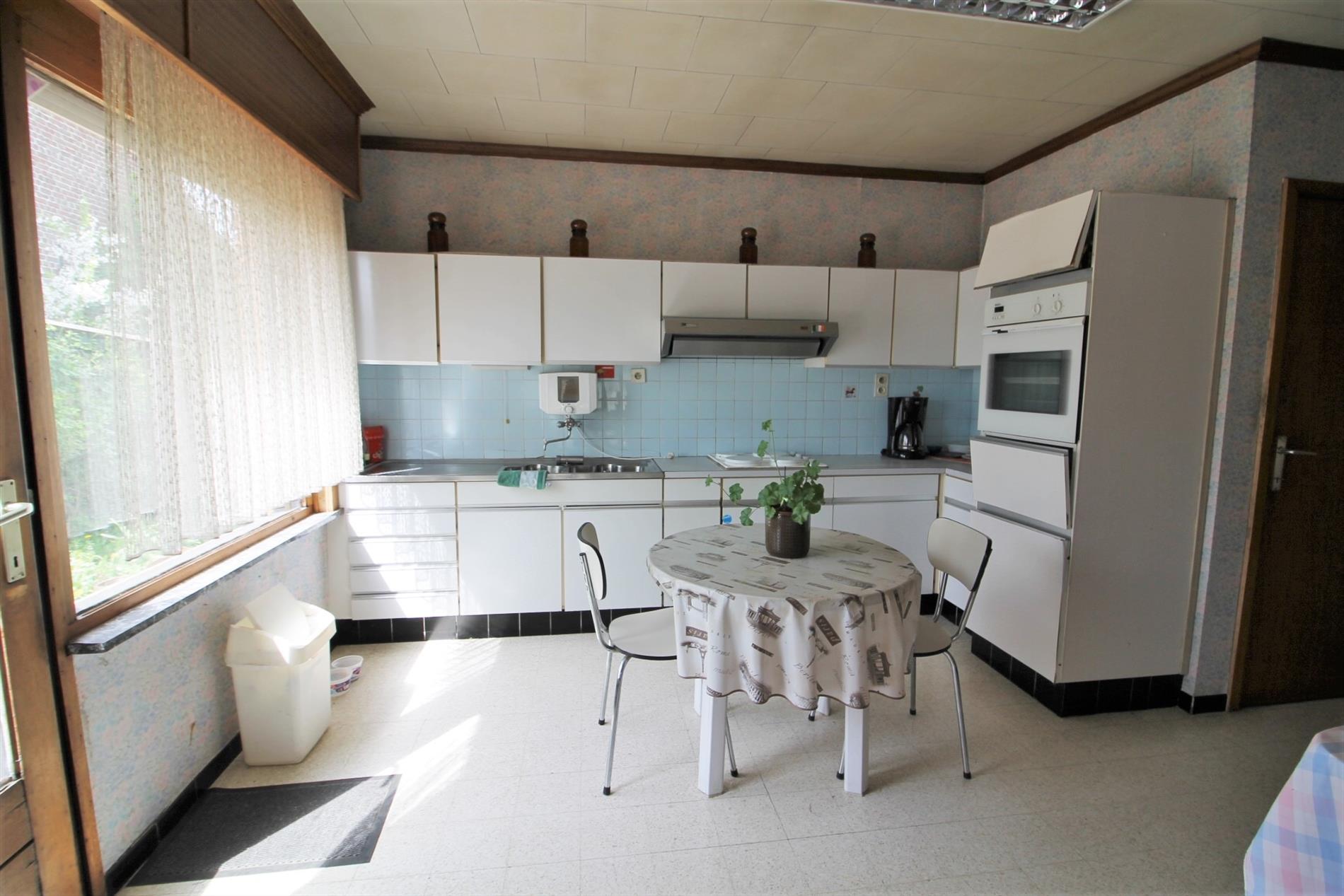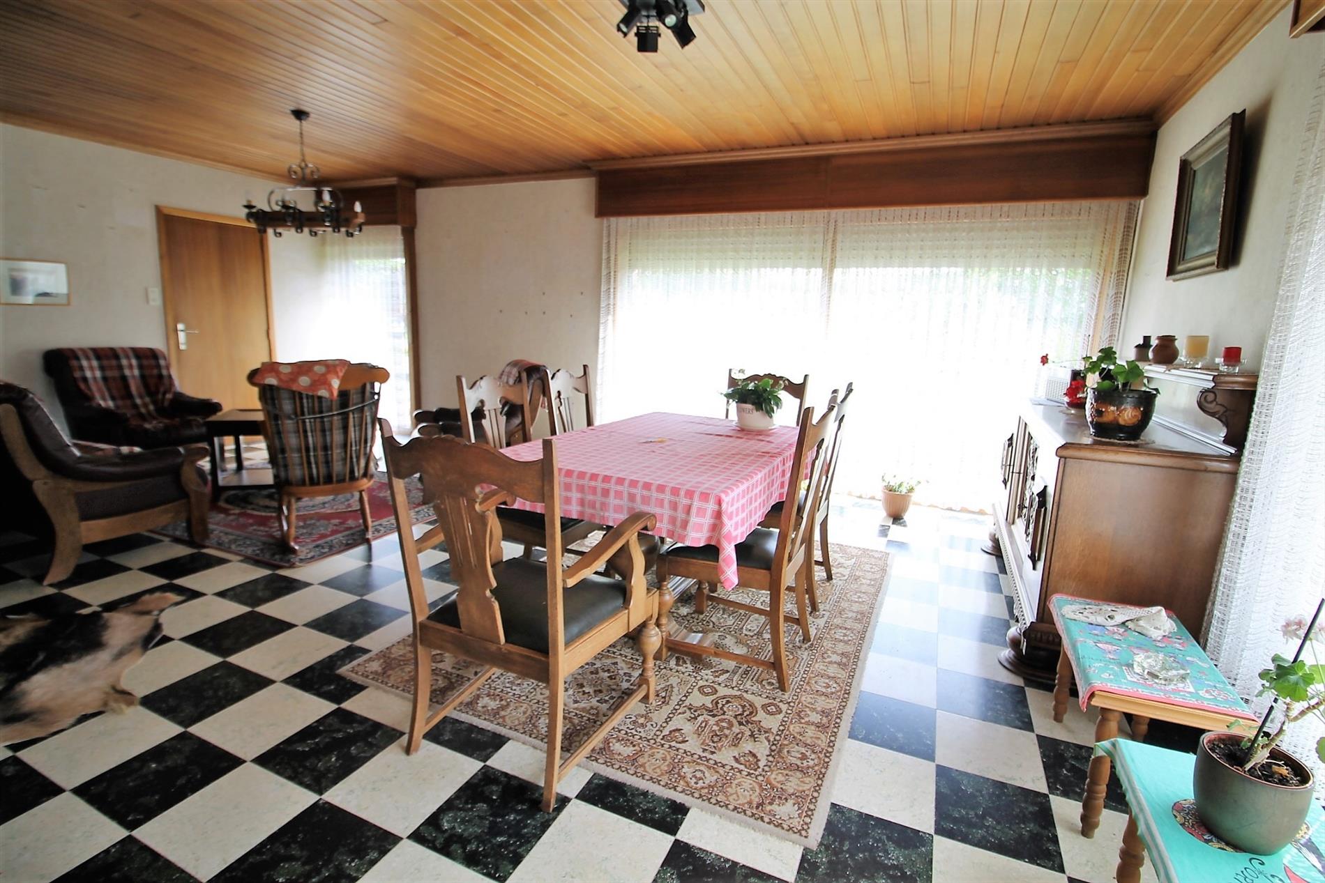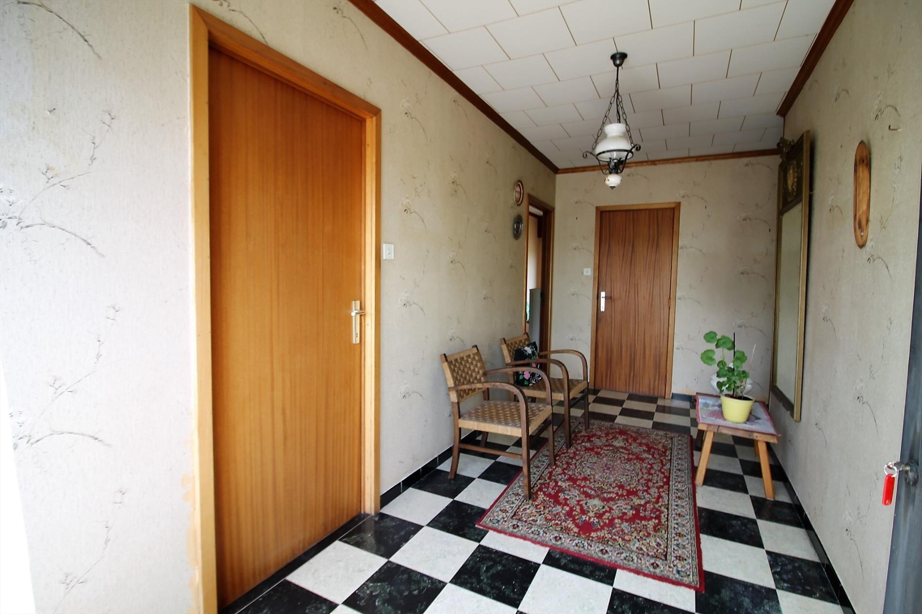 Je komt binnen in de inkomhal met apart gastentoilet. Links hebben we de ruime woonkamer met mazoutkachel. Verder is er de ingerichte keuken met aansluitende berging.