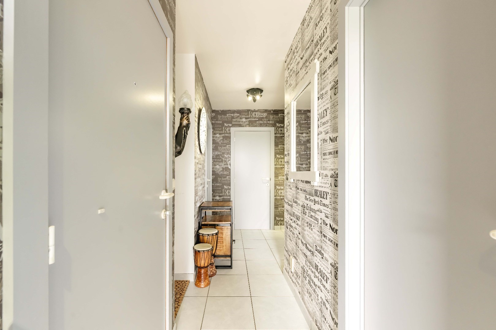 Via de inkomhal is er tevens toegang tot de badkamer (ligbad/douche | dubbele lavabo met meubel), alsook een eerste slaapkamer (11,40 m²) en een directe toegang tot het ruime terras van 46 m². Op dit terras heb je prachtige zichten over het landelijke Kanegem.