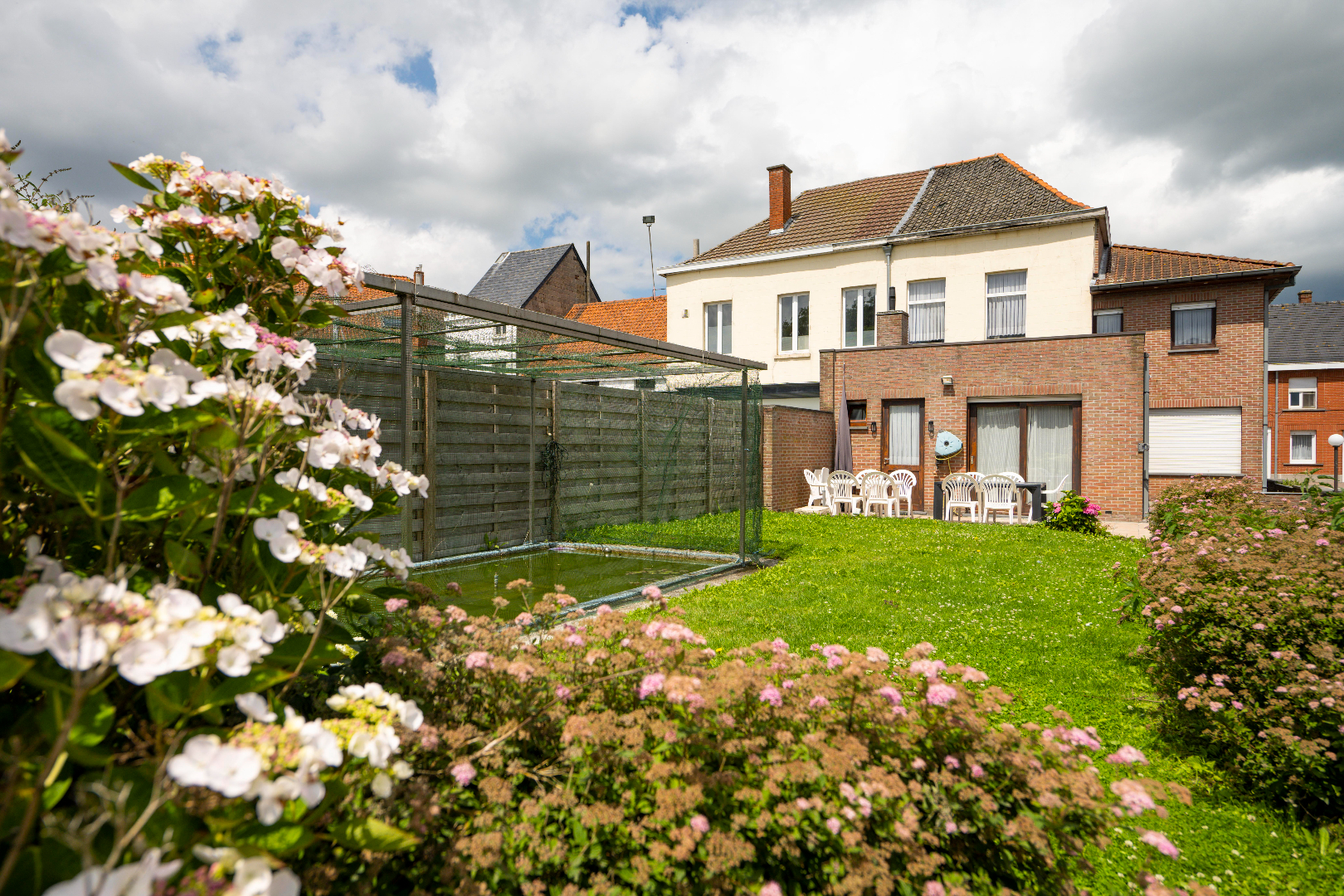 EXTERIEUR: U dient de eigendom nog af te palen. Links van de woning is een oprit met recht van doorgang. Daardoor kan U indien U wenst nog een parkeerplaats of garage achteraan het perceel voorzien. Op heden verhuurd voor 550€/mnd.