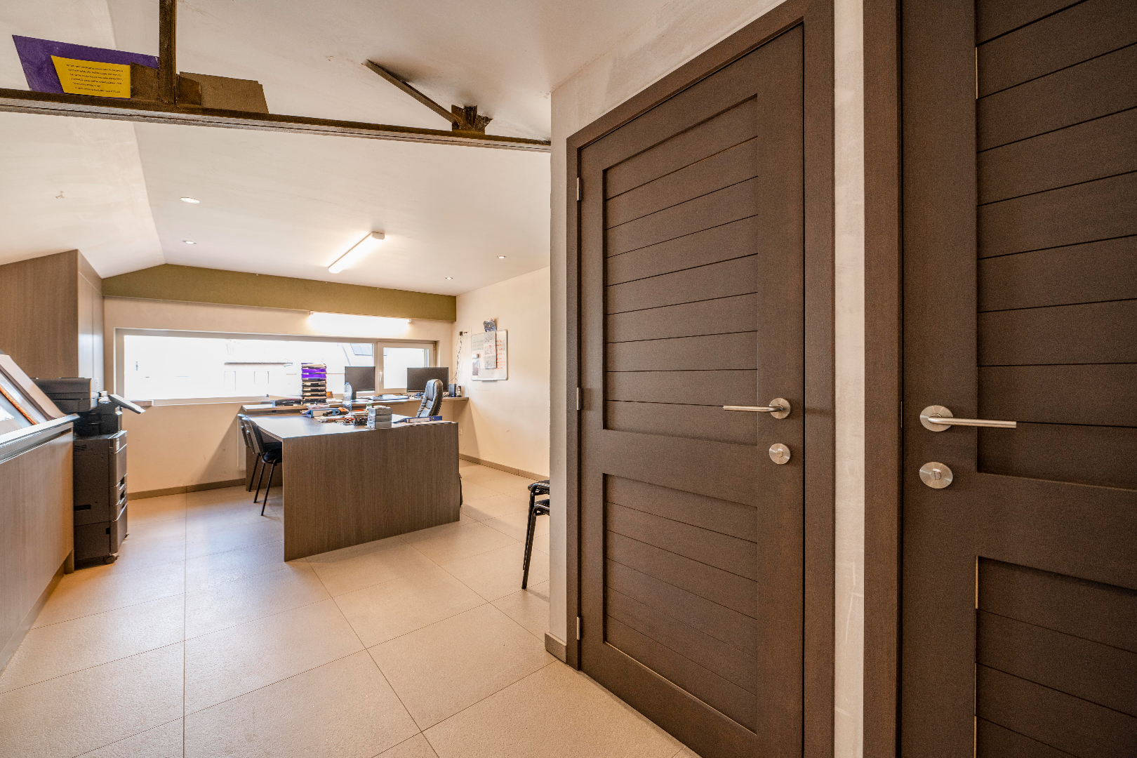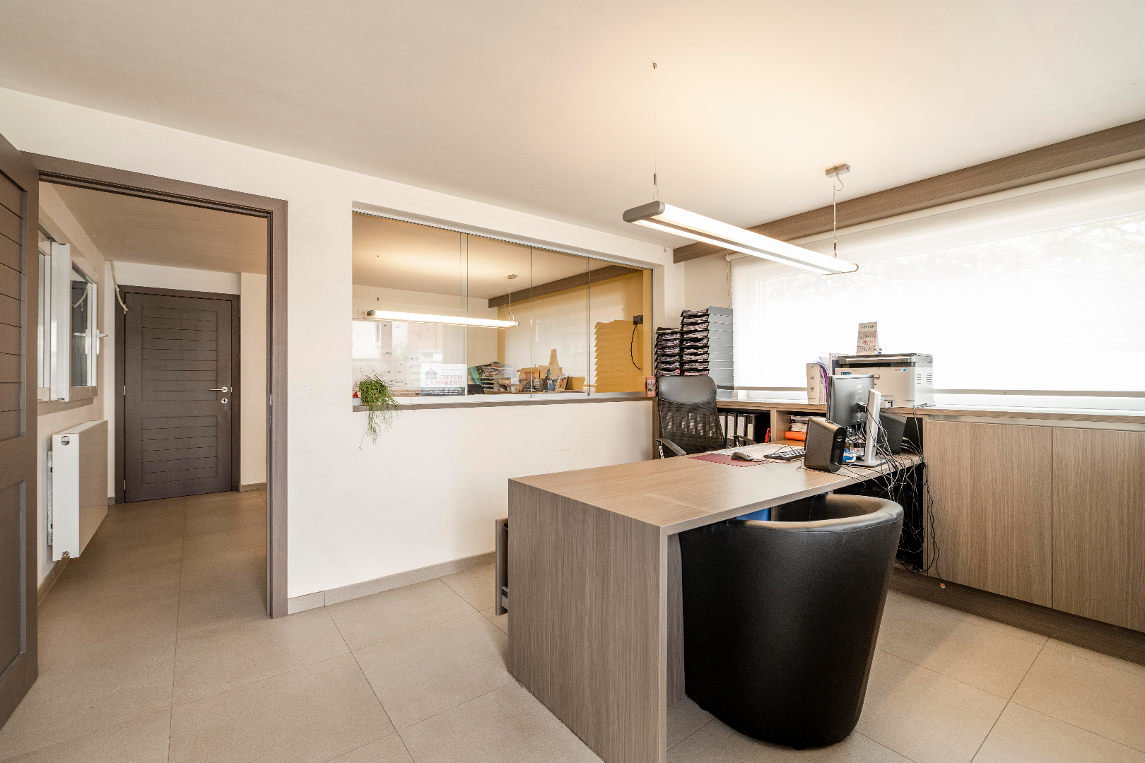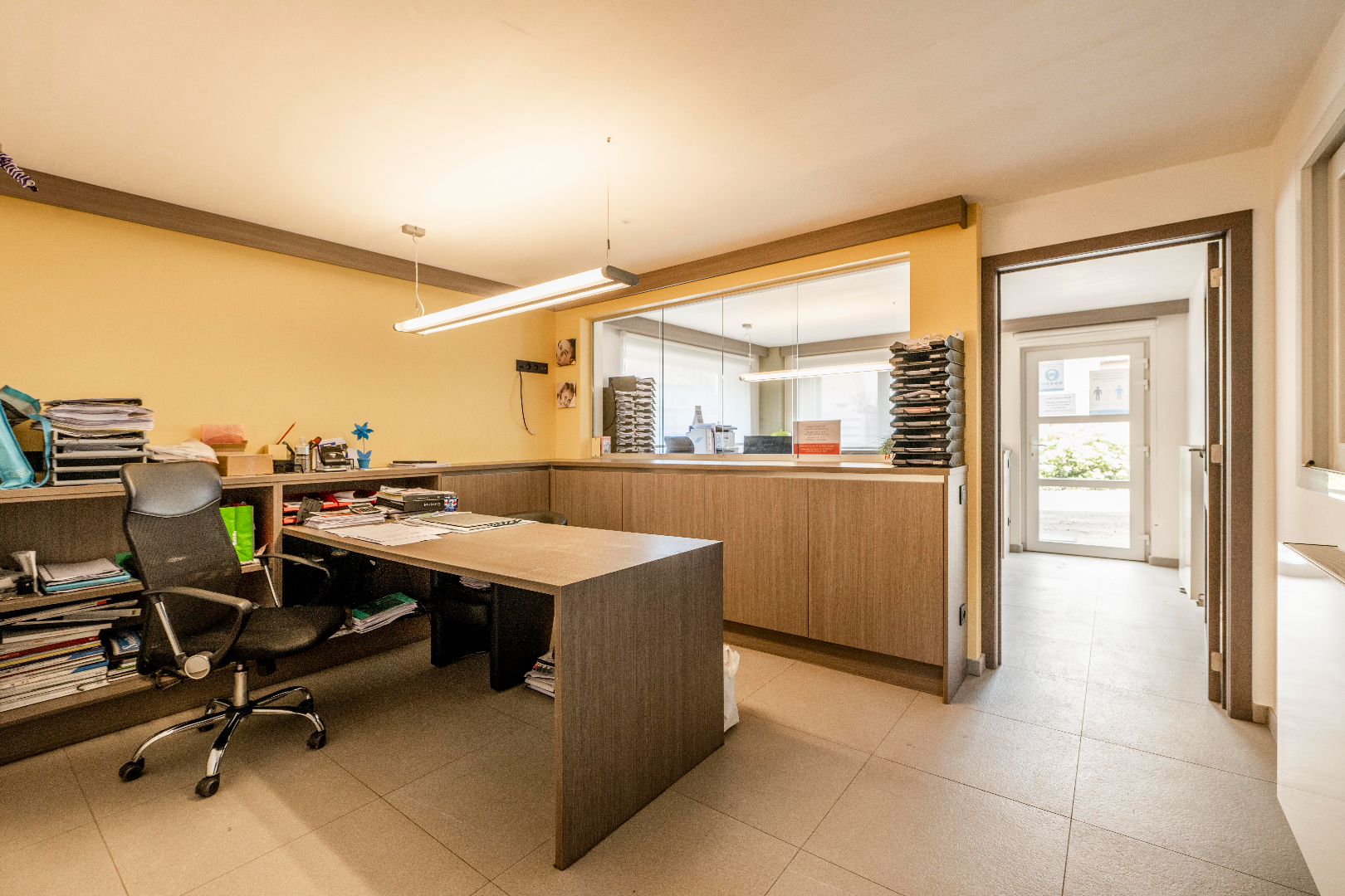 De burelen zijn enkele jaren geleden VOLLEDIG VERNIEUWD. Deze ruimte omvat een ontvangstruimte, 2 ruime burelen, een keuken, een archiefruimte, een apart toilet en een aparte doucheruimte. Voorzien van alle comfort met centrale verwarming, ingemaakte kastenwanden enz...