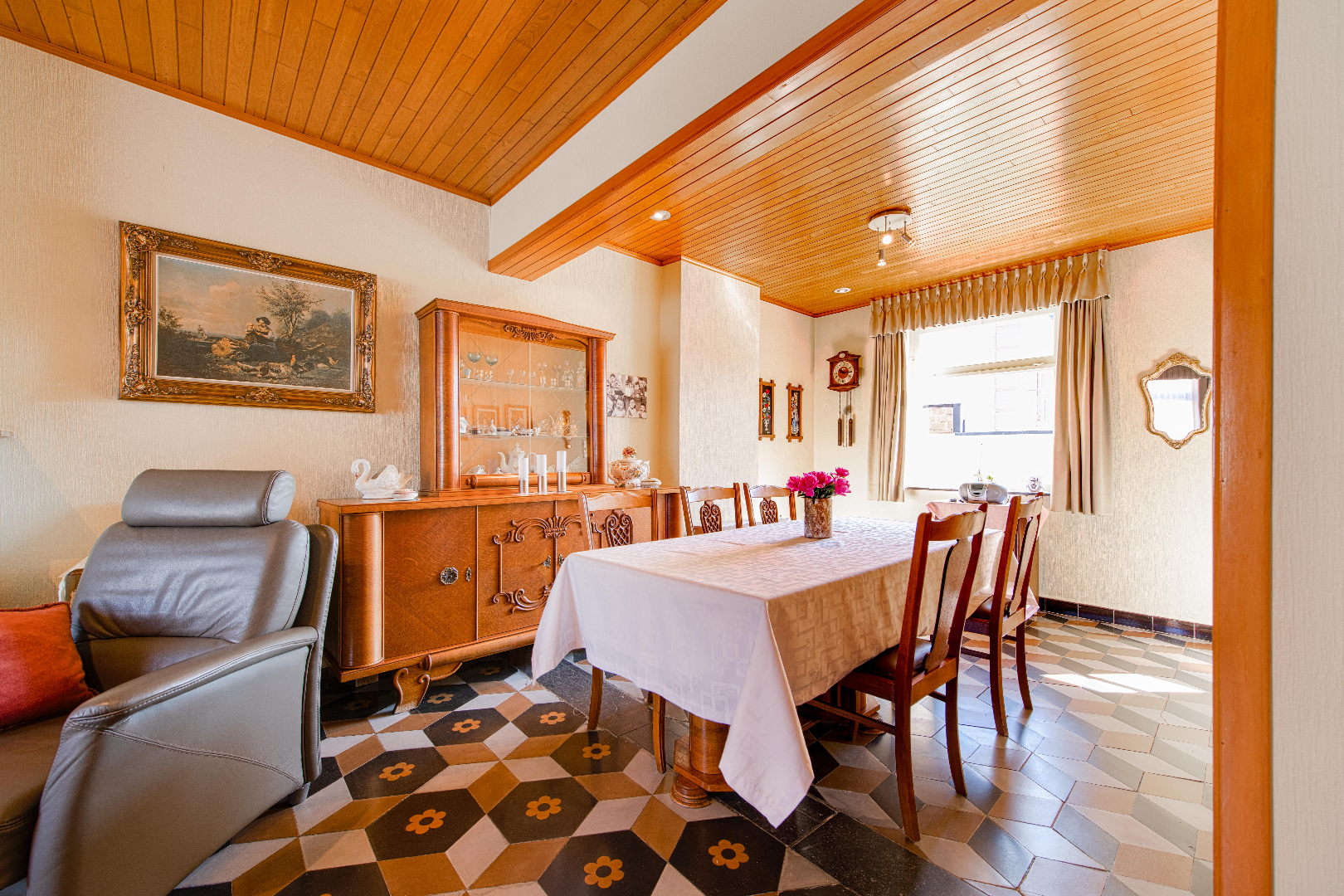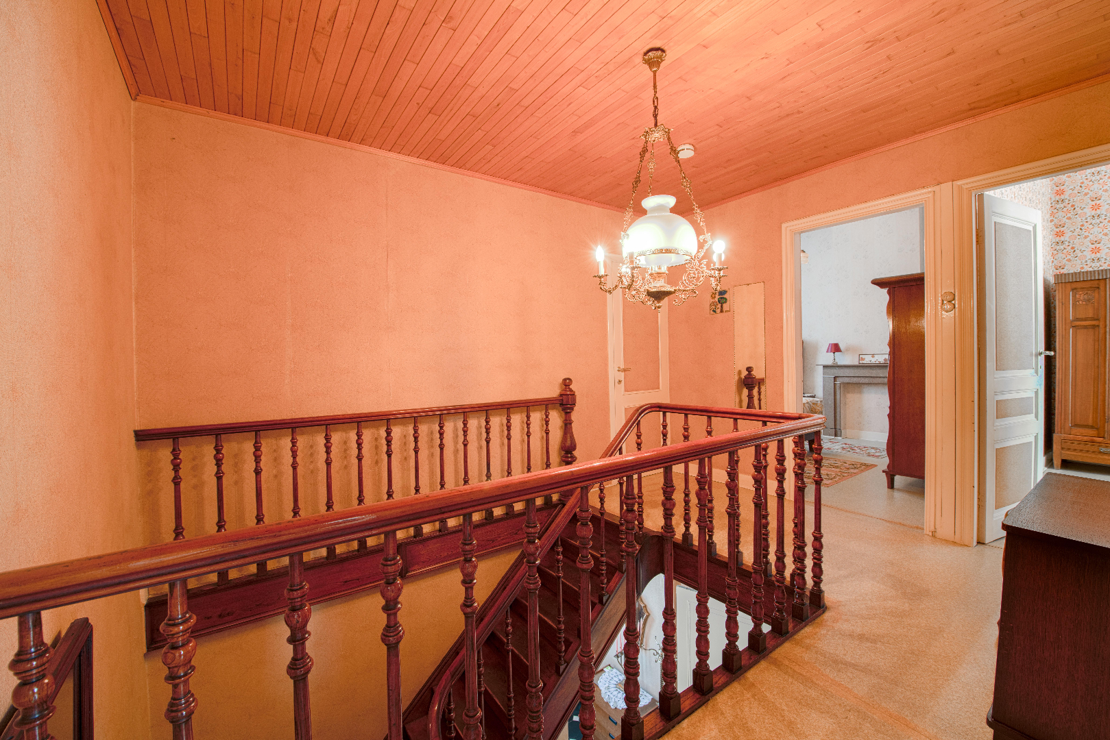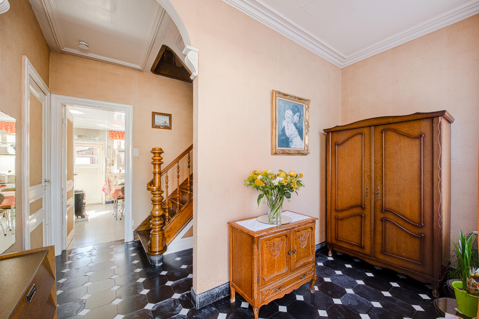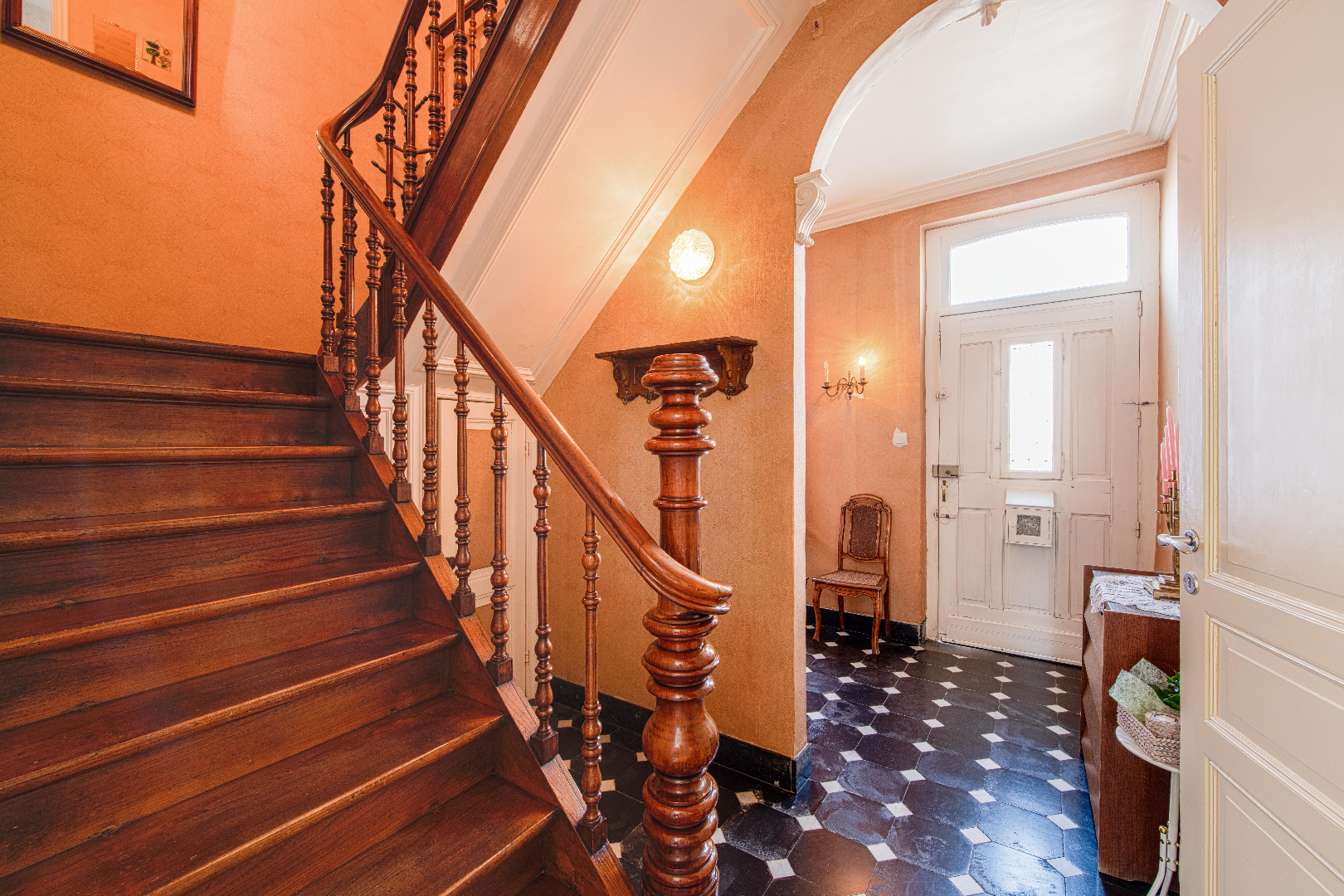 U komt de woning binnen en al meteen overvalt het karakter je. De prachtige inkom (met ingemaakte kastenwand) met hoge plafonds en een magnifieke trap geven onmiddellijk de sfeer weer van deze woonst.