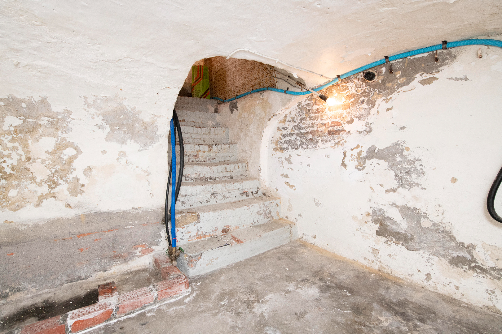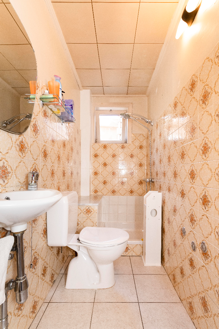 Via de inkom is er toegang tot de ruime leefruimte (zithoek met eetplaats) alsook de keuken. Handig is de aansluitende kelder. Verder op het gelijkvloers is er de badkamer (toilet, lavabo en douche).