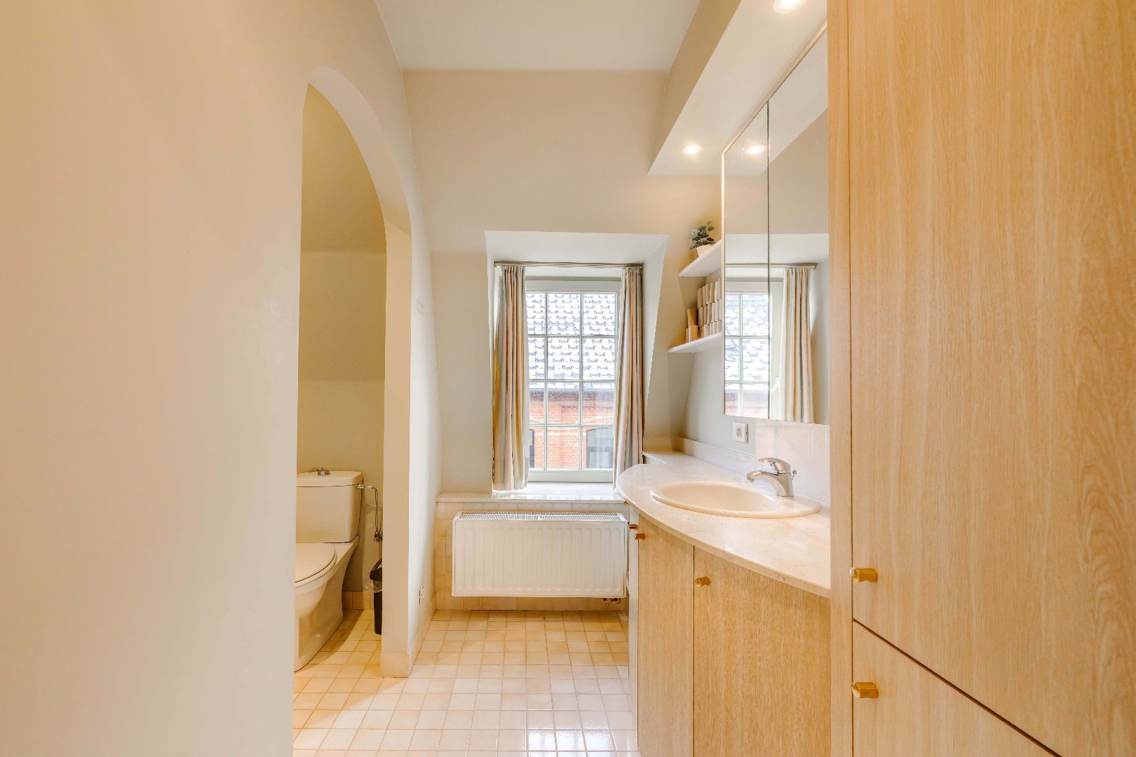 Aansluitend is er de volledig ingerichte open keuken (kookplaat, dampkap, spoelbak, vaatwasser, frigo en oven), met daarnaast een praktische wasplaats voorzien van aansluiting voor wasmachine en droogkast en extra ingebouwde kasten.