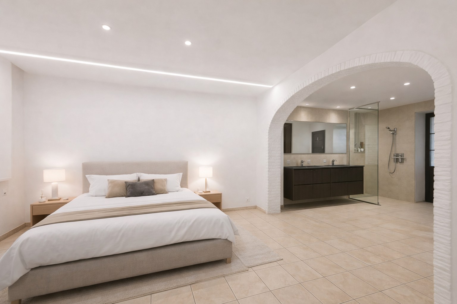 Op het eerste verdiep bevindt zich de masterbedroom en de eerste badkamer, uitgerust met een ligbad, douche, dubbele lavabo met meubel en toilet.