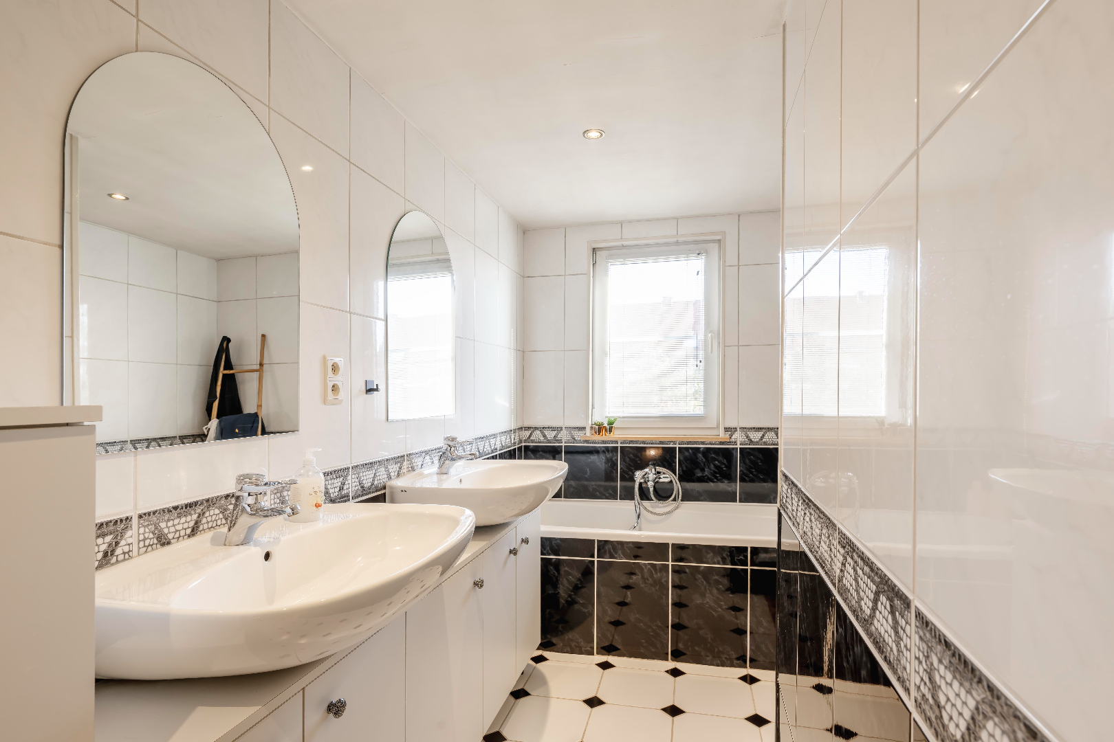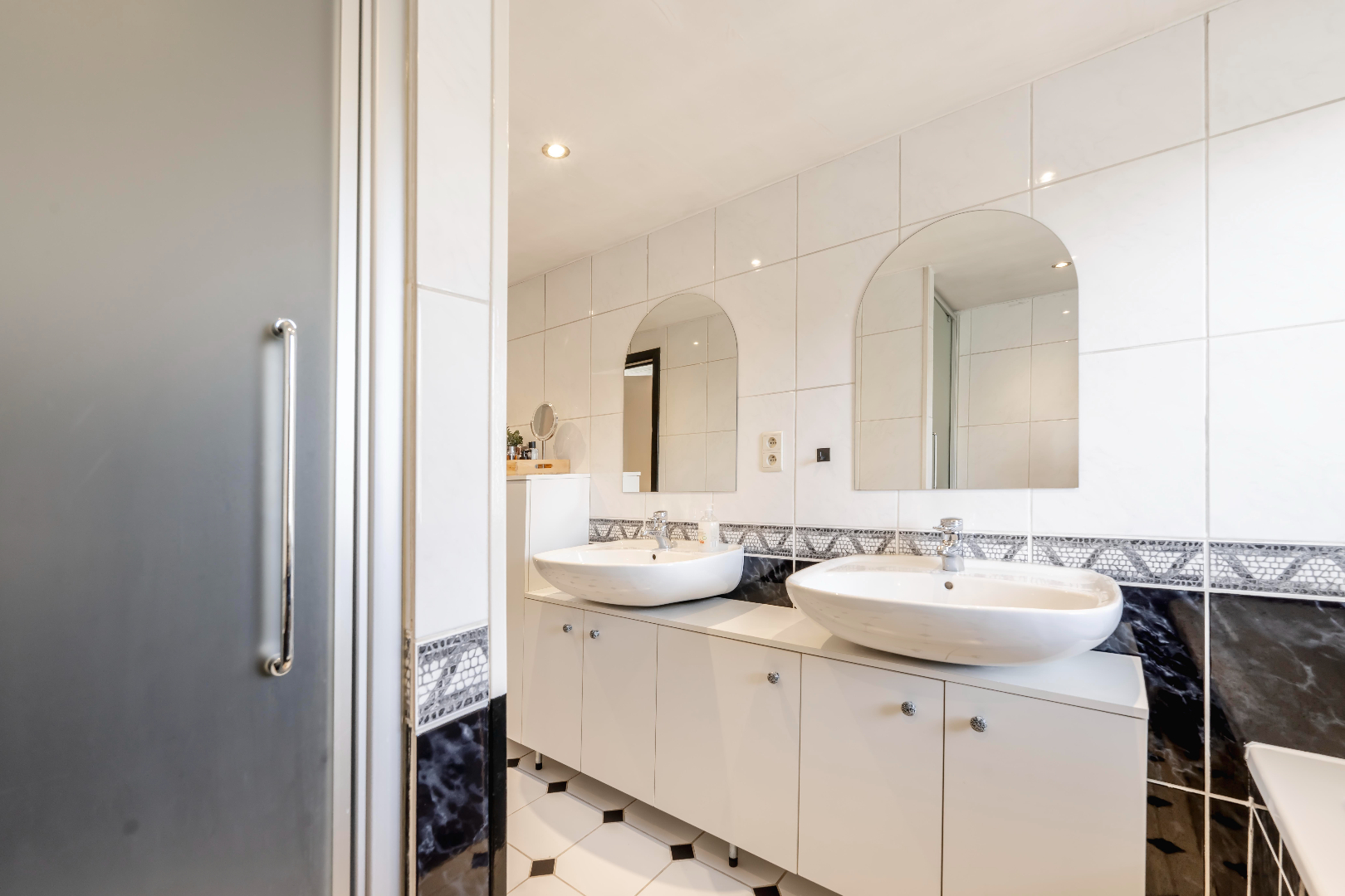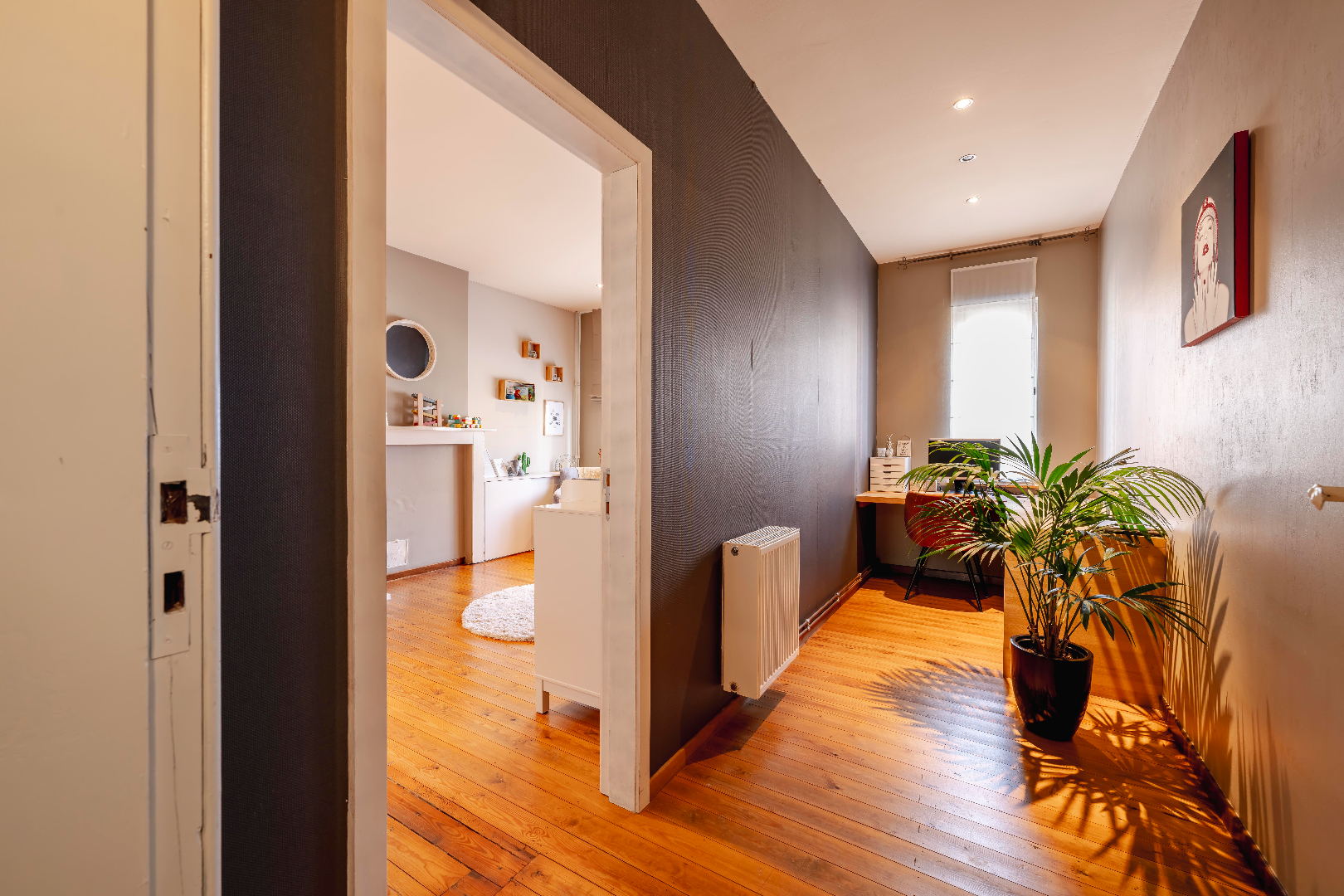Het eerste verdiep is voorzien van een badkamer (dubbele lavabo | ligbad | douche) met apart toilet alsook aansluitend twee ruime slaapkamers (16,50 m² | 16 m²) en een bureel (8 m²).