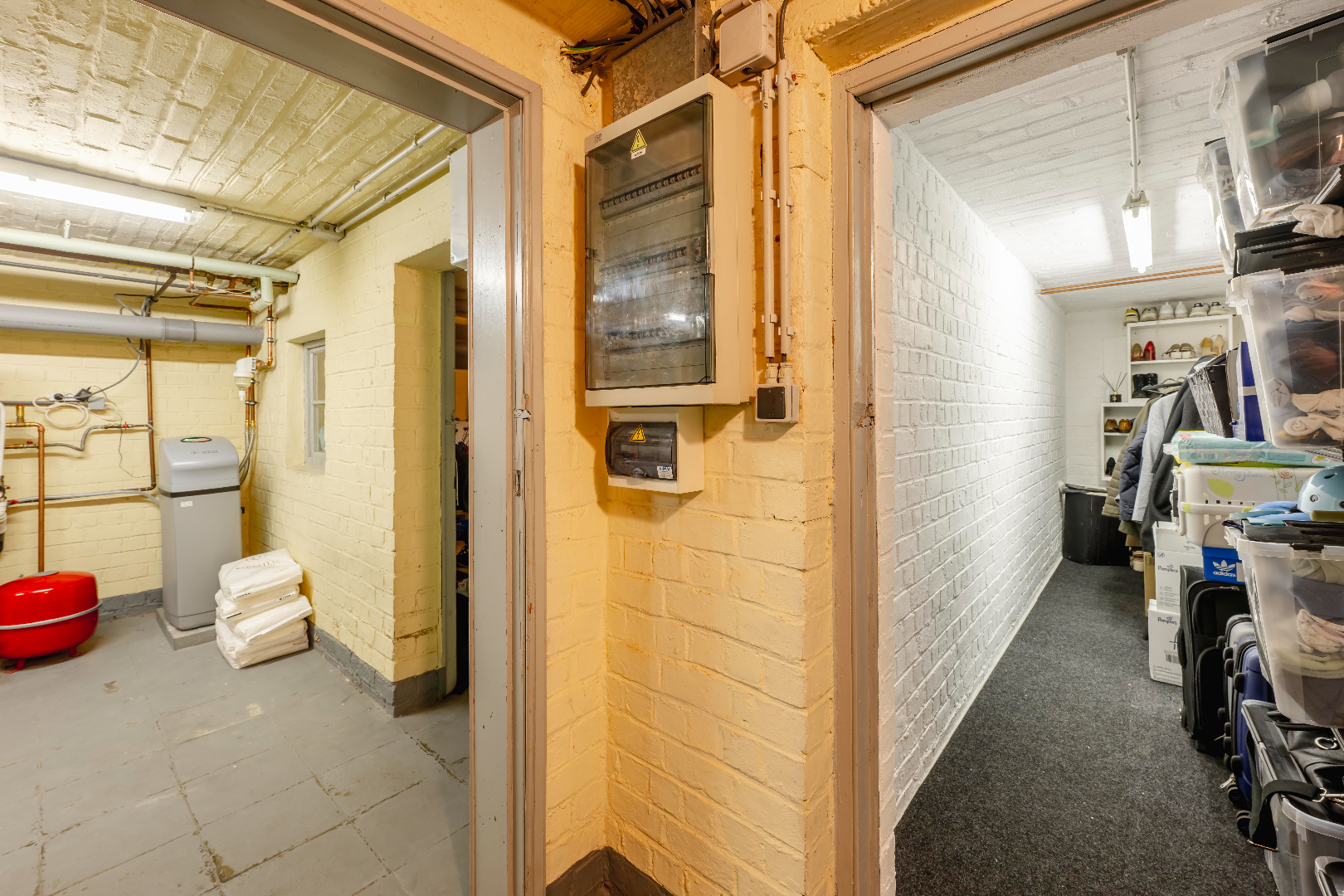 Via de eetkamer is er toegang tot de praktische kelder van maar liefst 92 m² onderverdeeld in verschillende bergingen (stapelplaats, technische berging, wasplaats enz...) dit alles met volle hoogte, alsook directe toegang tot de stadstuin.