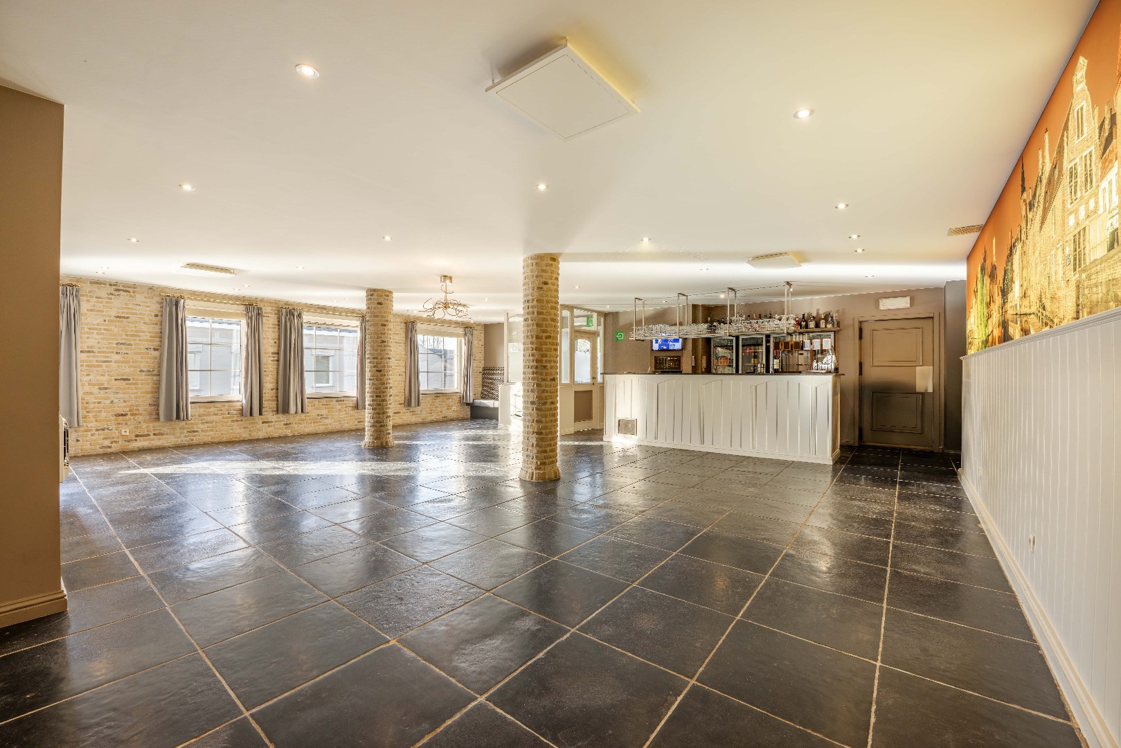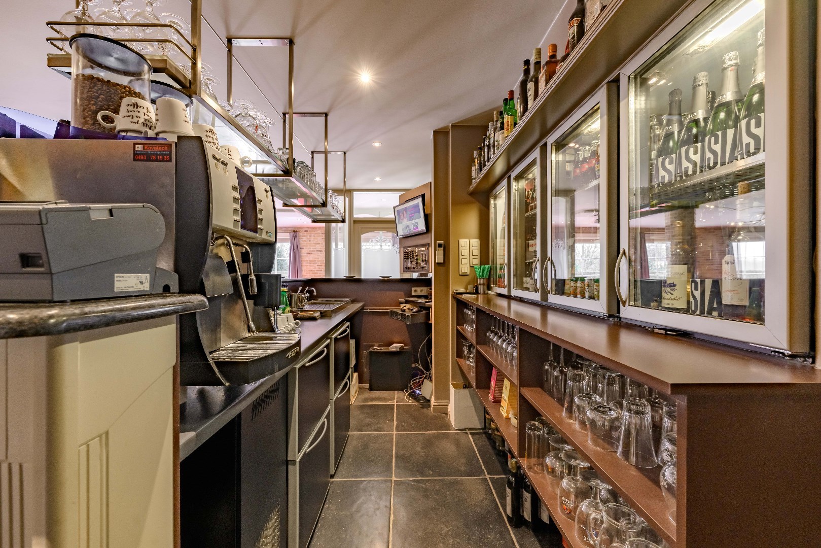 De prachtige bar is volledig ingericht, met handige doorgeeffrigo's en frigolades.
