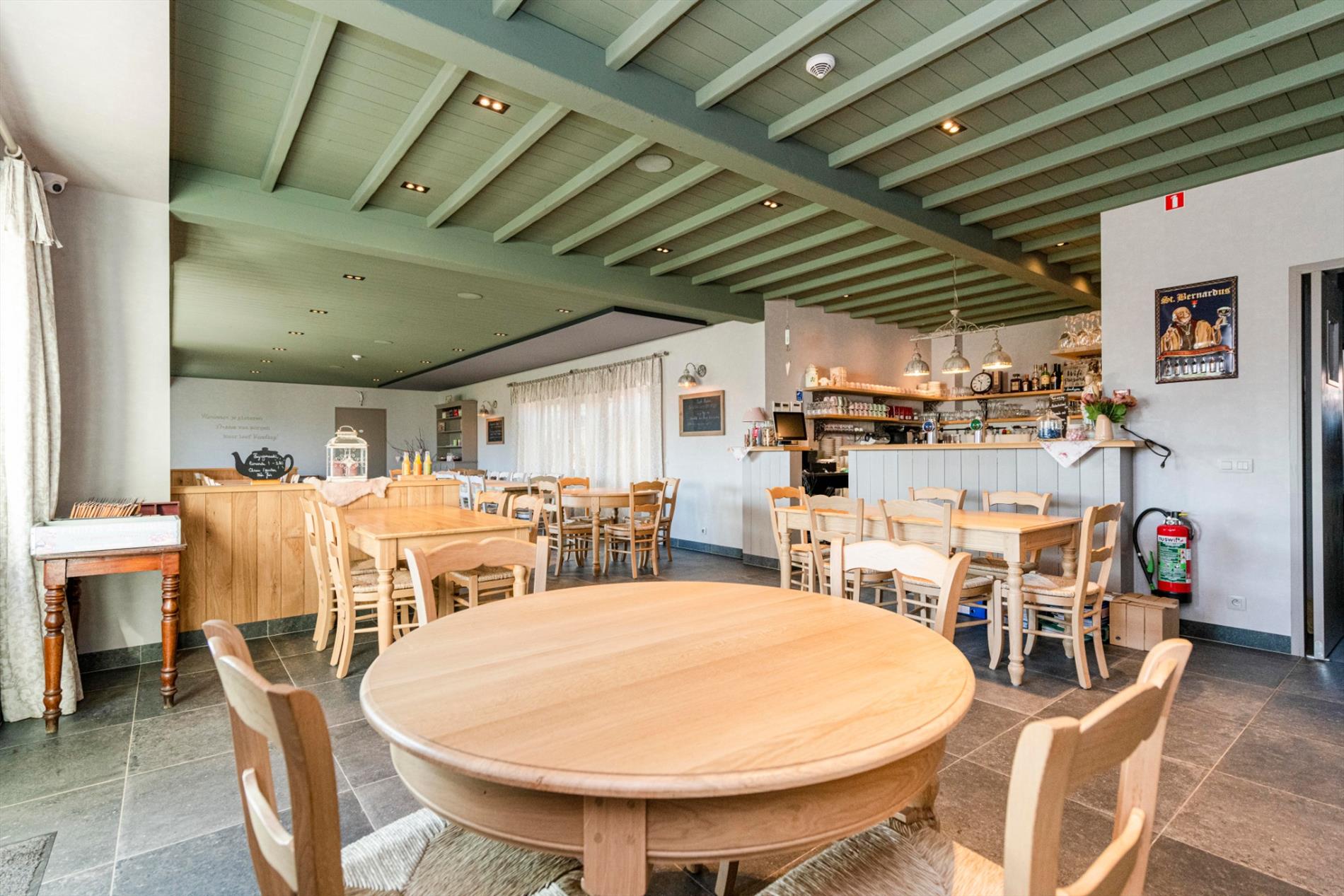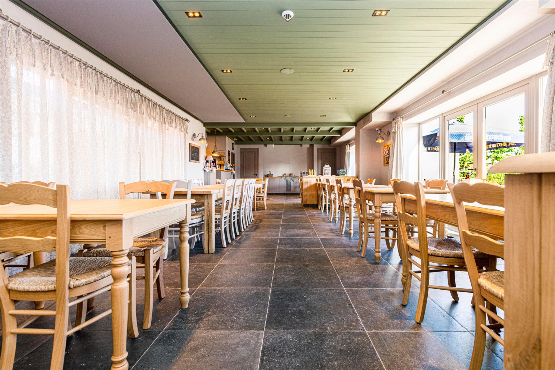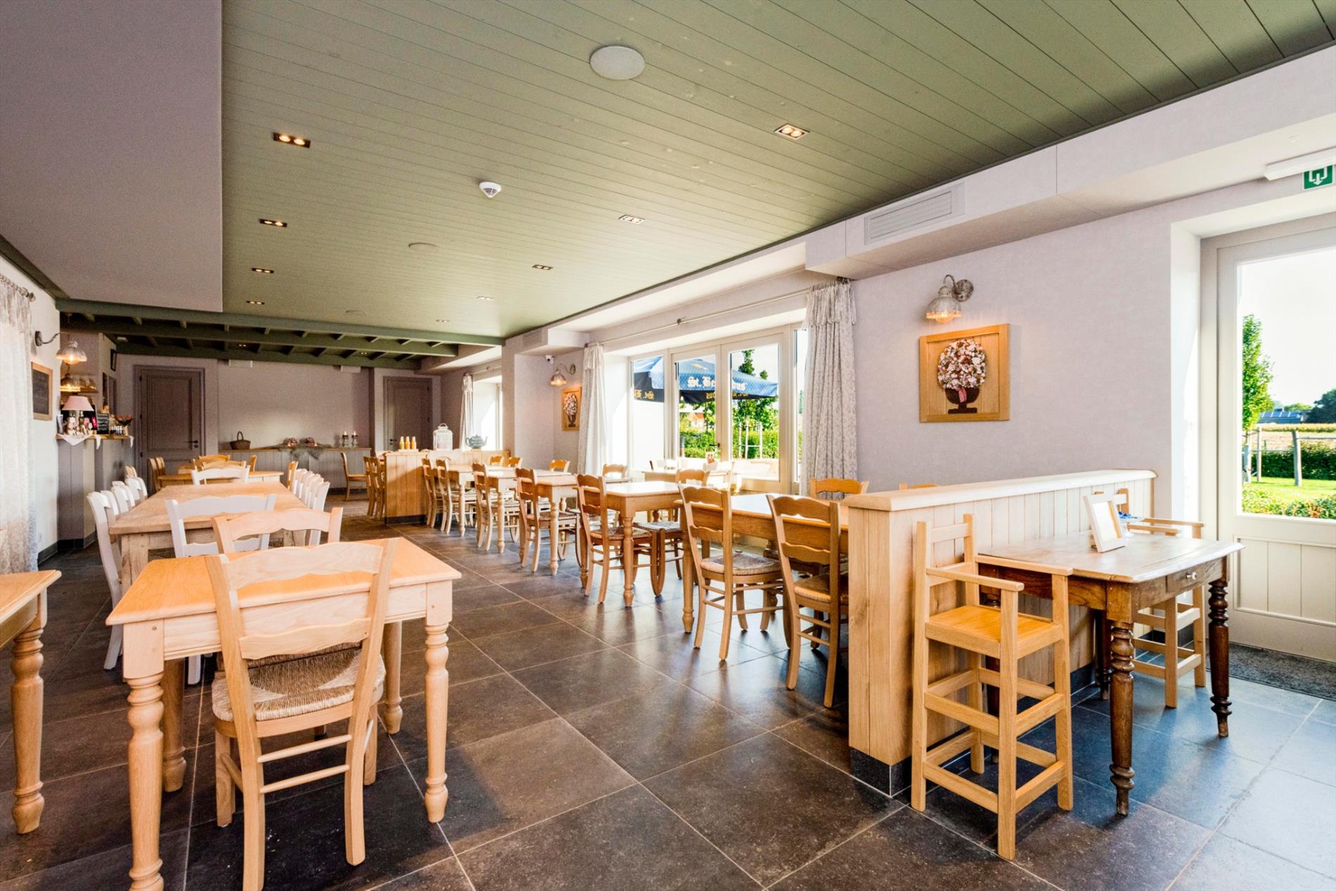 U komt de tearoom binnen via de prachtige eiken deuren waarbij U onmiddellijk in de open ruimte met op heden 46 zitplaatsen (80 m²) komt. De hoogwaardige kwalitatieve afwerking valt U meteen op! Centraal is de open volledig ingerichte bar (12 m²). Vanuit de zaal is er toegang tot het ruime aangelegde terras.