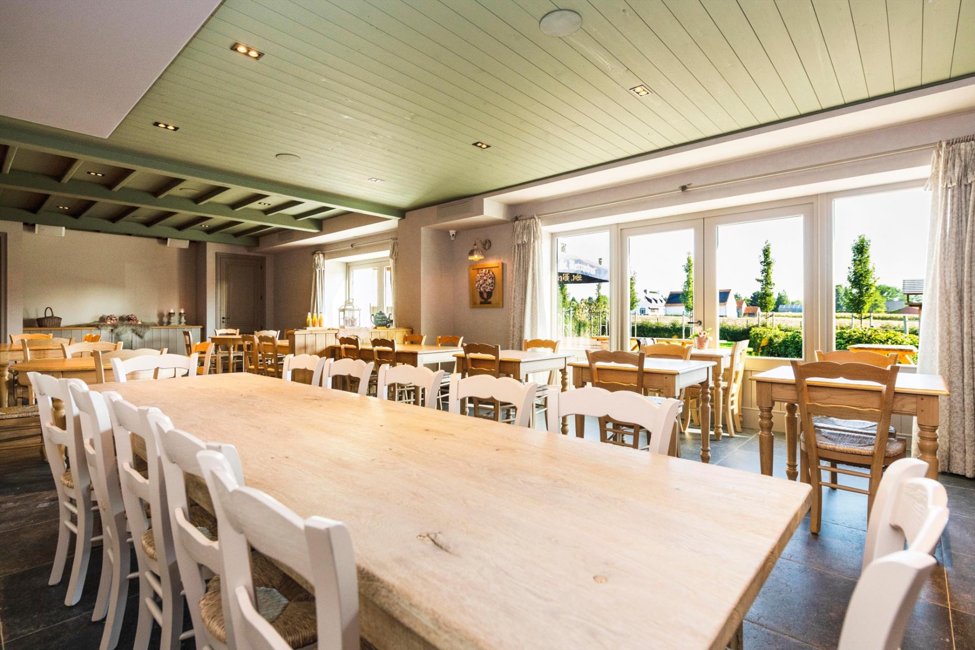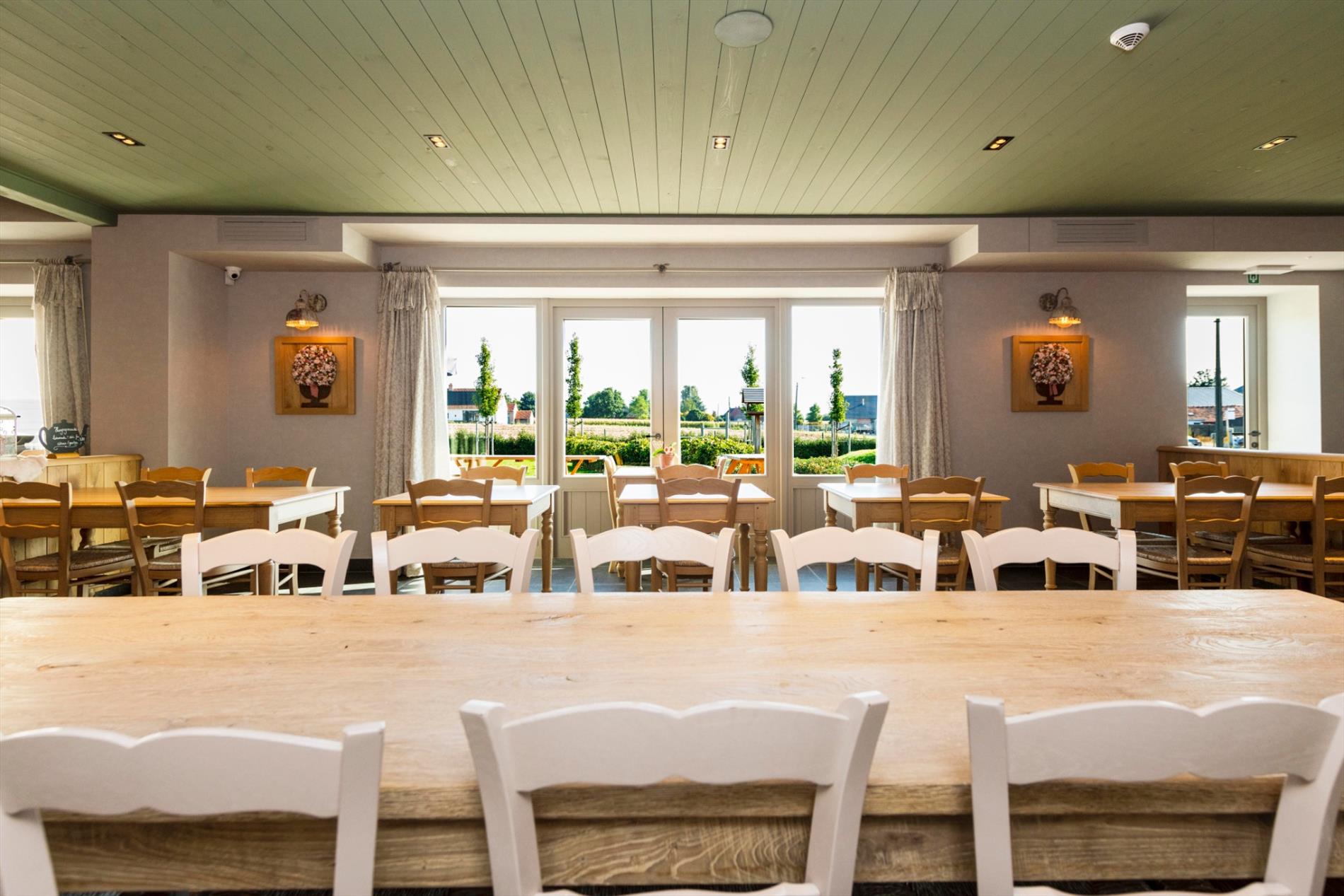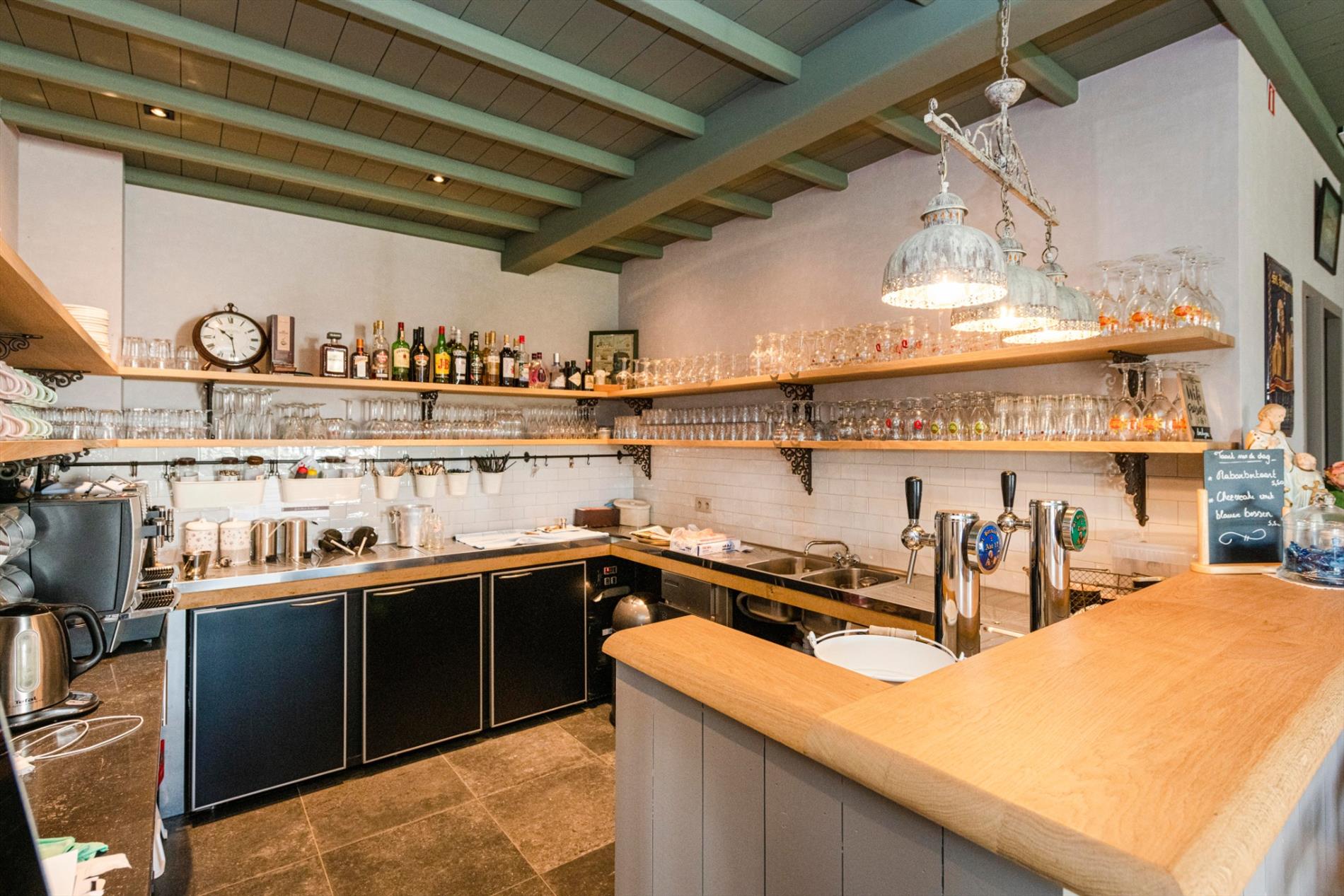 U komt de tearoom binnen via de prachtige eiken deuren waarbij U onmiddellijk in de open ruimte met op heden 46 zitplaatsen (80 m²) komt. De hoogwaardige kwalitatieve afwerking valt U meteen op! Centraal is de open volledig ingerichte bar (12 m²). Vanuit de zaal is er toegang tot het ruime aangelegde terras.