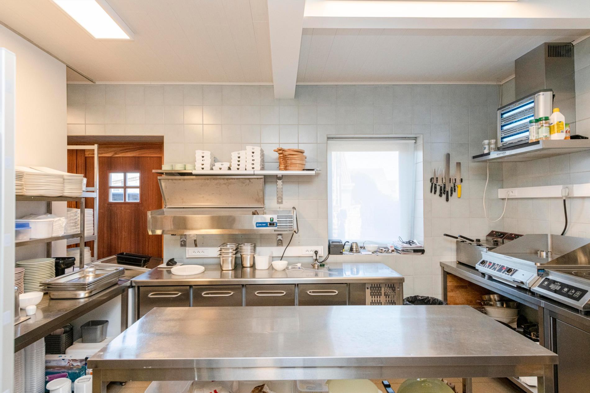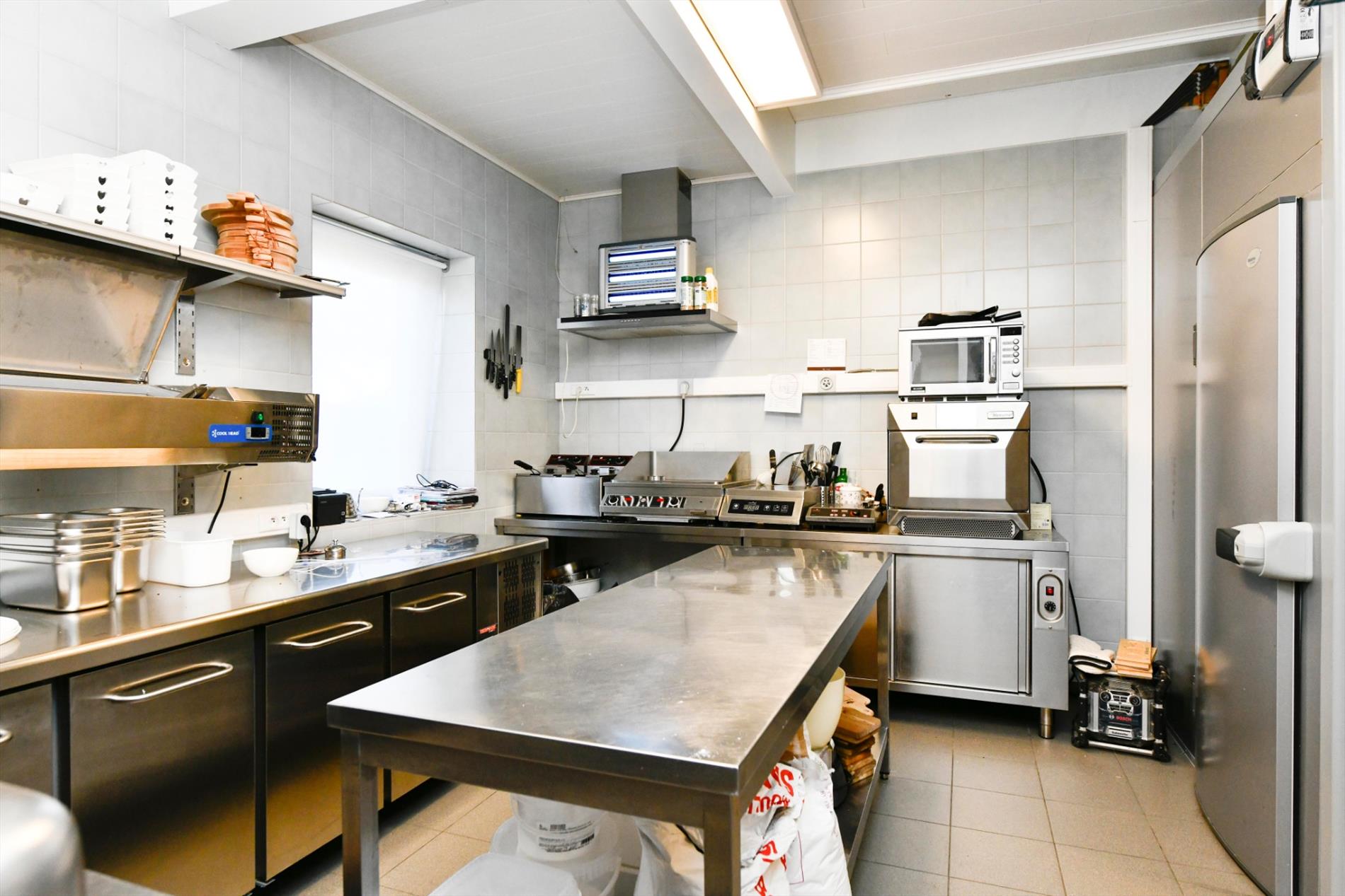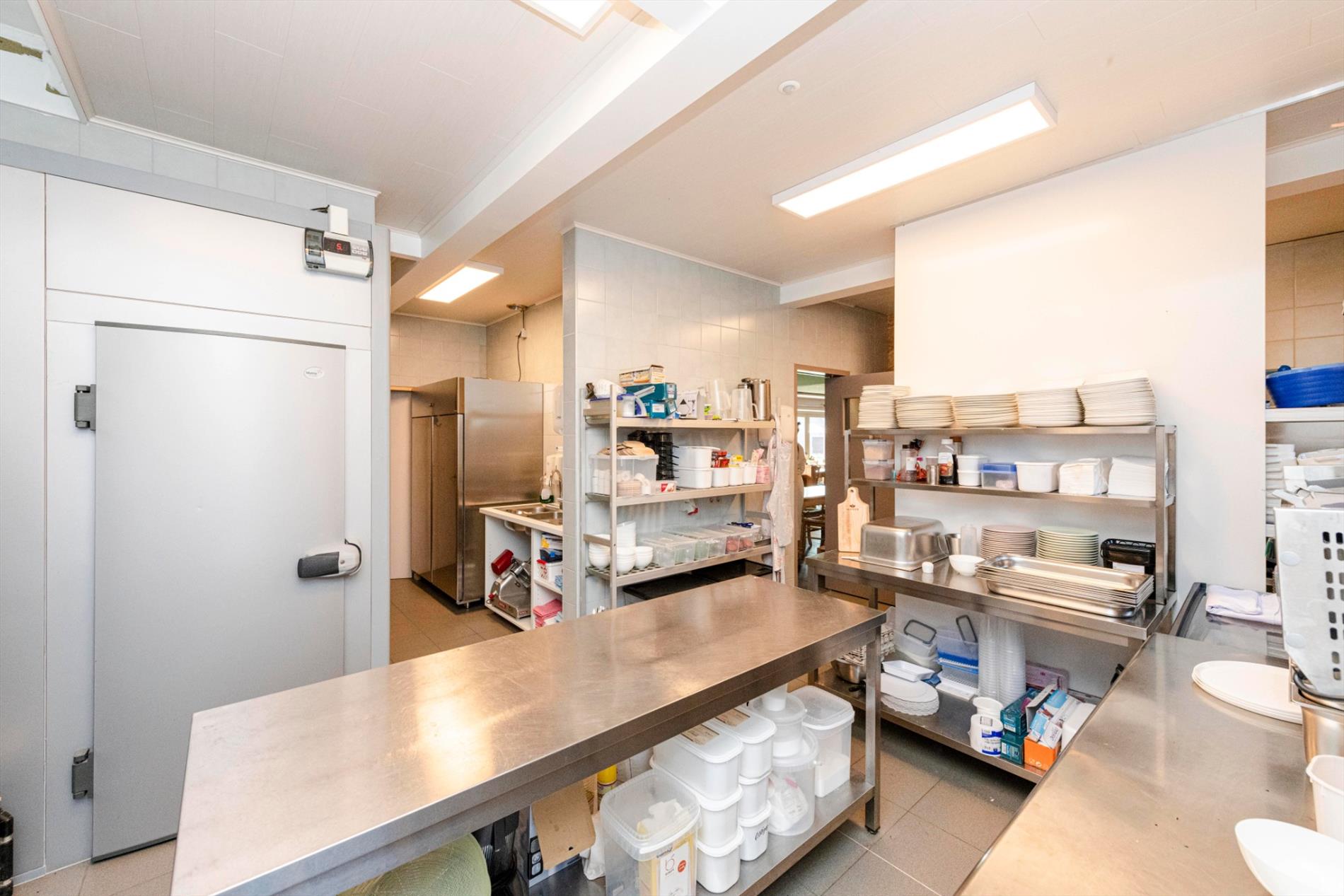 De keuken omvat een afwasgedeelte, werkgedeelte en sanitair gedeelte. Aanwezigheid van alle toestellen, koelcel, diepvriescel enz..