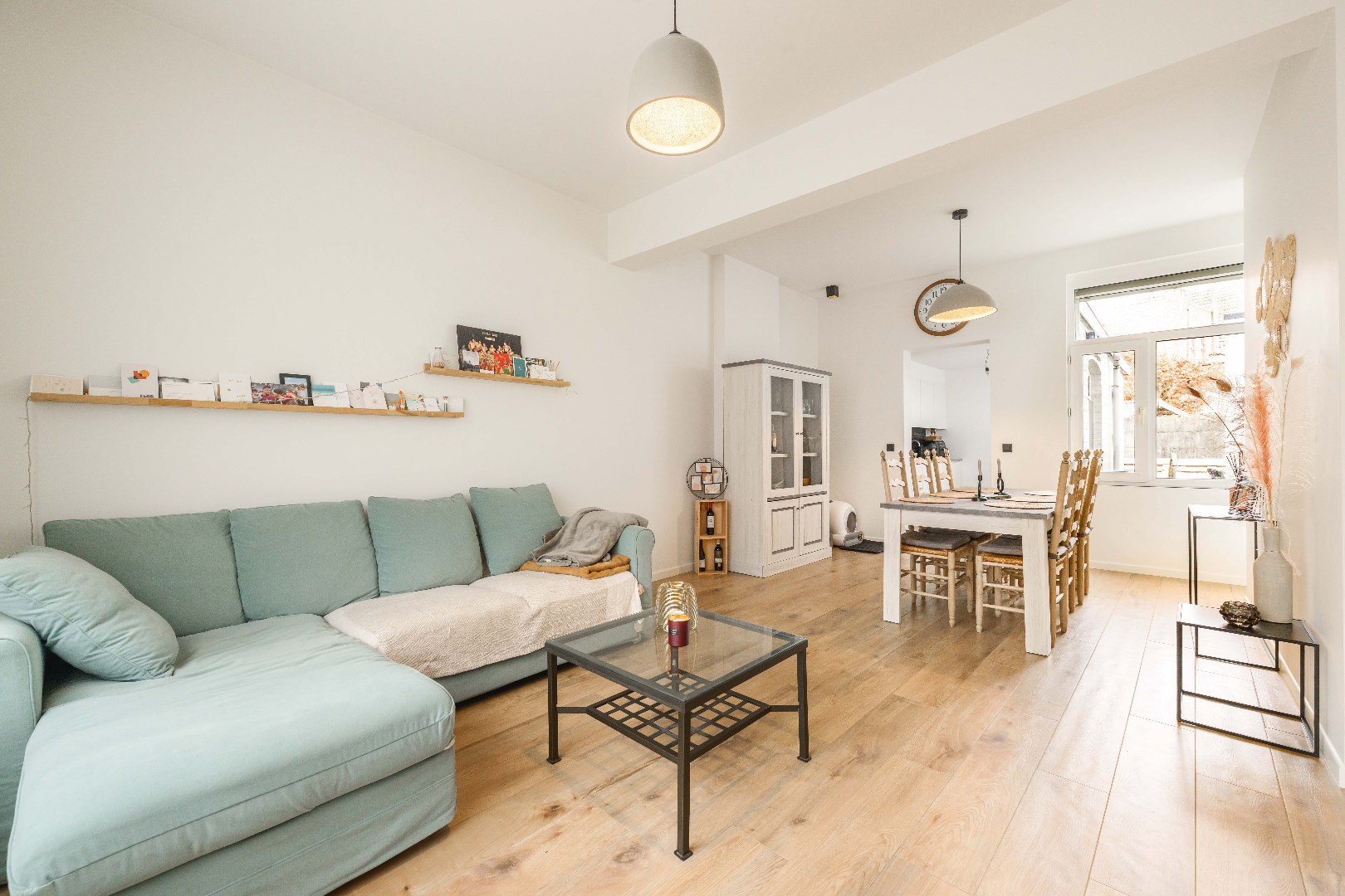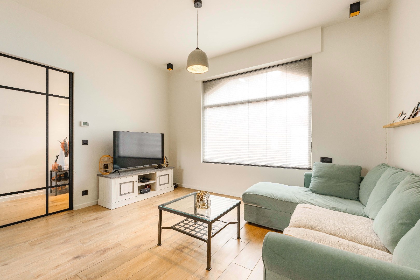 Bij binnenkomst komt u in hall met praktische bergruimte. Via de stalen deur is er directe toegang tot de lichtrijke en ruime woonkamer met zowel zit- als eethoek. Vervolgens is er de volledig uitgeruste keuken (kookplaat, dampkap, spoelbak, frigo, vaatwasser en oven).