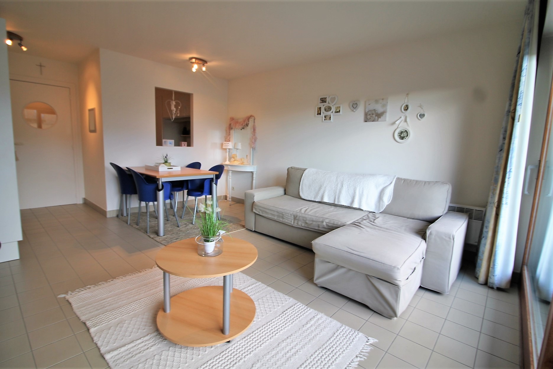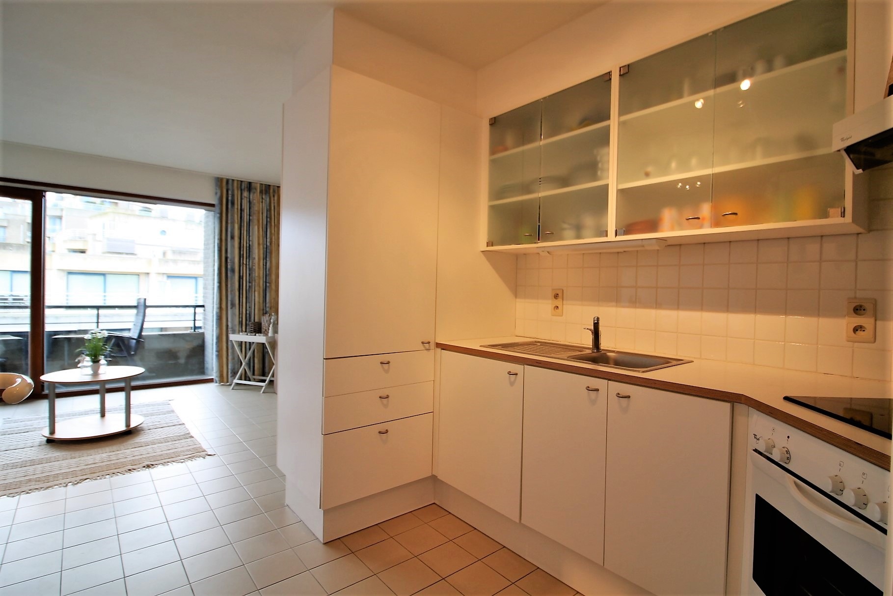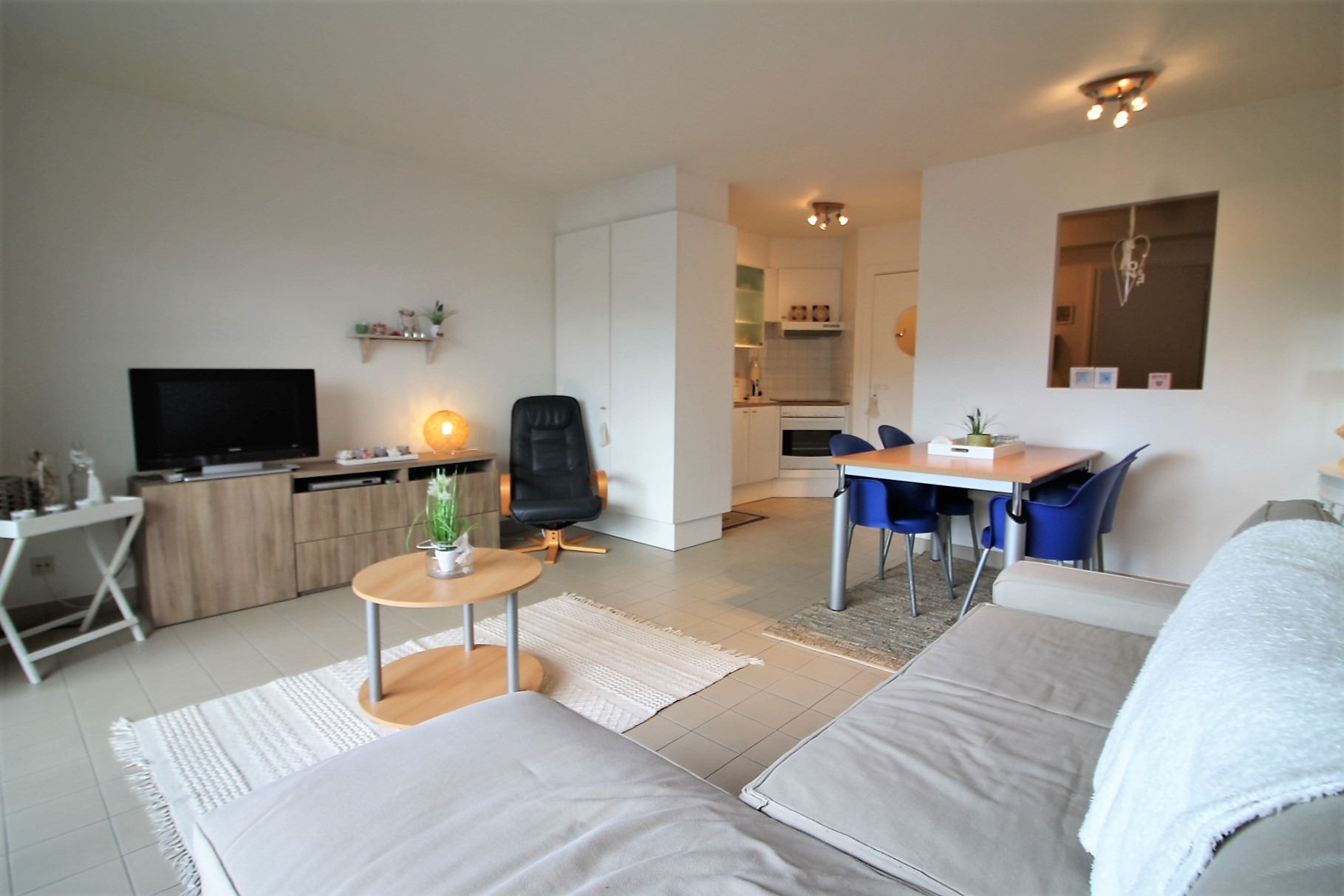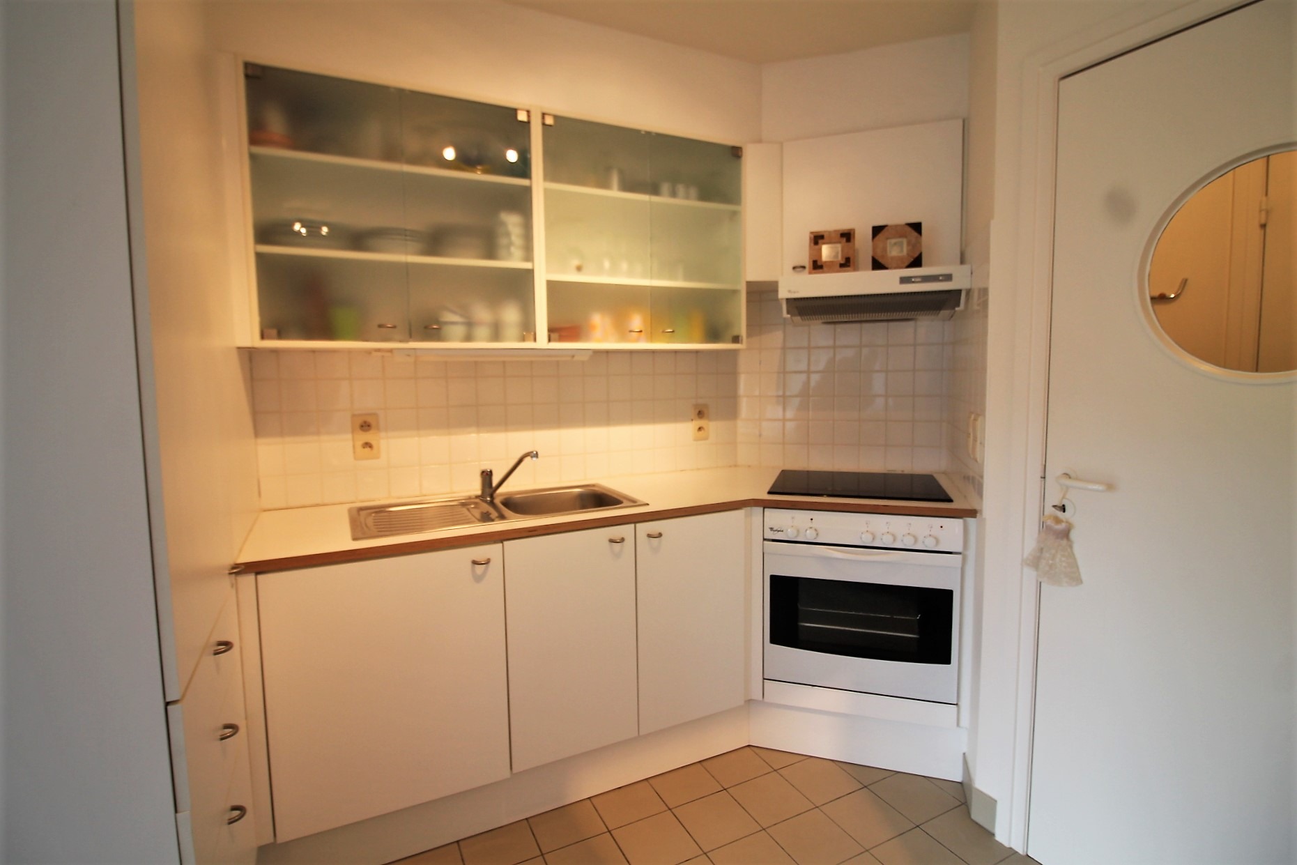 U komt binnen in de inkomhal en via een eerste deur komen we in de ingerichte open keuken (kookplaat | dampkap | oven | microgolf | frigo met vriesvak | spoelbak), aansluitend is er een ruime lichtrijke leefruimte voorzien van zitruimte/slaapzetel) en eetkamer. Via het schuifraam die voor de nodige lichtinval zorgt komt U op het terras (5 m²). Dit terras beschikt tevens over een berging.
