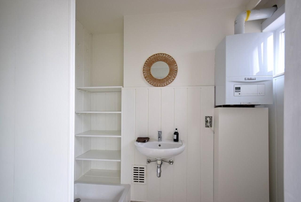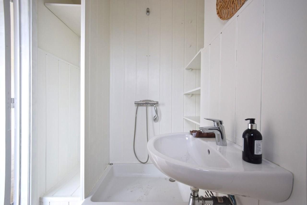 De volledig vernieuwde badkamer is stijlvol afgewerkt en voorzien van douche, lavabo en toilet.