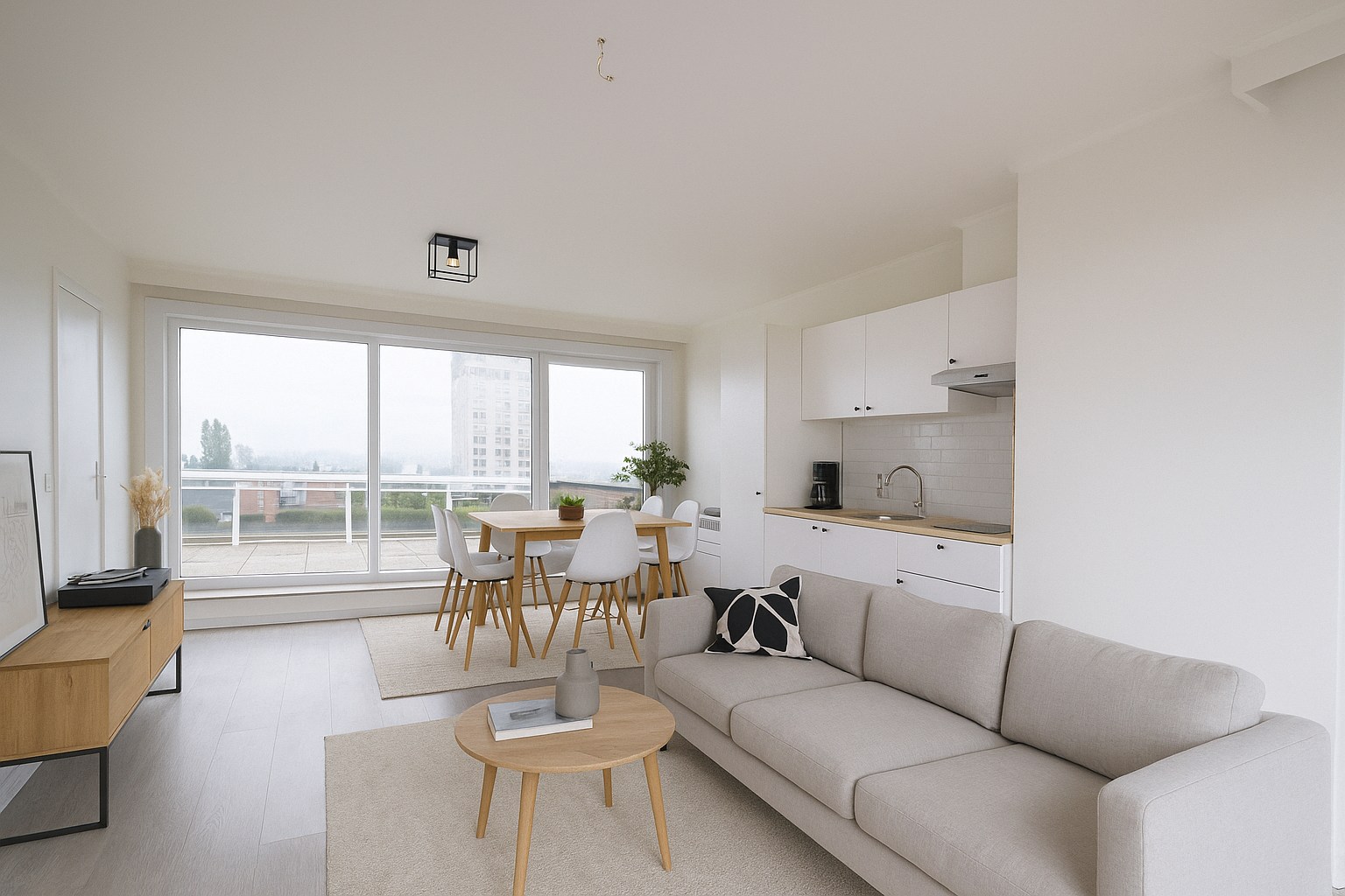 Binnen word je meteen verwelkomd door een lichtrijke leef- en slaapruimte met een splinternieuwe open keuken (kookplaat | dampkap | spoelbak).
