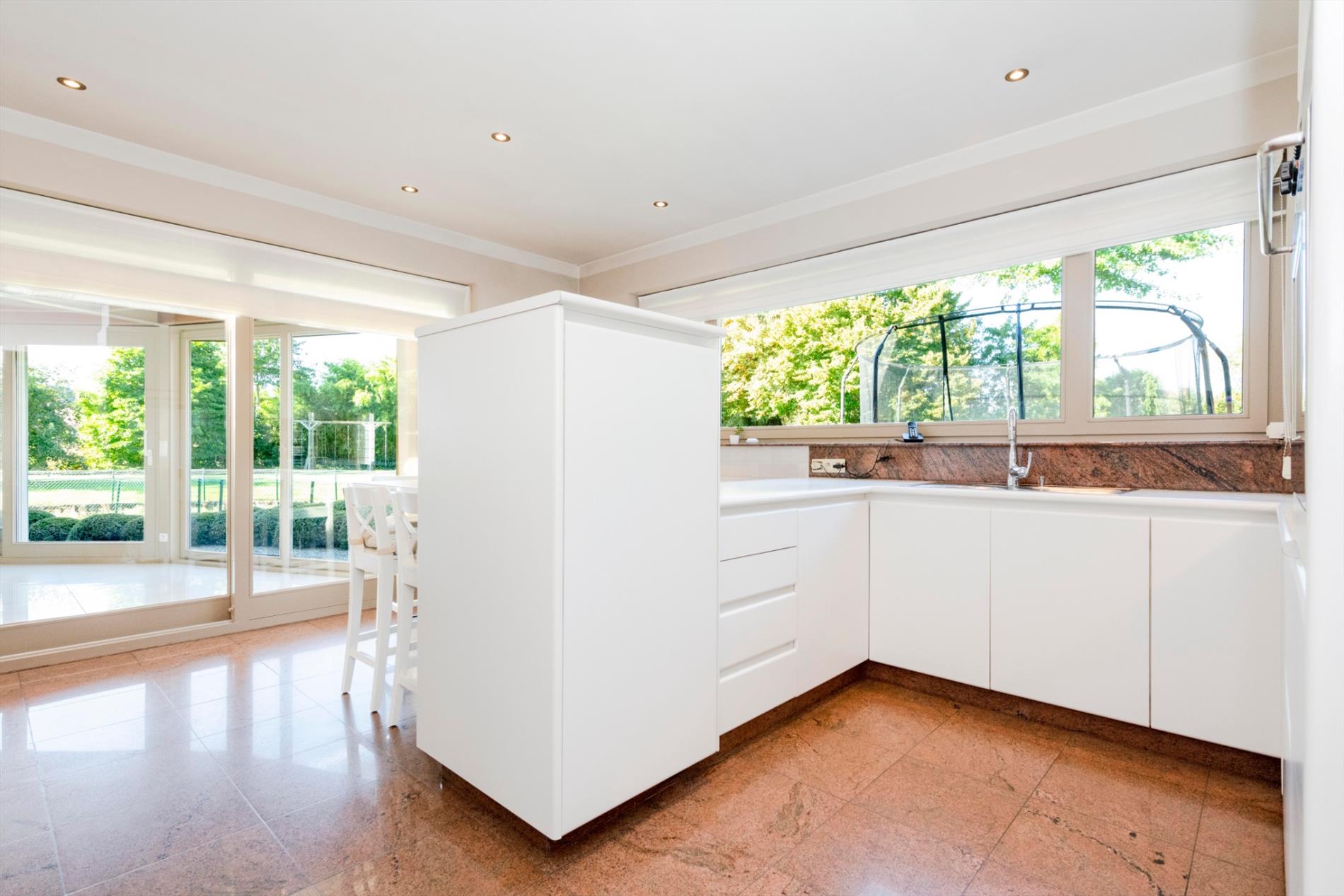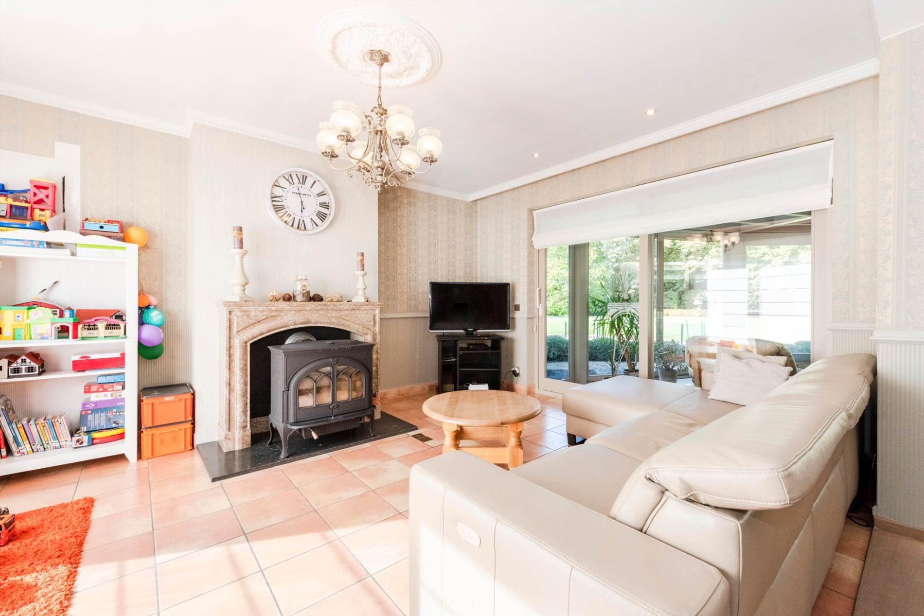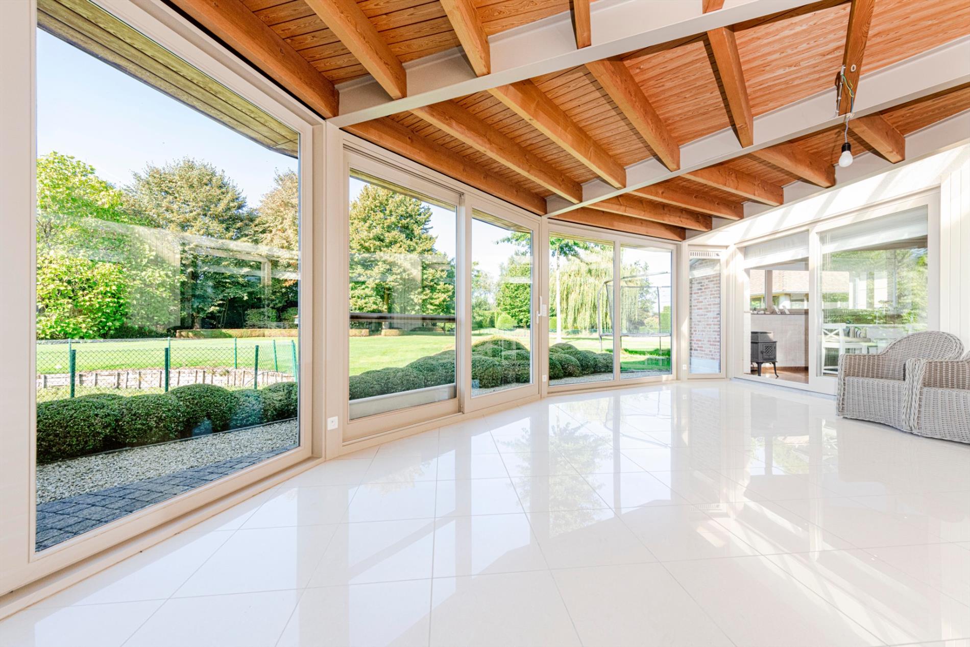 We komen deze villa binnen via de lichtrijke inkomhal. Deze biedt toegang tot enerzijds de bureauruimte en anderzijds tot de zéér ruime leefruimte van maar liefst 74 m²! De gezellige haard maakt deze ruimte tot hart van de woning. Vanuit de leefruimte is er toegang tot de open, volledig ingerichte keuken (kookplaat |dampkap | vaatwasser |dubbele spoelbak | koelkast |oven). Centraal in de woning is er de veranda die door zijn uniek ontwerp en de vele raampartijen U een fenomenaal zicht geeft op de prachtige tuin. Vanuit de leefruimte, keuken en zitruimte is er toegang tot deze veranda. Verder op het gelijkvloers is er nog een gastentoilet, wasplaats, doucheruimte en berging aanwezig. Tot slot is er de ruime garage (40 m²) met automatische poort met ruimte voor 2 wagens.