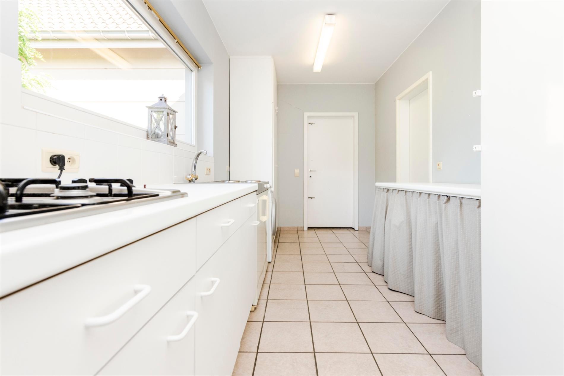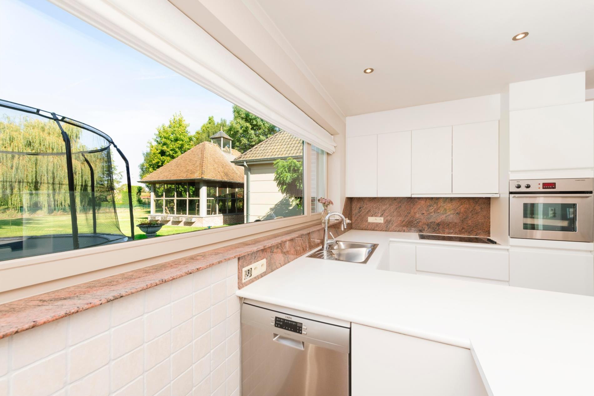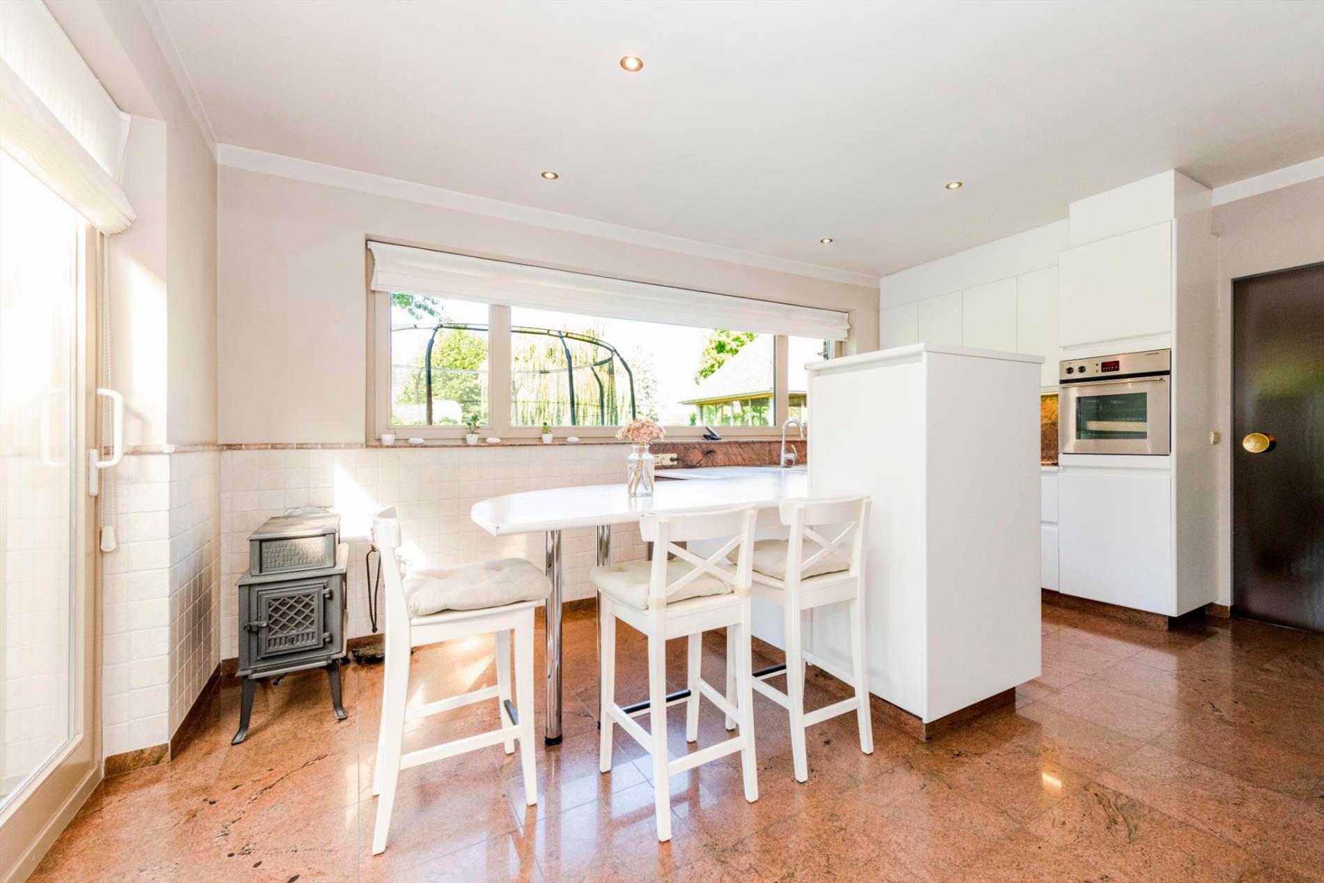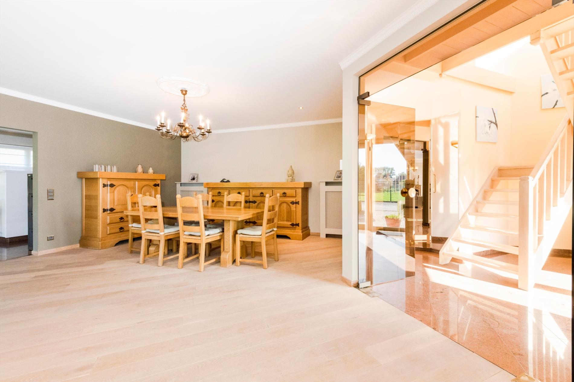 We komen deze villa binnen via de lichtrijke inkomhal. Deze biedt toegang tot enerzijds de bureauruimte en anderzijds tot de zéér ruime leefruimte van maar liefst 74 m²! De gezellige haard maakt deze ruimte tot hart van de woning. Vanuit de leefruimte is er toegang tot de open, volledig ingerichte keuken (kookplaat |dampkap | vaatwasser |dubbele spoelbak | koelkast |oven). Centraal in de woning is er de veranda die door zijn uniek ontwerp en de vele raampartijen U een fenomenaal zicht geeft op de prachtige tuin. Vanuit de leefruimte, keuken en zitruimte is er toegang tot deze veranda. Verder op het gelijkvloers is er nog een gastentoilet, wasplaats, doucheruimte en berging aanwezig. Tot slot is er de ruime garage (40 m²) met automatische poort met ruimte voor 2 wagens.