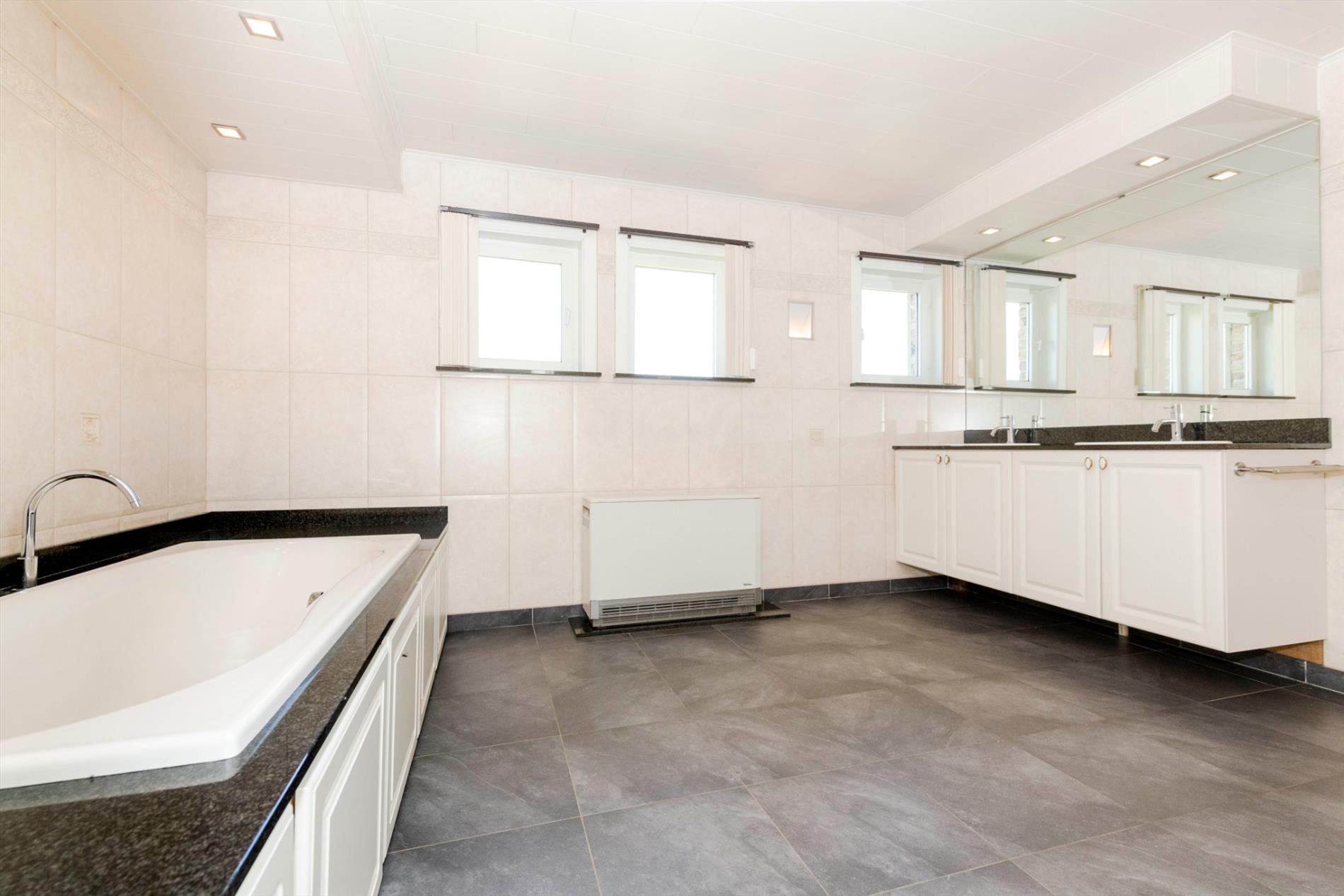 Verder op het gelijkvloers is er de ruime badkamer (13 m² - ligbad - dubbele lavabo) met aansluitend wasplaats met aansluiting voor de wasmachine en droogkast.