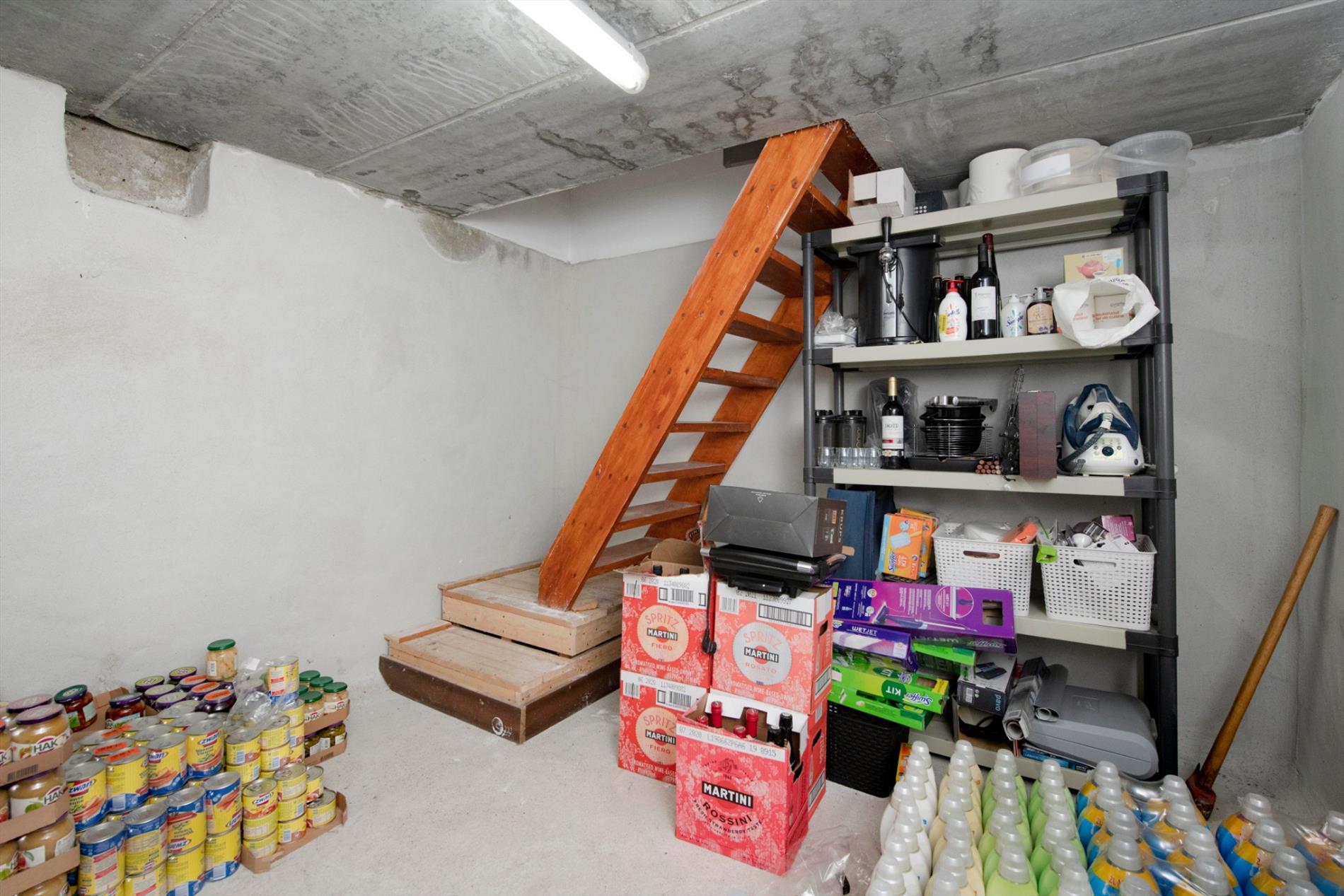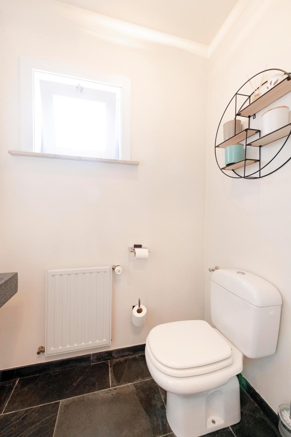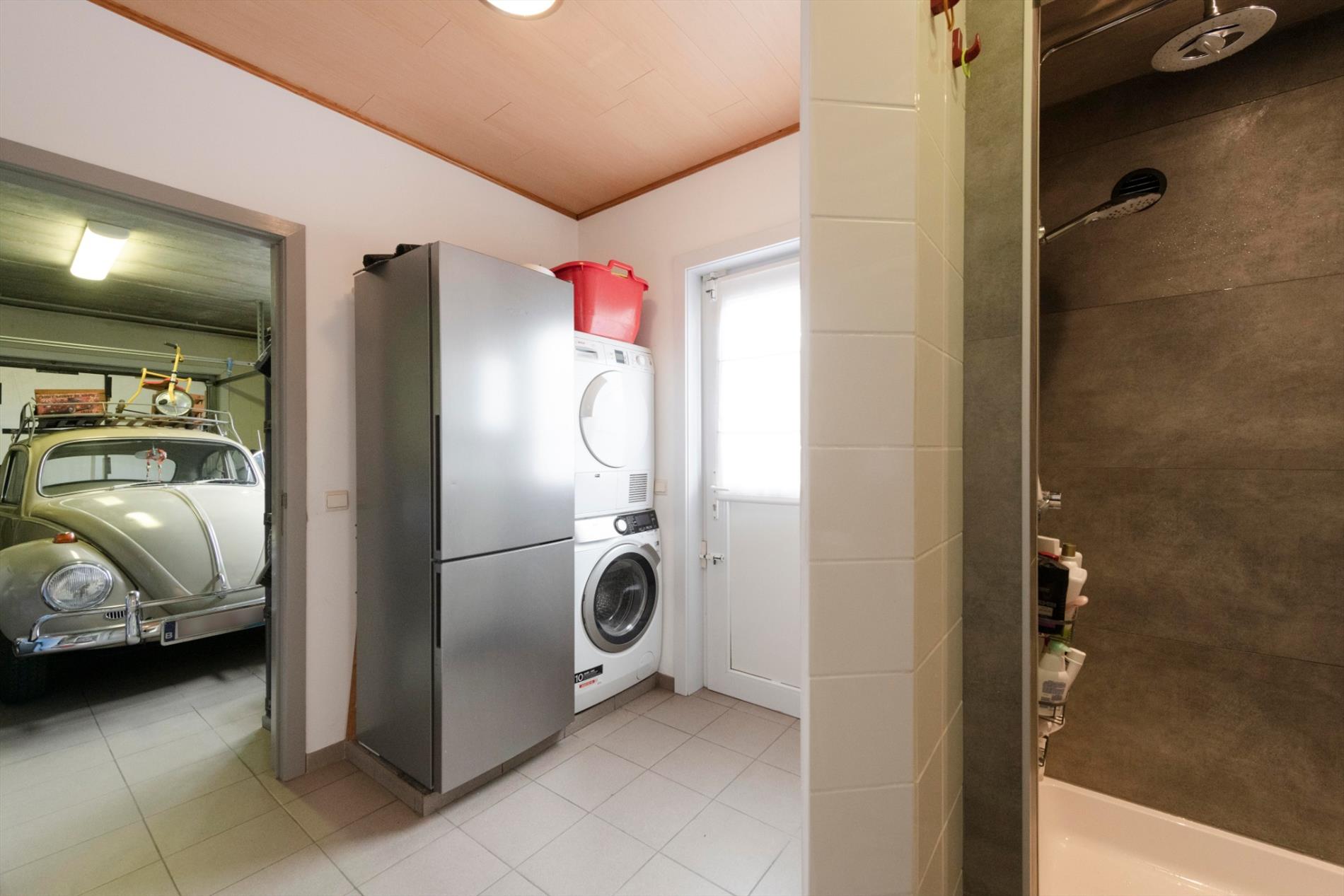 Aansluitend aan de keuken hebben we toegang tot de droge kelder, de achterinkom met vernieuwde doucheruimte alsook wasplaats, en de inpandige garage. Verder op het gelijkvloers is er een bureauruimte (9 m²).