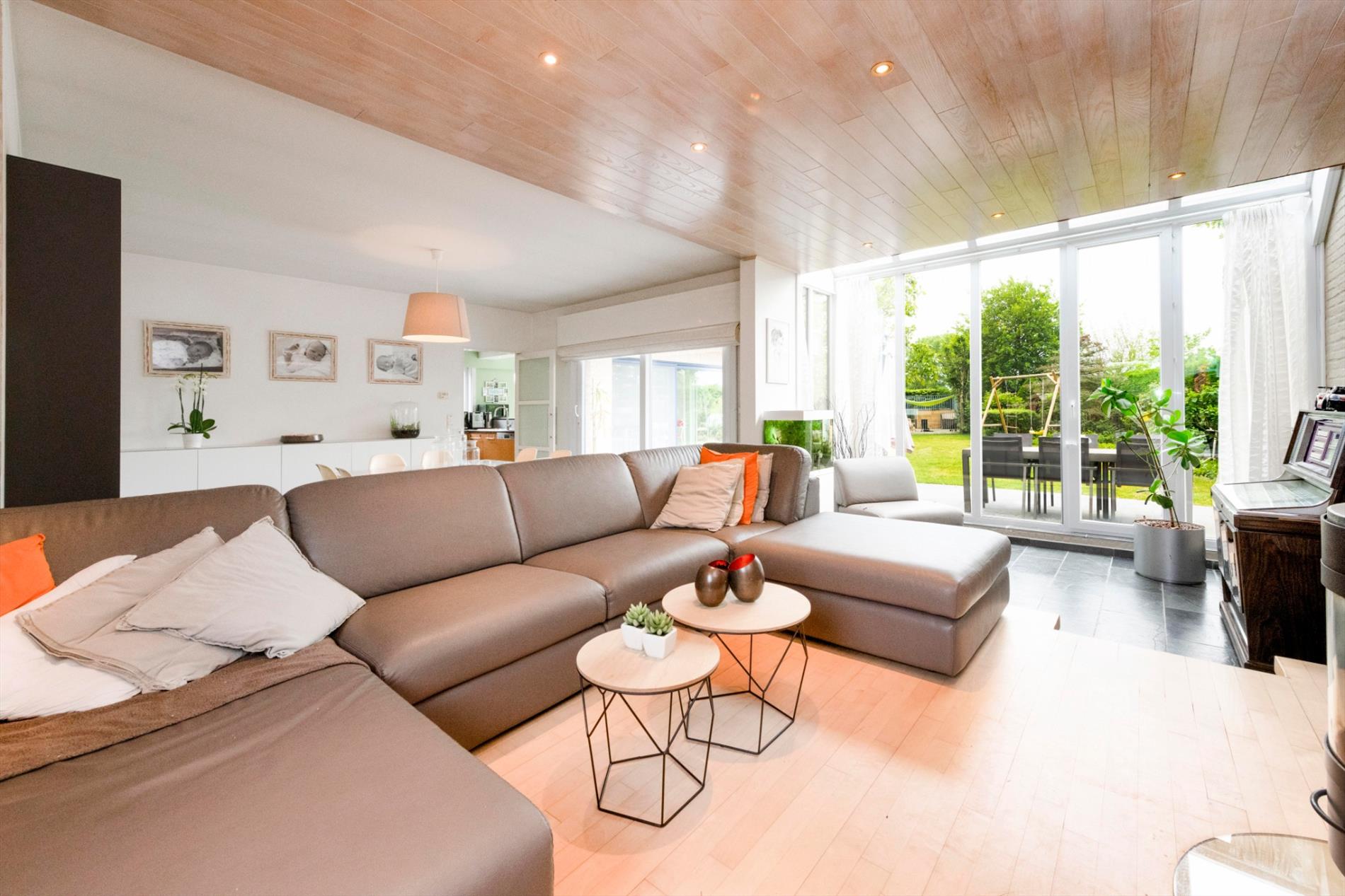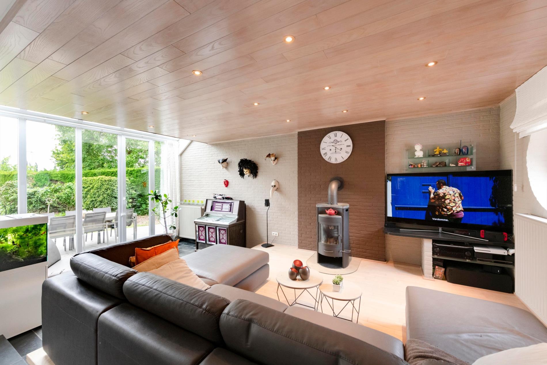 Gelijkvloers: We komen binnen in de inkomhal voorzien van vestiaire en gastentoilet. De eigendom beschikt over een zeer ruime leefruimte (45 m²), bestaande uit een eetplaats en een hoger gelegen zitruimte voorzien van een parket bevloering en houtkachel. Vanuit de leefruimte alsook de keuken hebben we een prachtig zicht en directe toegang tot de onderhoudsvriendelijke tuin.
