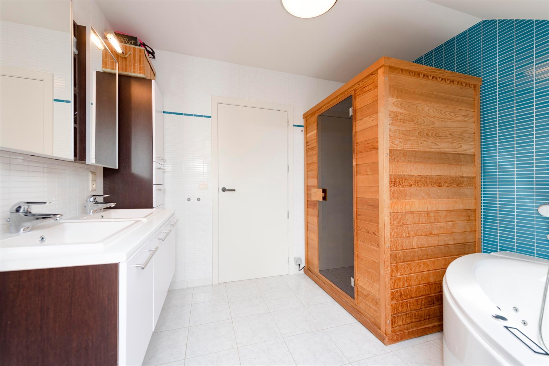 Eerste verdiep: Via de lichtrijke nachthall is er toegang tot maar liefst 4 ruime slaapkamers met een oppervlakte van 16,56 m² | 12,88 m² | 11,73 m² en 10,80 m². Verder op dit verdiep is er nog een bergplaats, apart toilet alsook een ruime ingerichte badkamer. De badkamer omvat een dubbele spoelbak met meubel, een hoekbubbelbad alsook recente sauna.