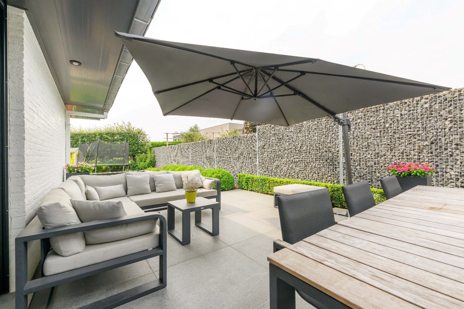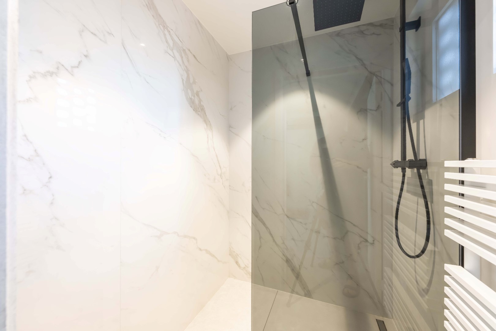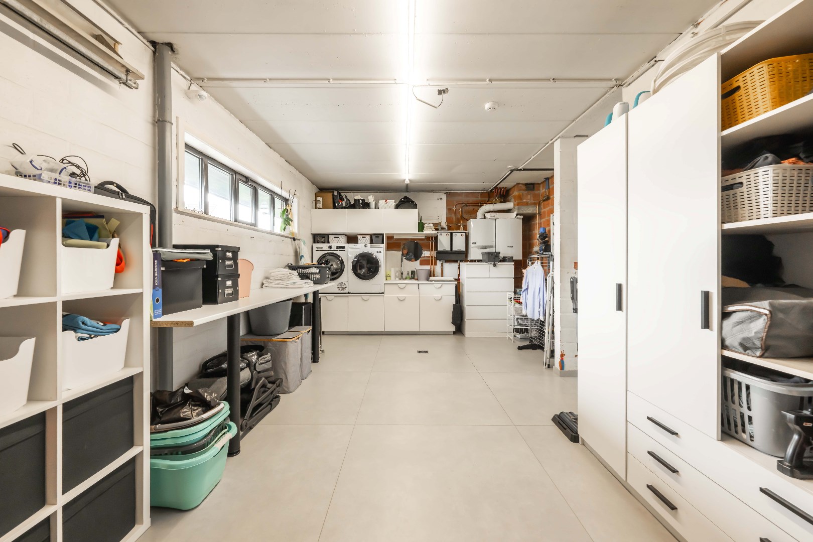 Verder is er nog de inpandige garage met ingemaakte kastenwand en aansluiting voor wasmachine en droogkast. Handig is tevens de gelijkvloerse inloopdouche.