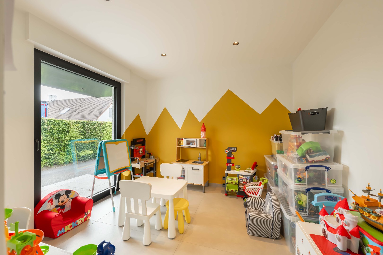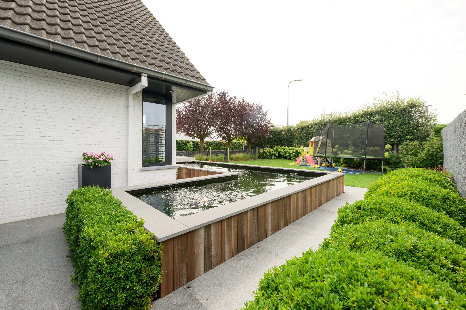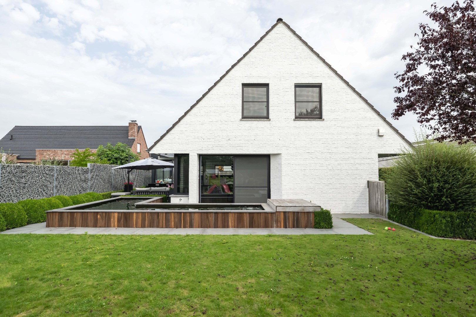 Verder is er nog de inpandige garage met ingemaakte kastenwand en aansluiting voor wasmachine en droogkast. Handig is tevens de gelijkvloerse inloopdouche.