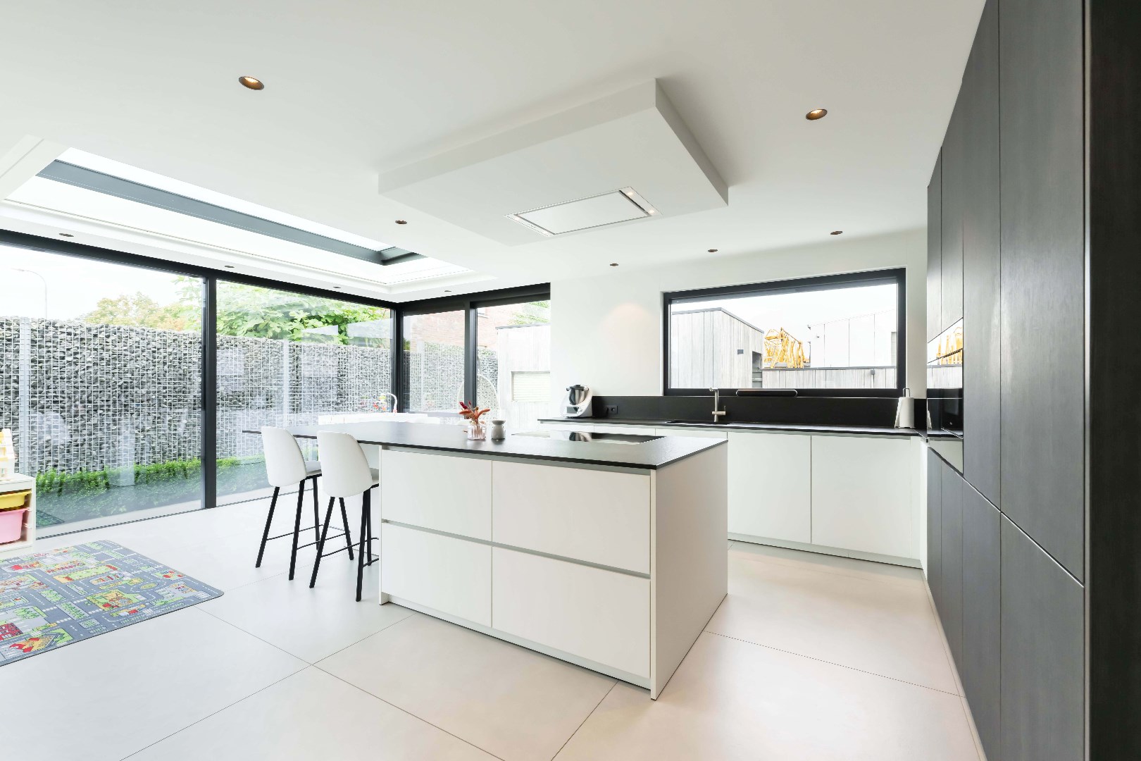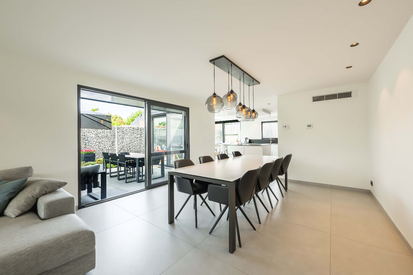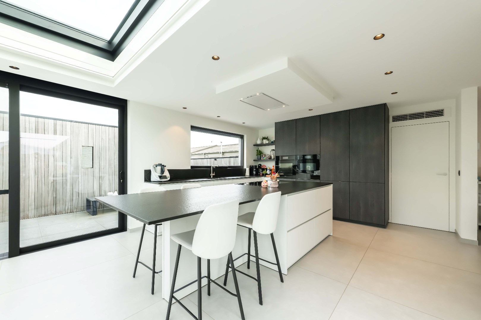 Aansluitend is er de ingerichte leefkeuken, voorzien van kookplaat met dampkap, dubbele frigo en dubbele diepvries, spoelbak en vaatwasser. Aansluitende is er een ruime koele berging.