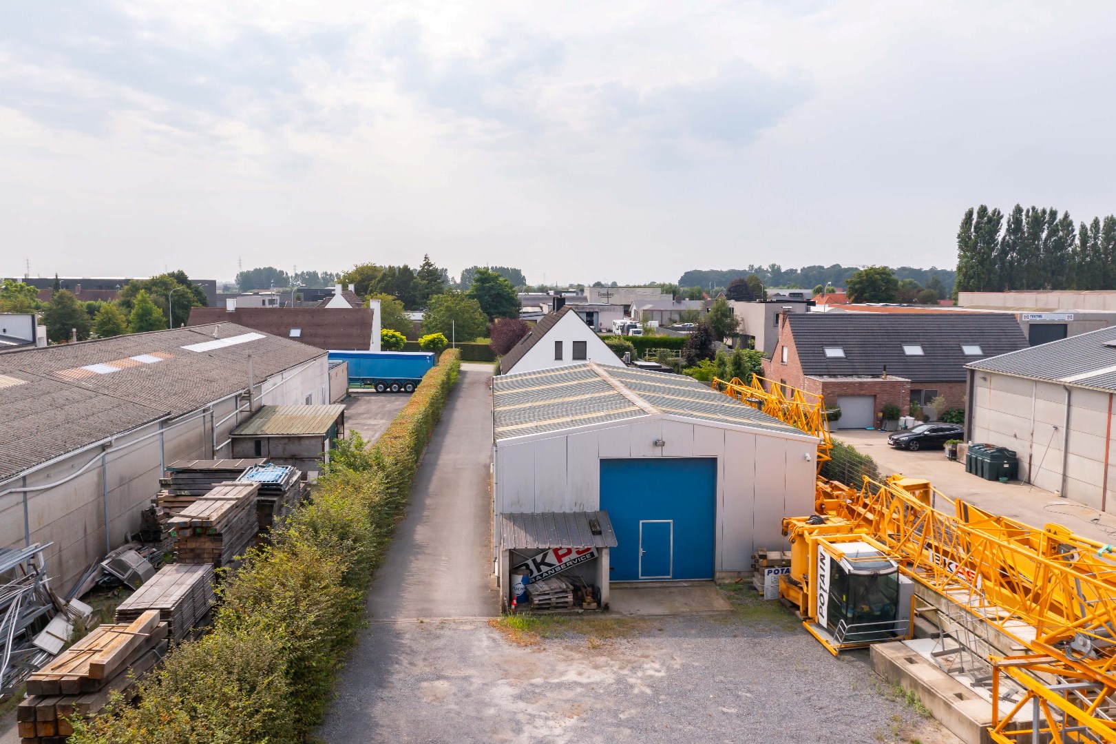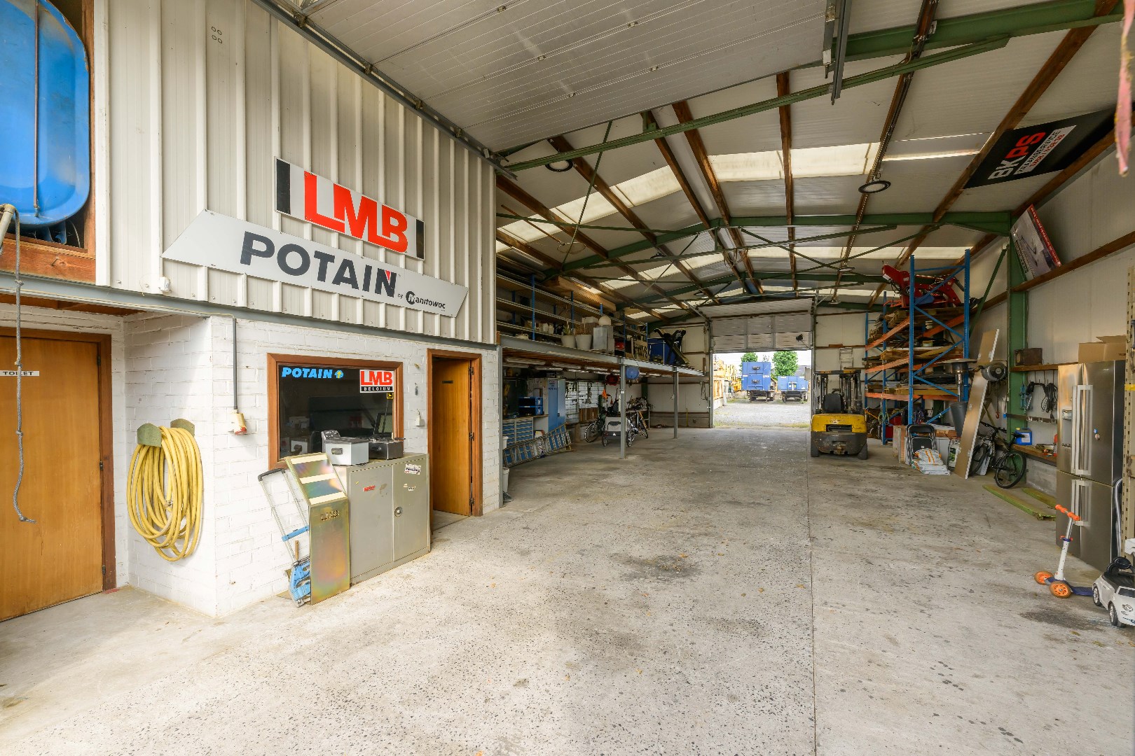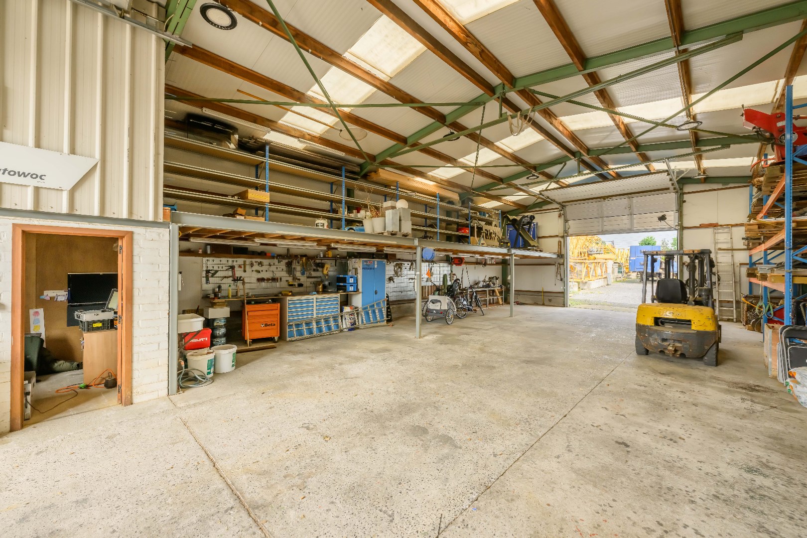 Deze loods met geïsoleerd dak omvat 200m² (10m op 20m) met een volle hoogte van 5,70 m met voor en achteraan een automatische poort van 4 m hoogte. Tevens beschikt U in de loods over een apart toilet en bureauruimte.