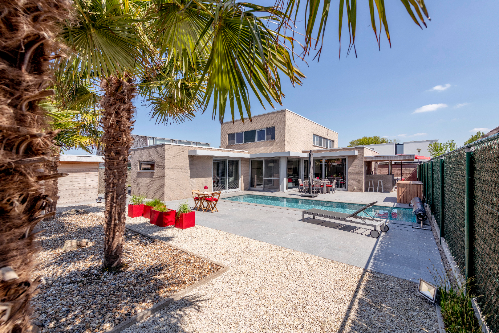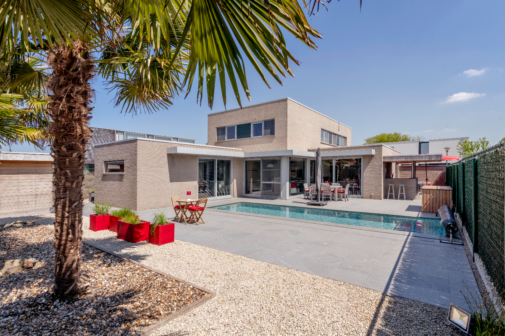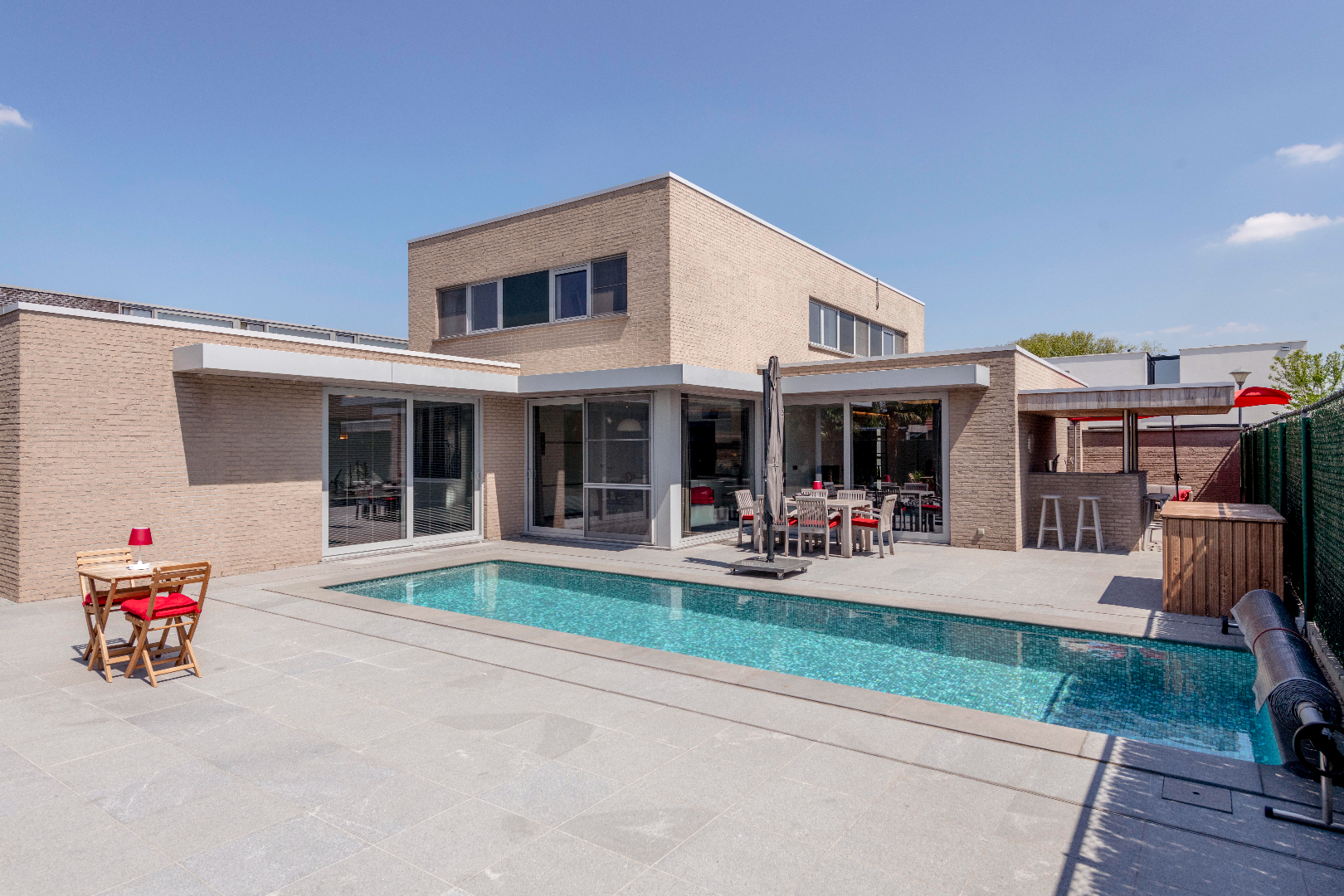 EXTERIEUR: Deze eigendom is voorzien van een zongerichte tuin met ruime terrassen (natuur/hardsteen) zodoende U op elk moment van de dag kan genieten! Een prachtig zwembad (8m80 x 2m90 x 1m40 | warmtepomp) en buitenbar. Handig is de poolhouse (25 m²) ingericht met toilet | douche en bijkeuken. De tuin is volledig afgesloten en ingevolge kindvriendelijk. Tenslotte is er een dubbel carport en tevens voldoende parkeerplaats op privaat terrein.