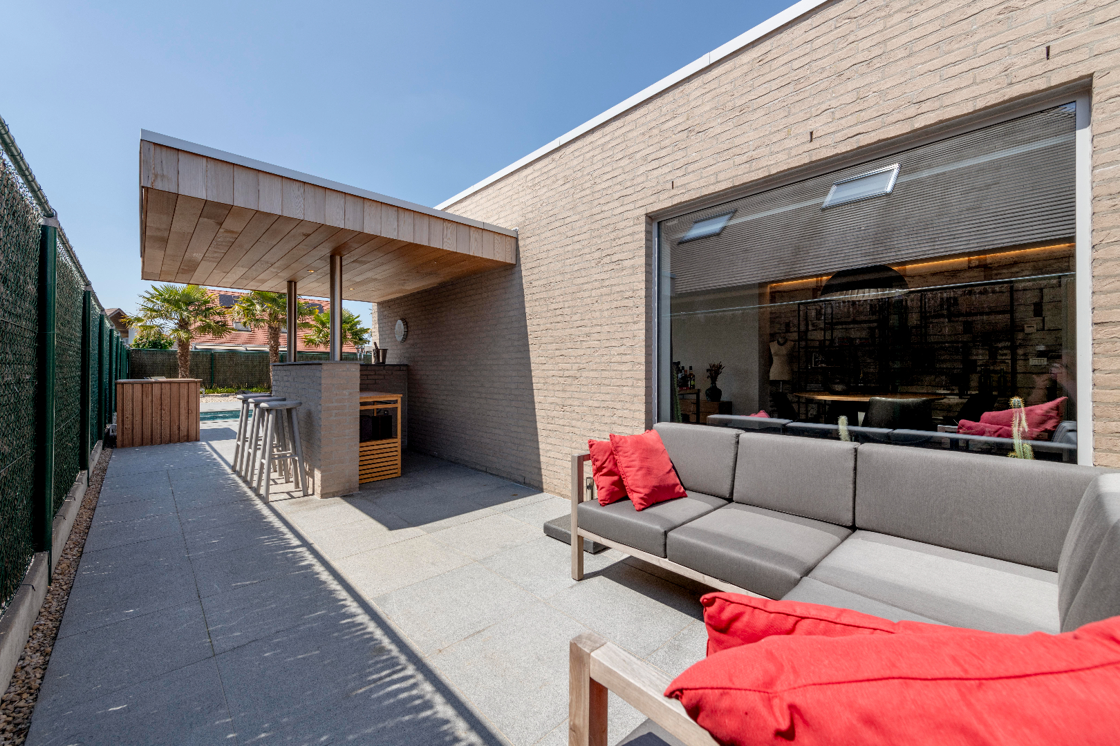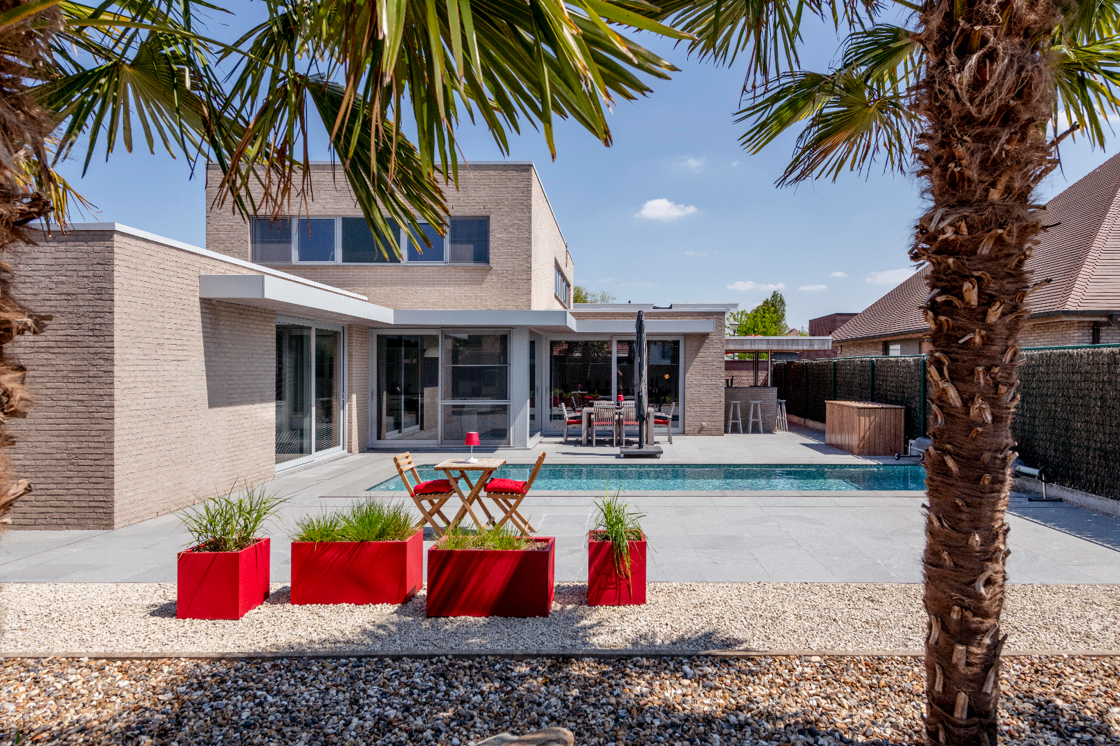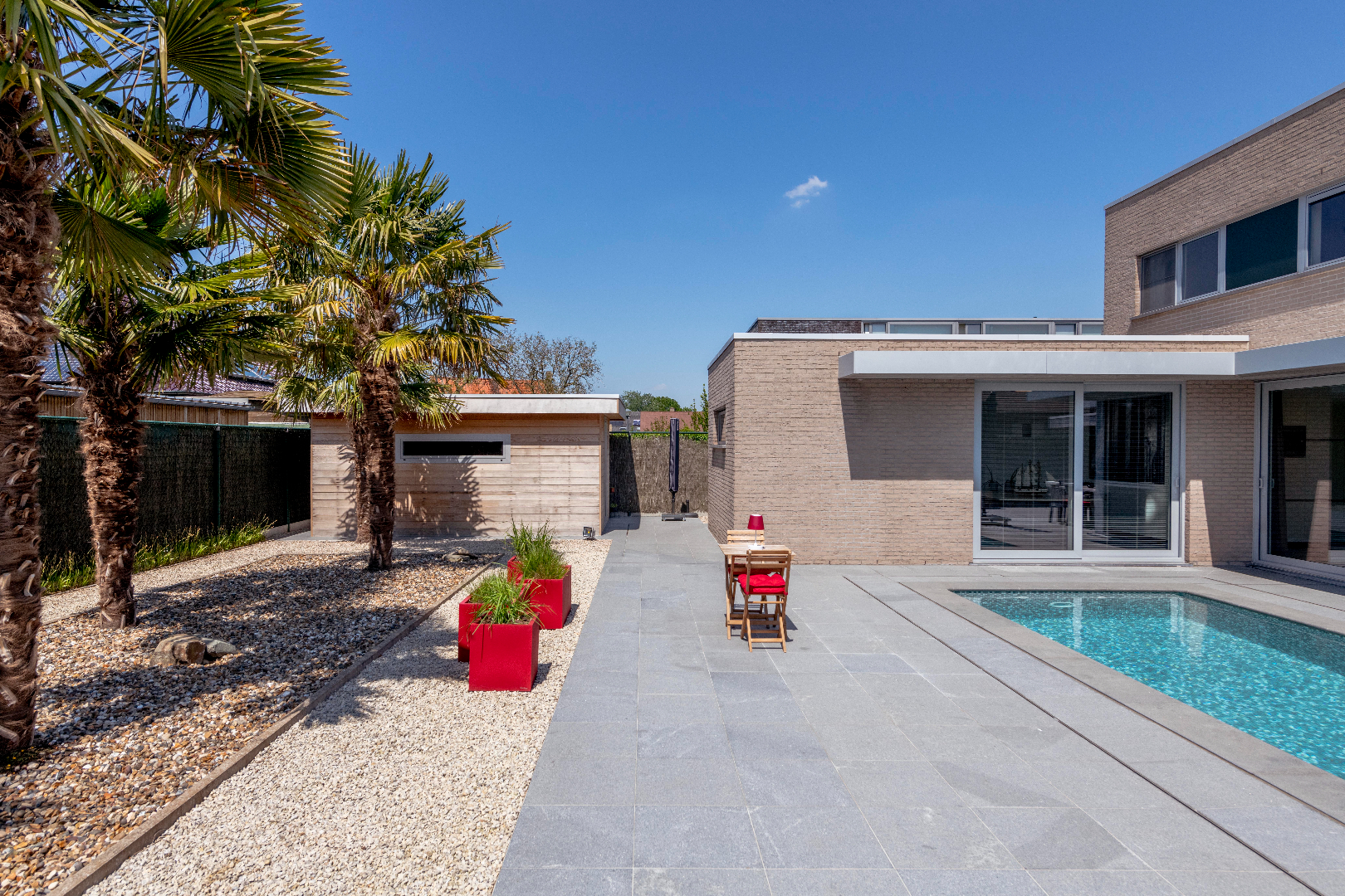 EXTERIEUR: Deze eigendom is voorzien van een zongerichte tuin met ruime terrassen (natuur/hardsteen) zodoende U op elk moment van de dag kan genieten! Een prachtig zwembad (8m80 x 2m90 x 1m40 | warmtepomp) en buitenbar. Handig is de poolhouse (25 m²) ingericht met toilet | douche en bijkeuken. De tuin is volledig afgesloten en ingevolge kindvriendelijk. Tenslotte is er een dubbel carport en tevens voldoende parkeerplaats op privaat terrein.