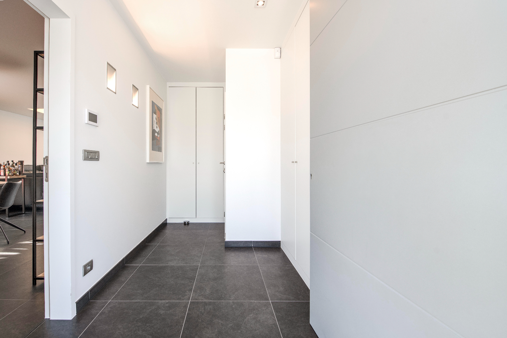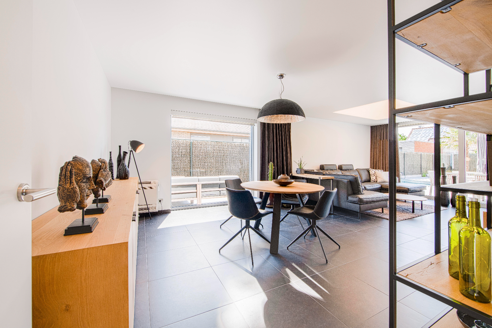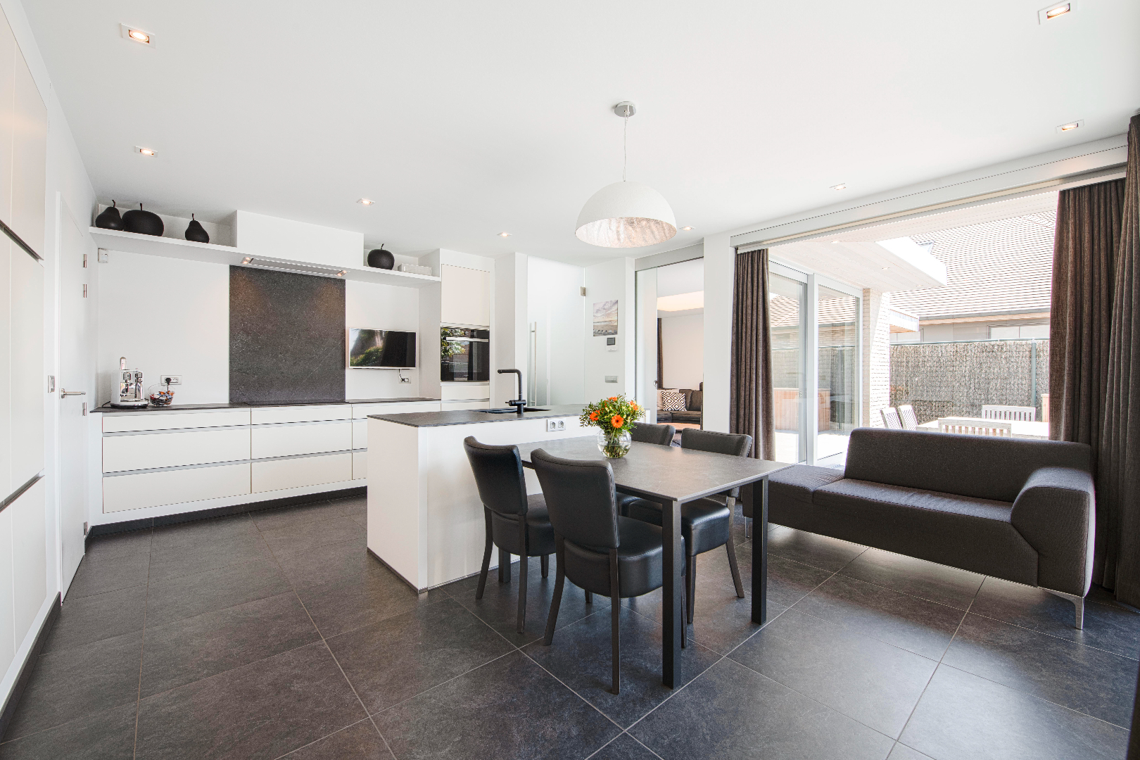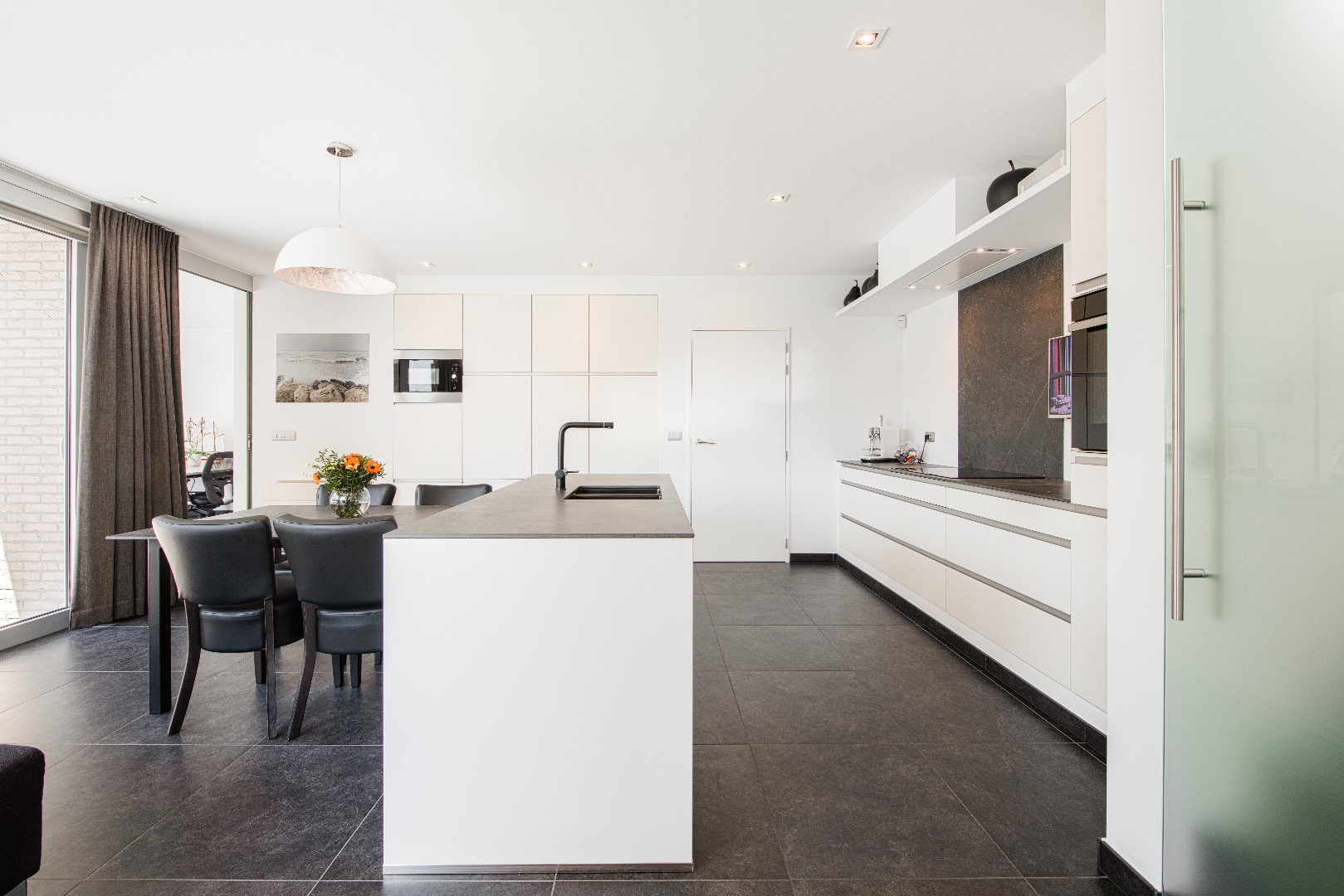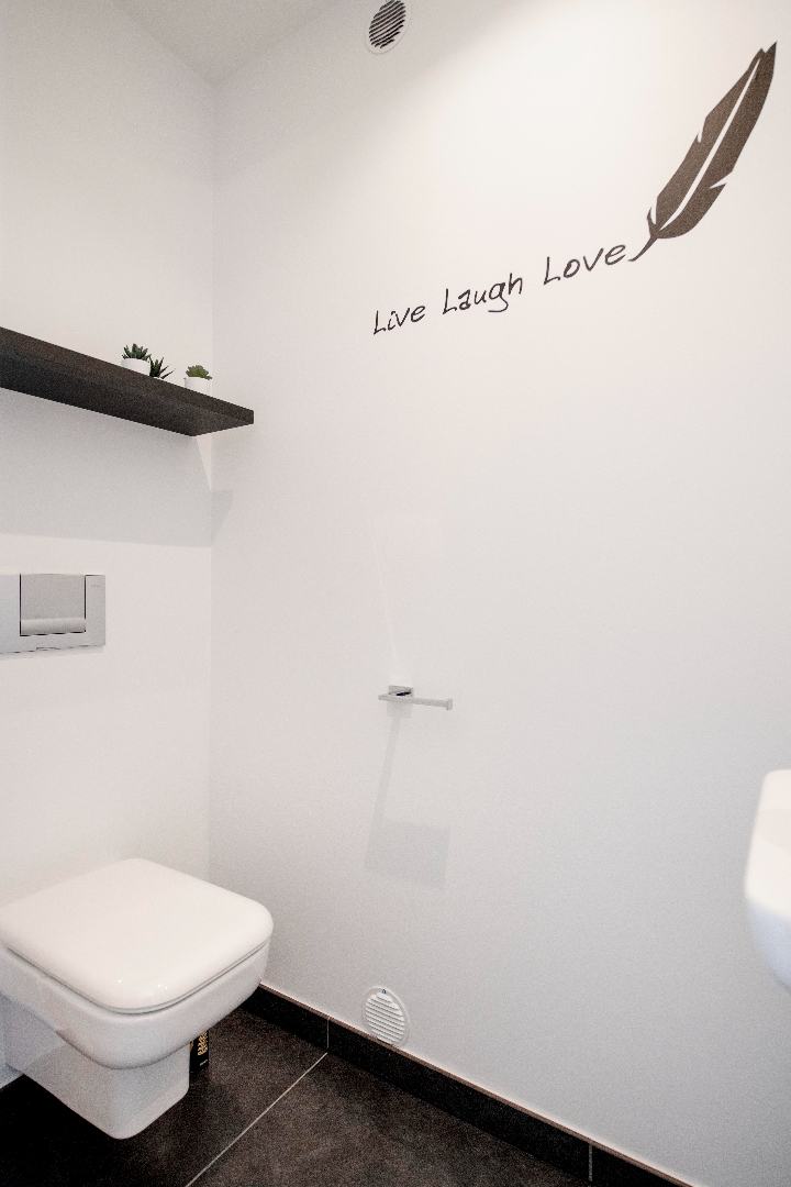 INTERIEUR: Reeds bij het binnenkomen valt meteen op dat het hier om een uitzonderlijk perfect afgewerkte eigendom gaat. Het geeft meteen een wauw-effect! Een open aaneenschakeling van ruimtes met een mooie lichte afwerking met kwalitatieve materialen. De grote raampartijen combinatie met een strakke open indeling geven een absoluut ruimtegevoel. De ruime inkomhal met ingemaakte kasten en gastentoilet geeft toegang tot de leefruimte (37m²). Dit is een open geheel met een gezellige zithoek en eetplaats. Aansluitend is er de leefkeuken. De open moderne keuken met eiland is volledig uitgerust: microgolf, heteluchtoven, vaatwasser, koelkast, diepvriezer en inductie kookplaat. Tevens ook hier aan opbergruimte geen tekort. Handig is het aansluitende bureel met ingemaakte kasten. Deze ruimte kan tevens dienst doen als extra slaapkamer. Tenslotte is er op het gelijkvloers de koele berging, de wasplaats met wederom ingemaakte kasten en de doucheruimte (lavabo met meubel en douche).