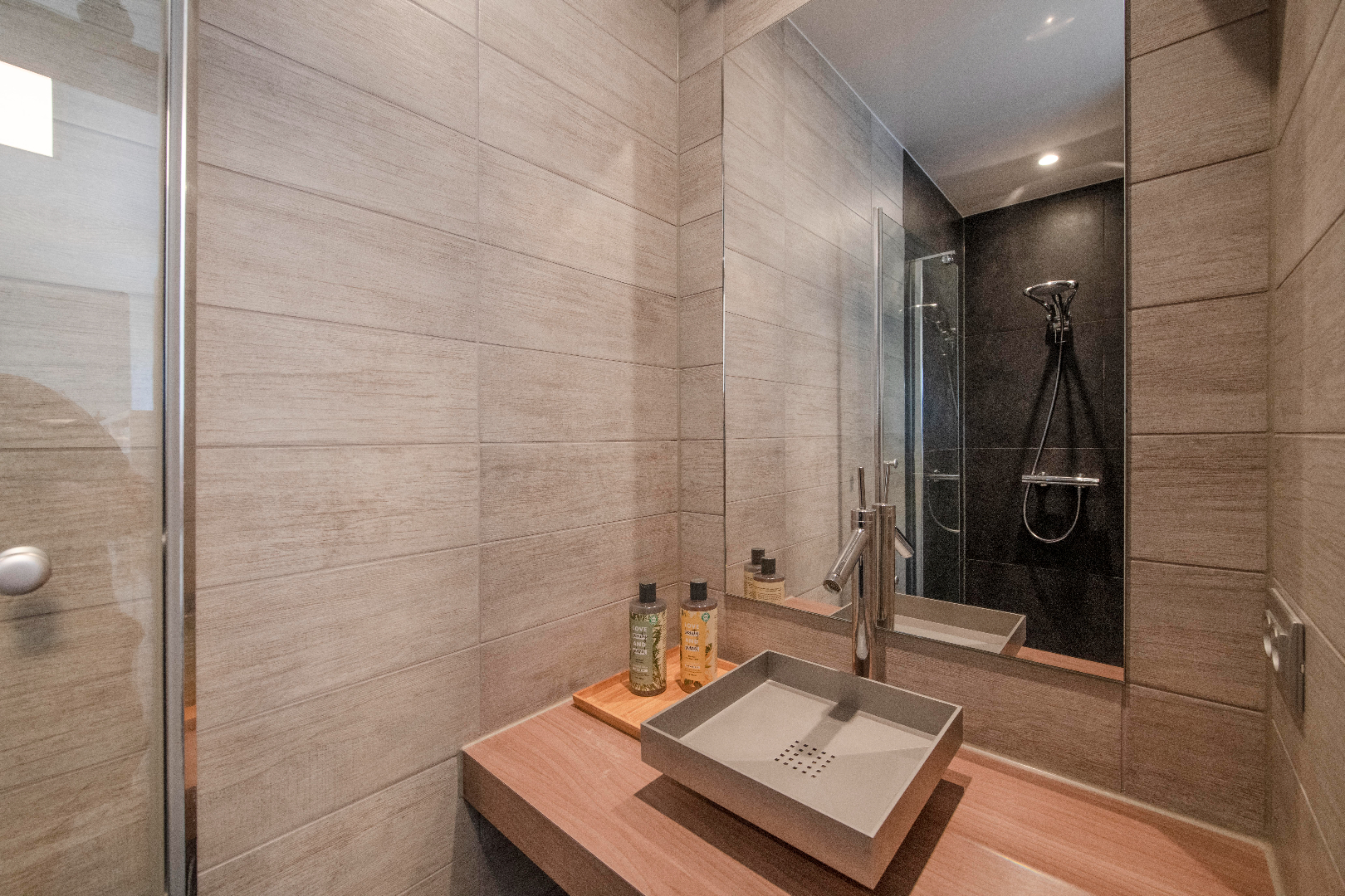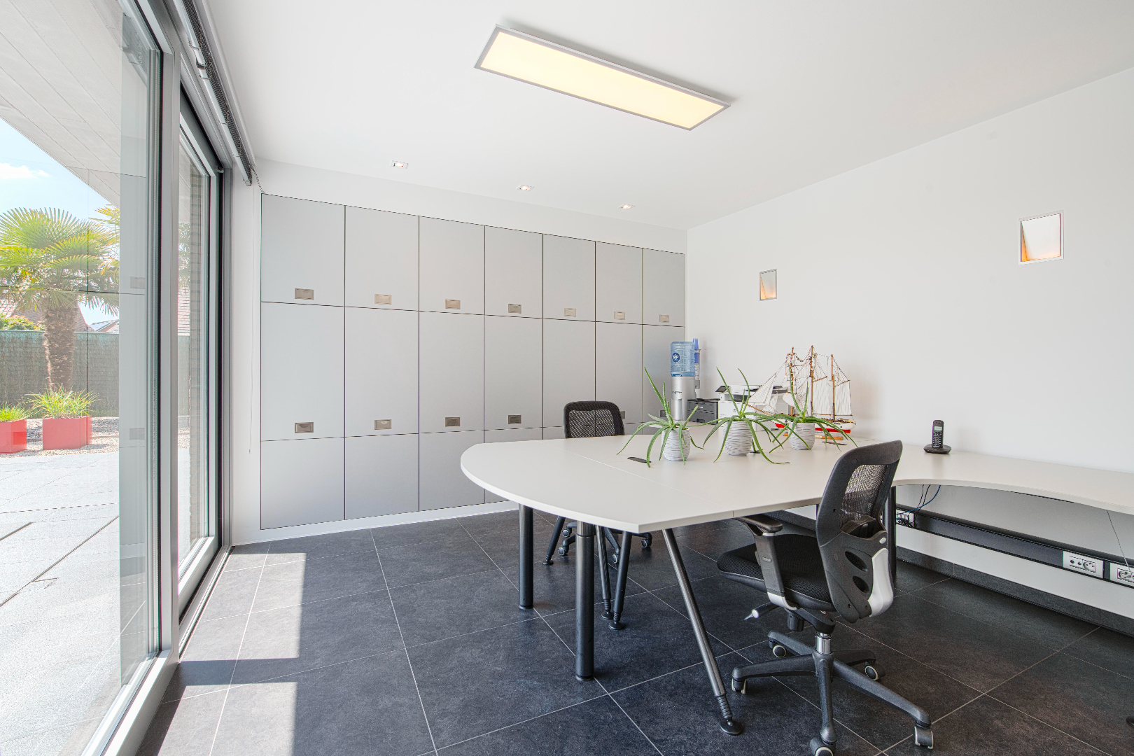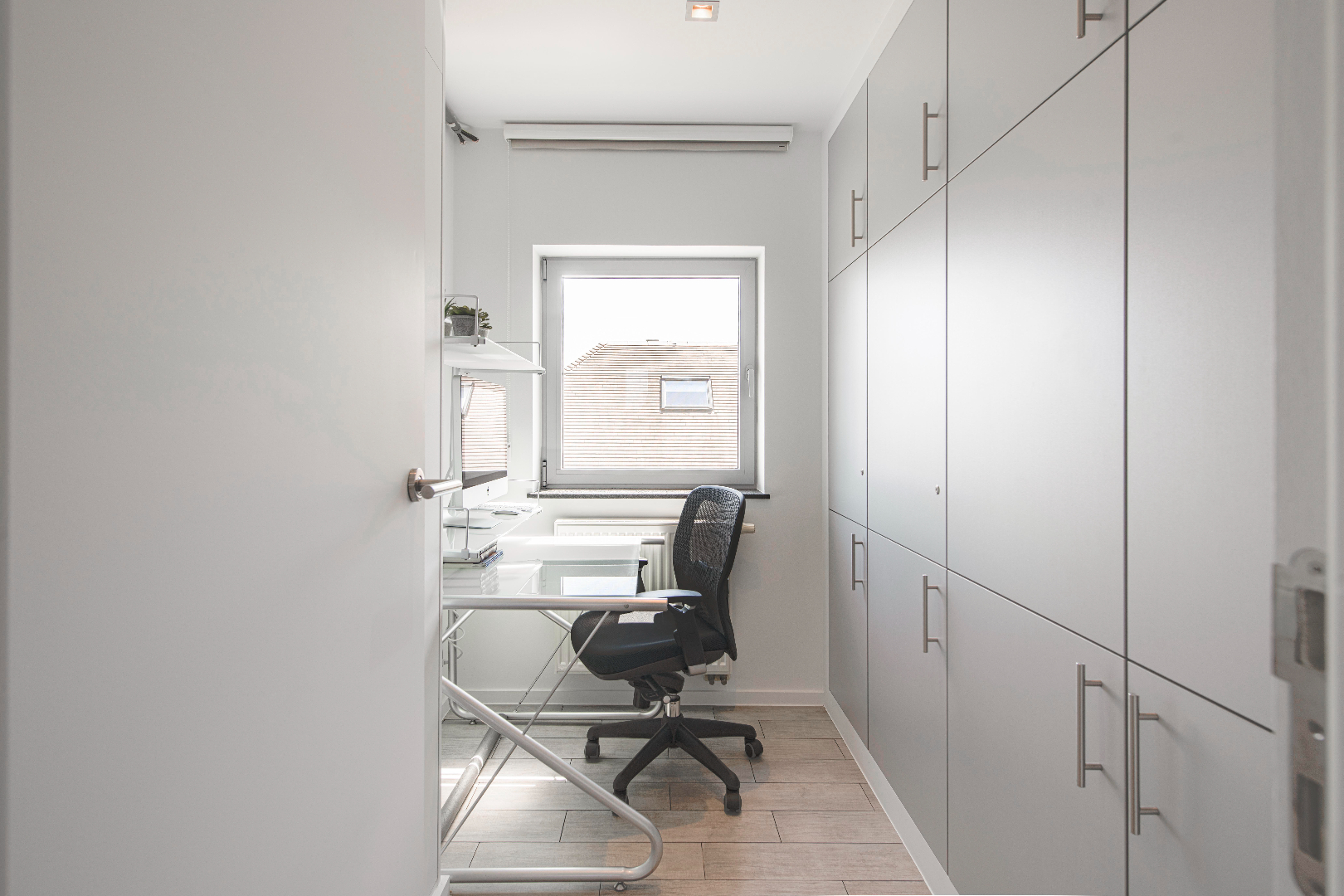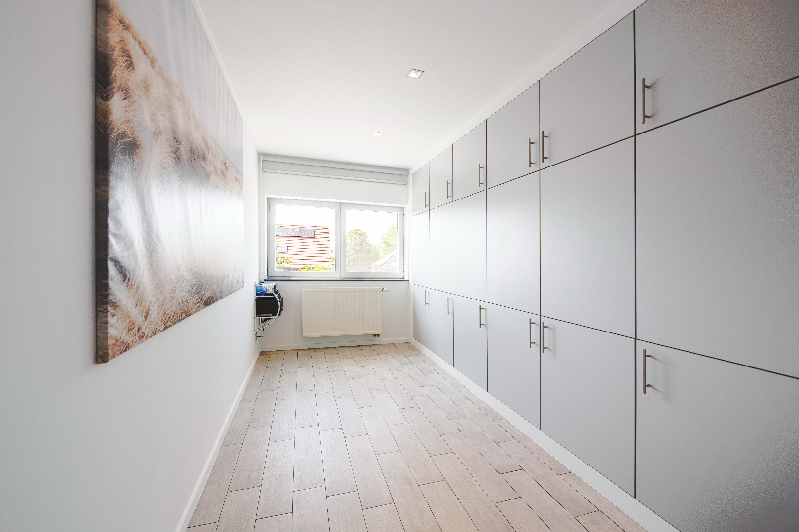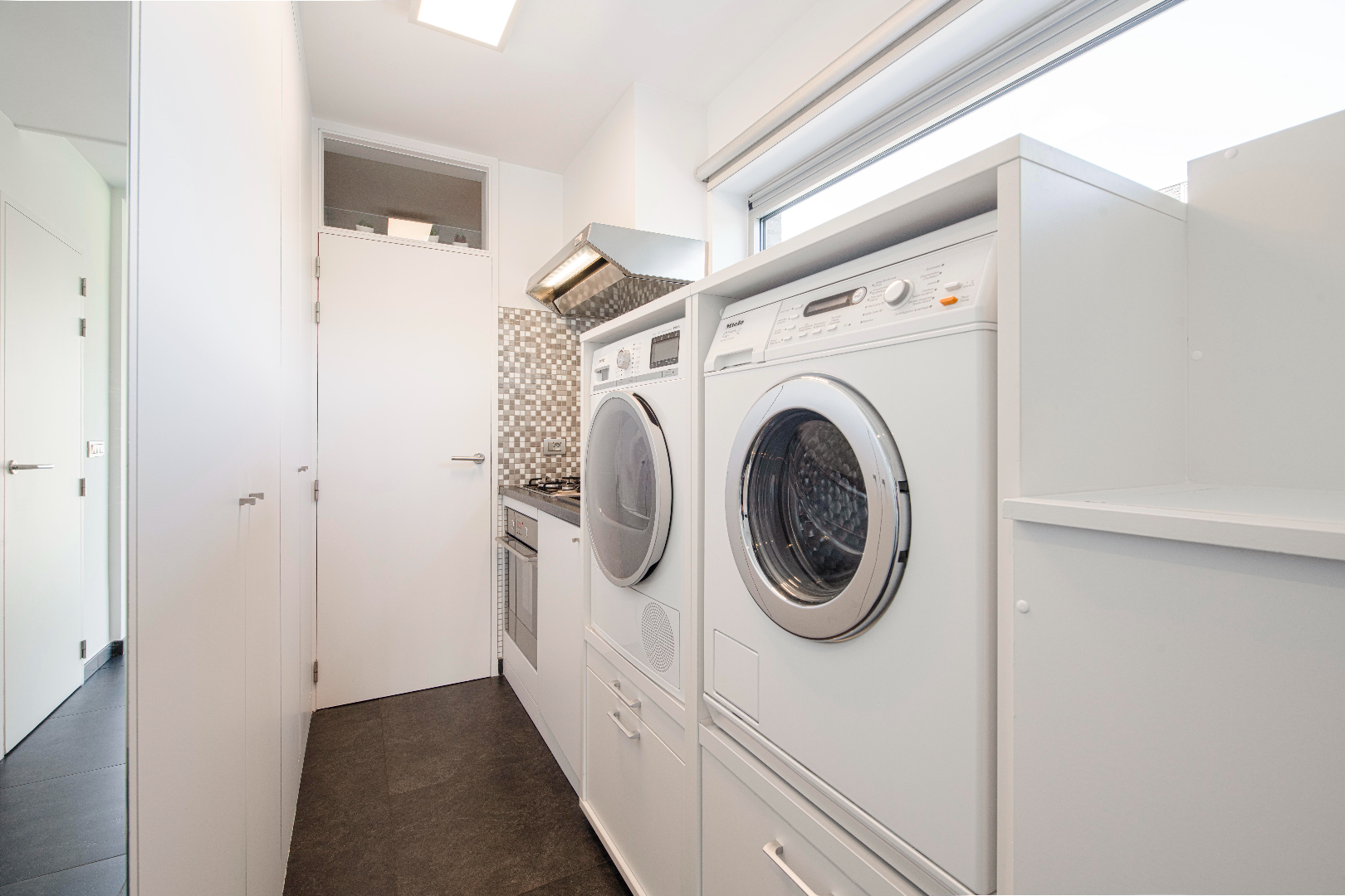INTERIEUR: Reeds bij het binnenkomen valt meteen op dat het hier om een uitzonderlijk perfect afgewerkte eigendom gaat. Het geeft meteen een wauw-effect! Een open aaneenschakeling van ruimtes met een mooie lichte afwerking met kwalitatieve materialen. De grote raampartijen combinatie met een strakke open indeling geven een absoluut ruimtegevoel. De ruime inkomhal met ingemaakte kasten en gastentoilet geeft toegang tot de leefruimte (37m²). Dit is een open geheel met een gezellige zithoek en eetplaats. Aansluitend is er de leefkeuken. De open moderne keuken met eiland is volledig uitgerust: microgolf, heteluchtoven, vaatwasser, koelkast, diepvriezer en inductie kookplaat. Tevens ook hier aan opbergruimte geen tekort. Handig is het aansluitende bureel met ingemaakte kasten. Deze ruimte kan tevens dienst doen als extra slaapkamer. Tenslotte is er op het gelijkvloers de koele berging, de wasplaats met wederom ingemaakte kasten en de doucheruimte (lavabo met meubel en douche).