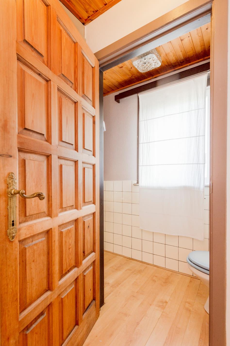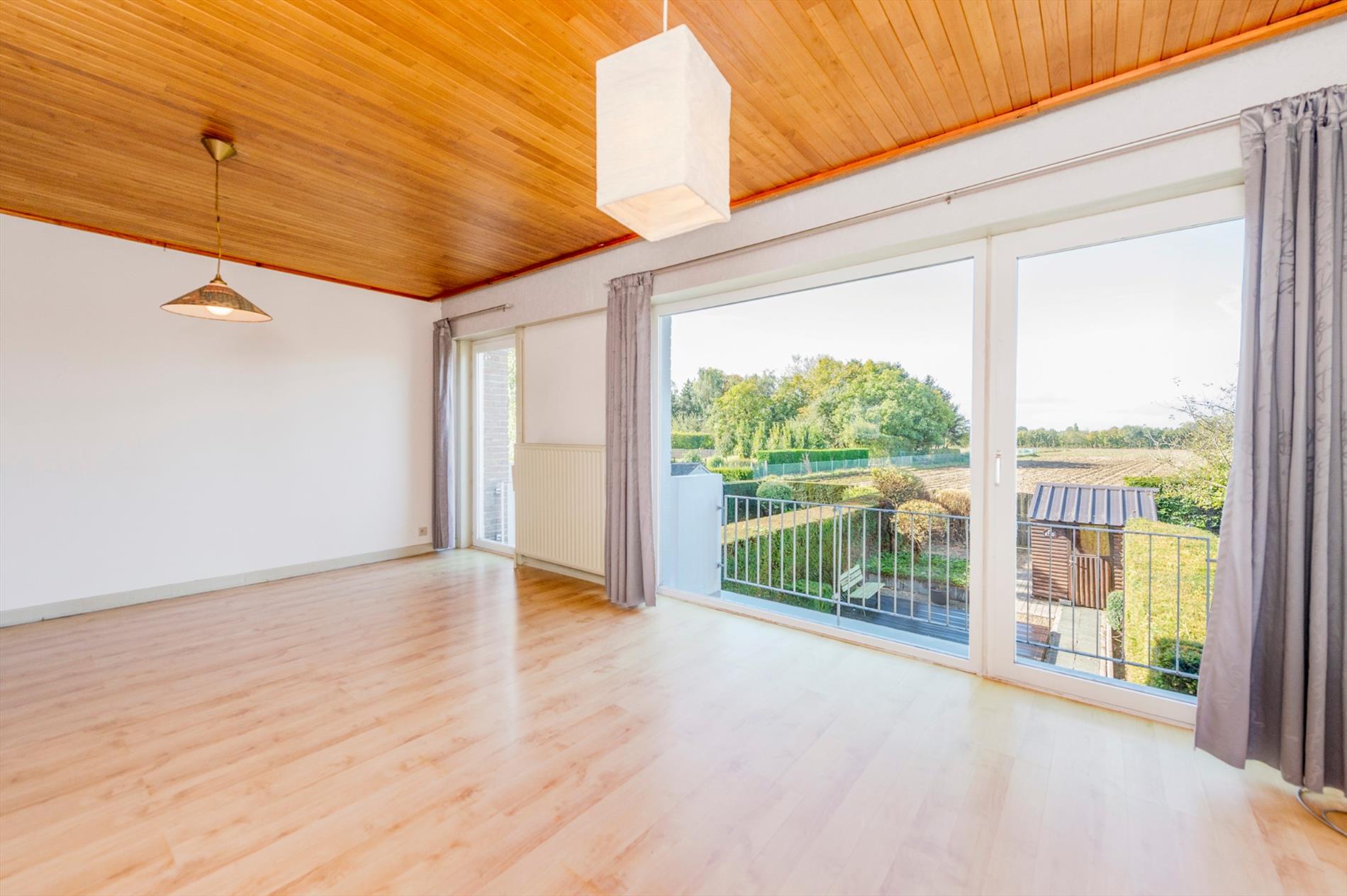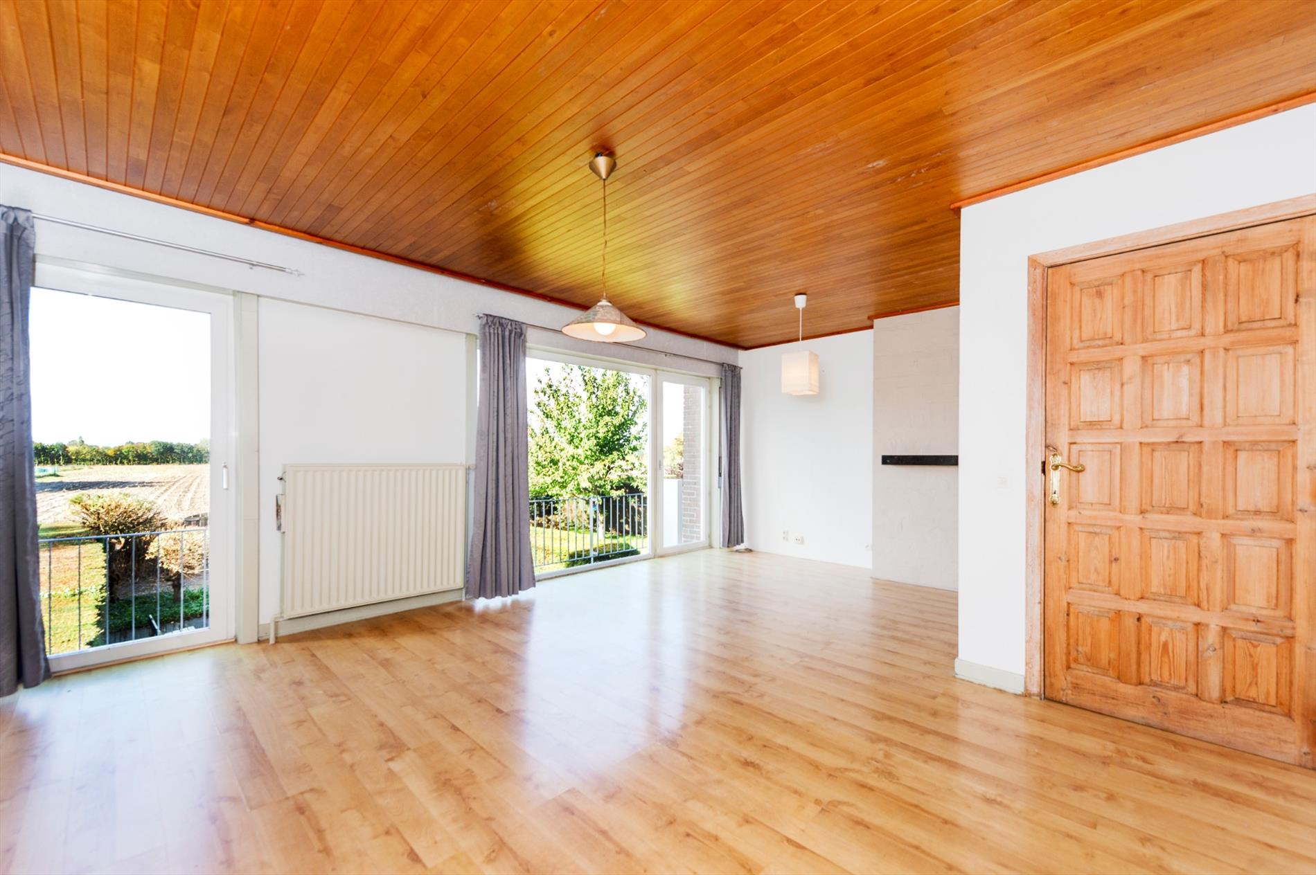 Het gelijkvloers bestaat dus uit een ruime garage, aparte berging en inkomhall. Het eerste verdiep omvat een vestiaire met een apart gastentoilet. Via de hall komen we in de woonkamer met zithoek en eetplaats. Door de grote glaspartij is er een enorme lichtinval en tevens ook een prachtig verzicht op het achterliggende agrarische gebied. De gesloten keuken is voorzien van een dubbele spoelbak, kookplaat en dampkap. Verder is er nog voorziening voor oven/frigo. Op het tweede verdiep brengt de nachthall brengt U naar de drie slaapkamers en tevens de badkamer (voorzien van ligbad/douche, lavabo en toilet).