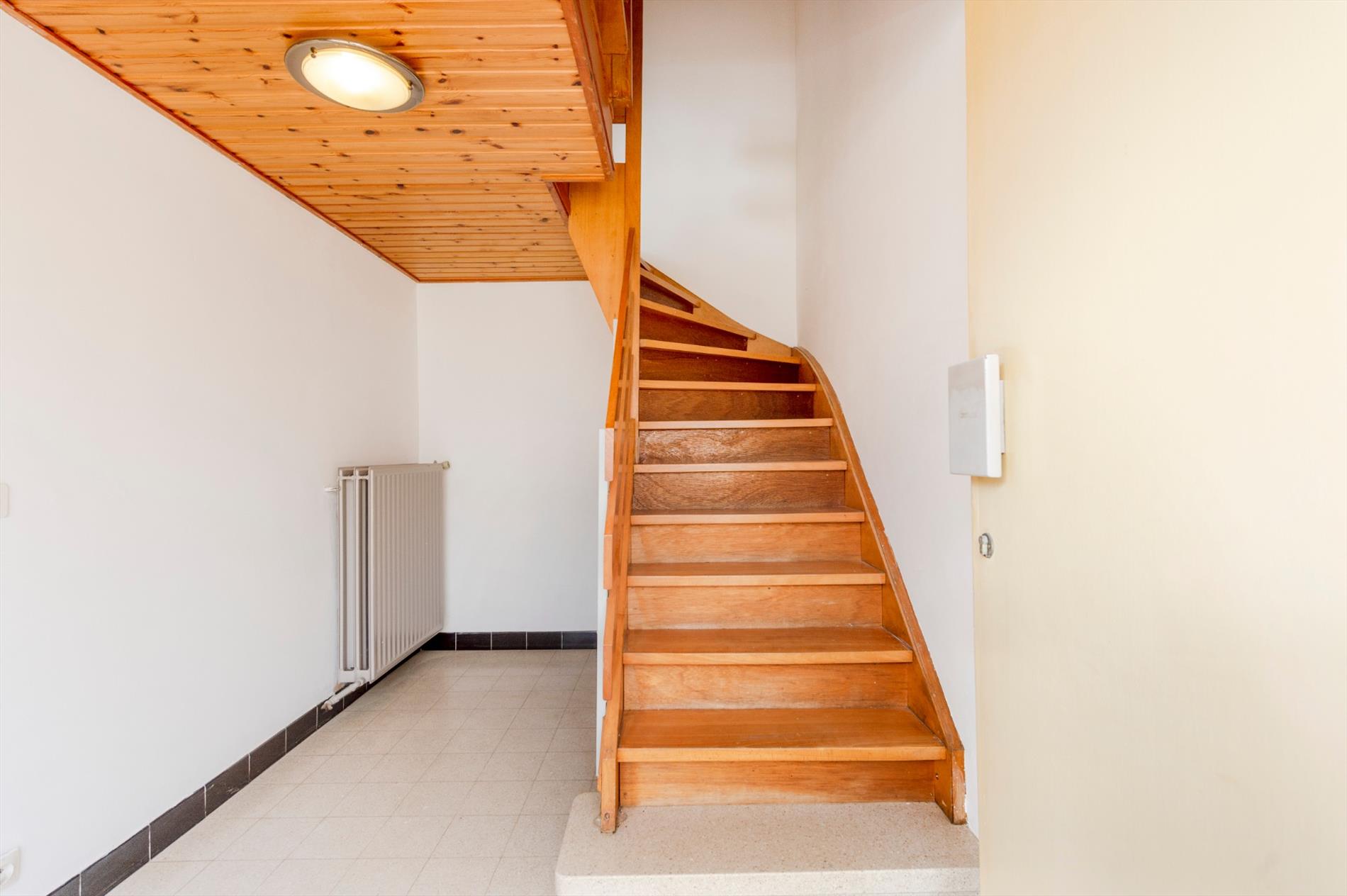 We komen binnen in een lichtrijke inkomhal met trap naar het eerste verdiep waar de leefruimten zich bevinden.
