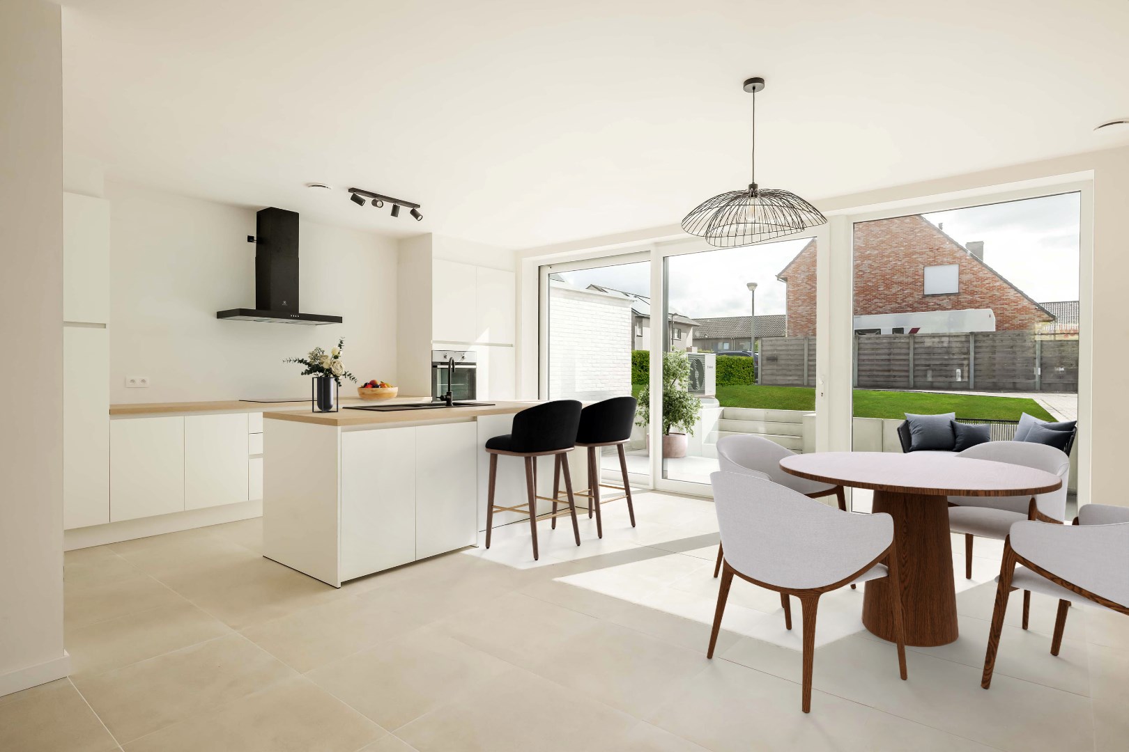 Bij binnenkomst komt u in de inkomhal met een apart gastentoilet. U wordt verwelkomd in de lichtrijke leefruimte (35 m²) met zowel een zit- als eethoek, die naadloos aansluit op de open ingerichte keuken (12 m²) met eiland en praktische koele berging (6 m²). Deze ruimtes bieden directe toegang tot het terras/de tuin.