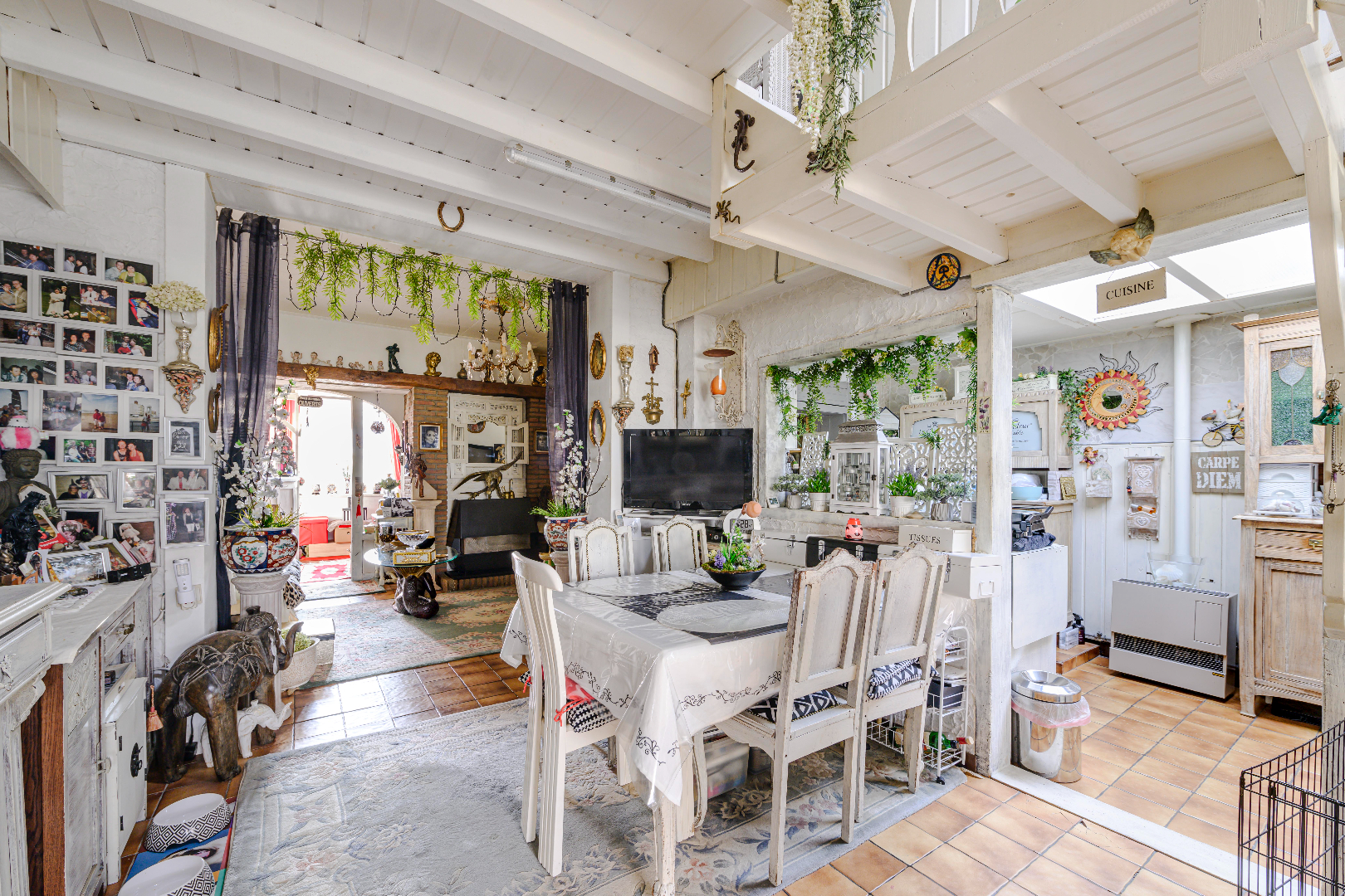 U komt de woning binnen via de inkomhal. Verder komt U terecht in de leefruimte (53 m² met een zitruimte, eetplaats en extra ruimte vooraan die kan dienen als bureau) die voorzien is van veel lichtinval door de vele raampartijen. In deze ruimte is een gezellige gaskachel voorzien. U beschikt tevens over directe toegang tot het terras/tuin.