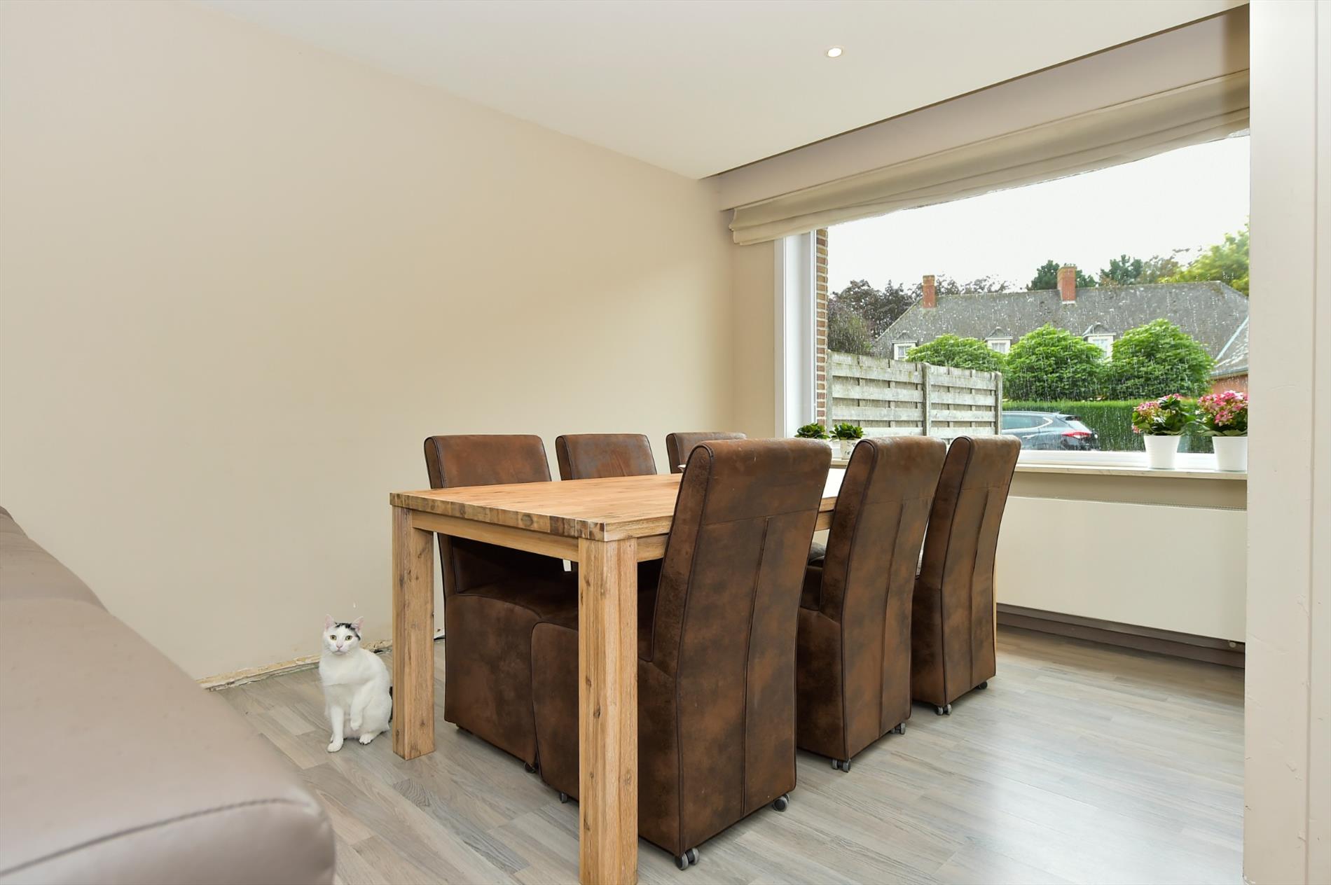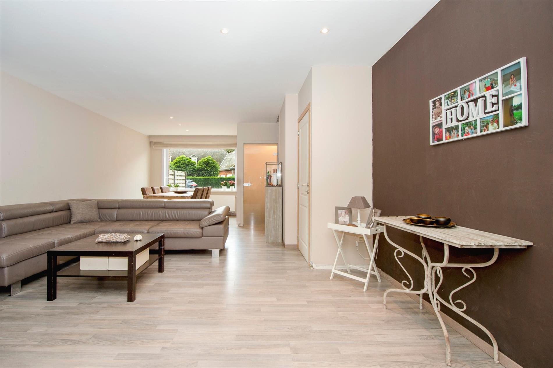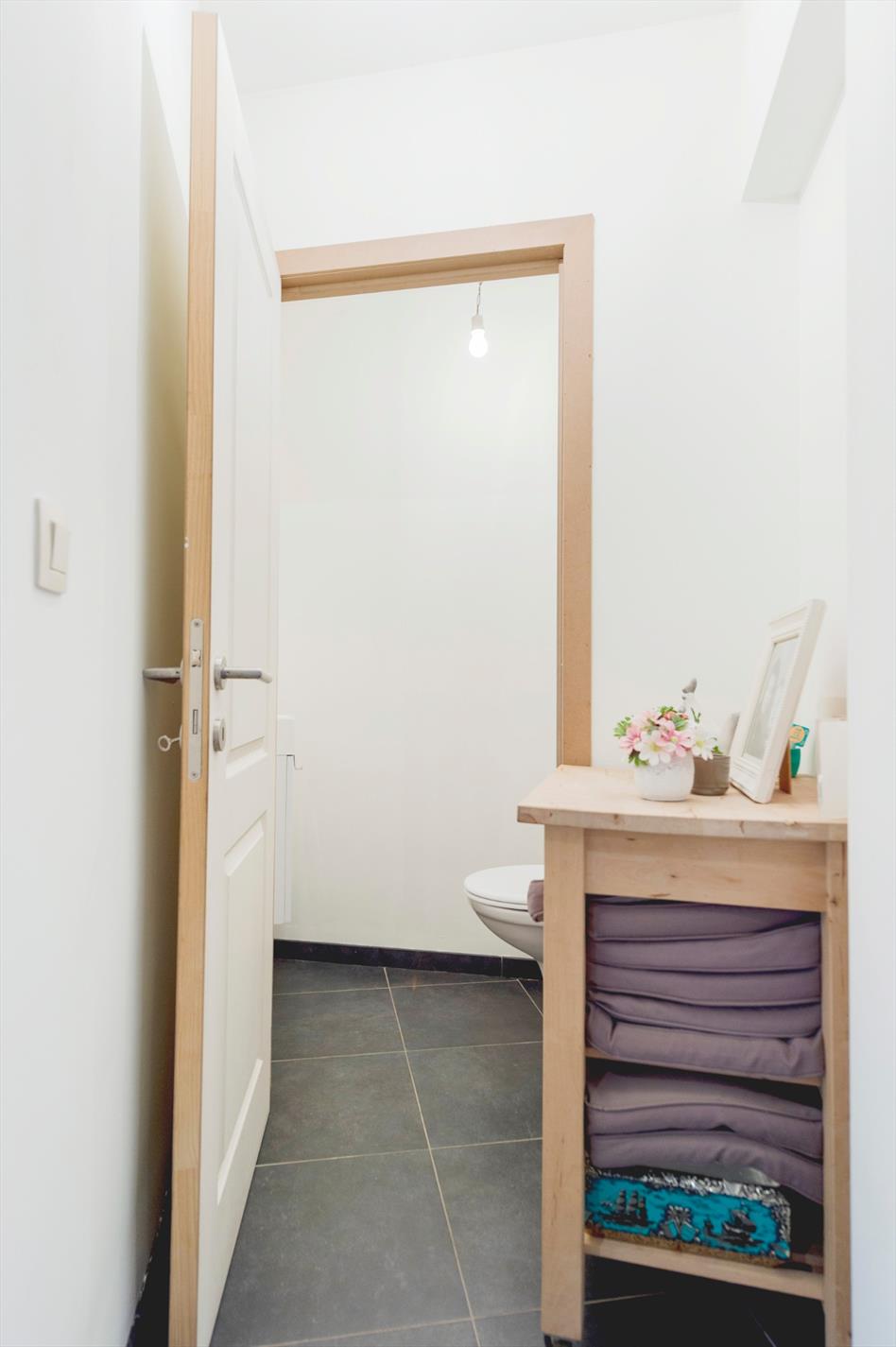 Het gelijkvloers is in 2010 volledig vernieuwd (isolatiechappe, bevloering, sanitair, raamwerk, keuken....). Indeling: Inkomhal, bezoekerstoilet, ruime lichtrijke leefruimte (37,70 m²) met voorzieningen voor eventueel gashaard, open volledig ingerichte keuken met ontbijthoek (kookplaat | dampkap | oven | microgolf | frigo | vaatwasser). het grote schuifraam zorgt voor veel lichtinval en zicht op de tuin.