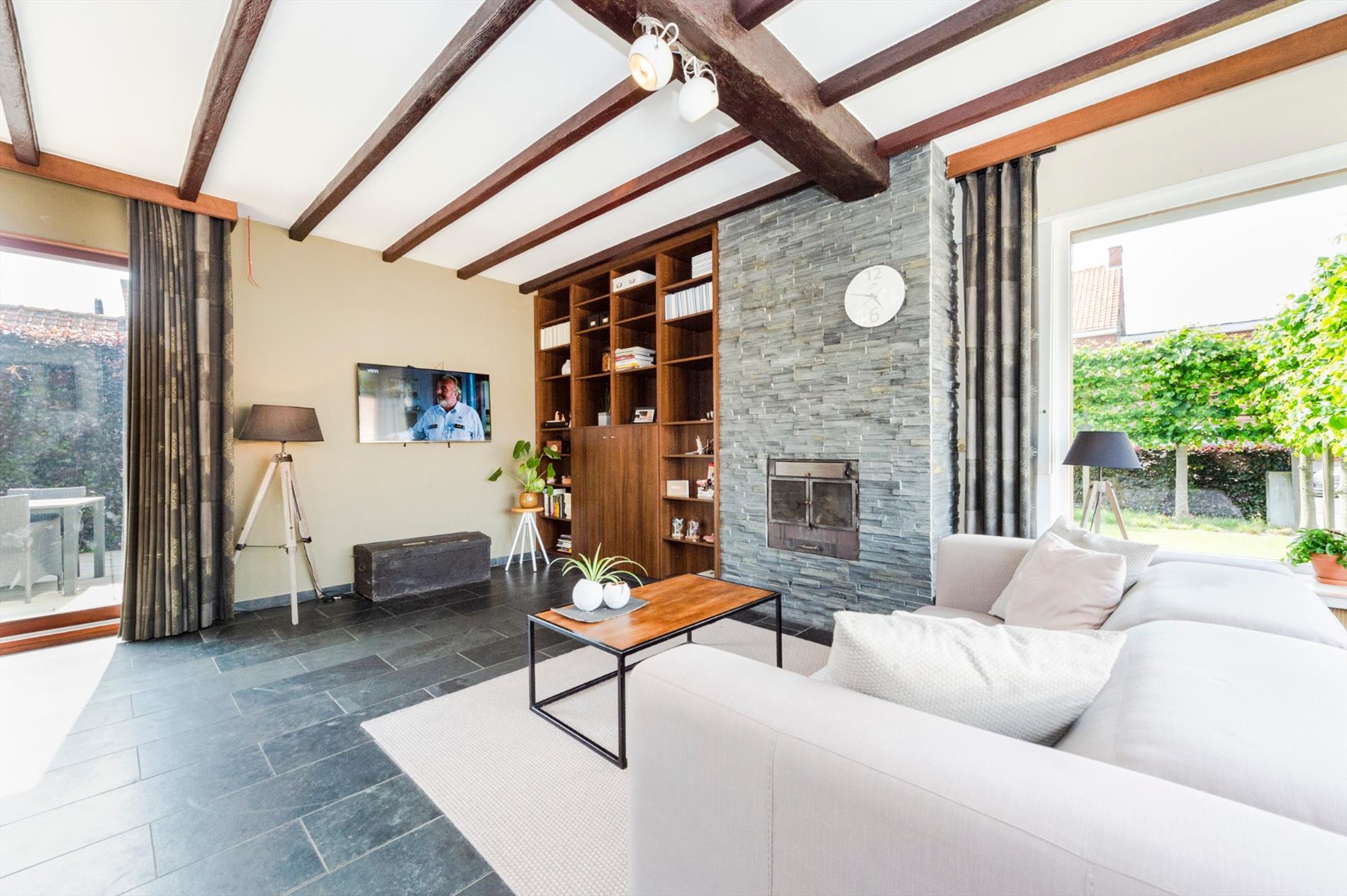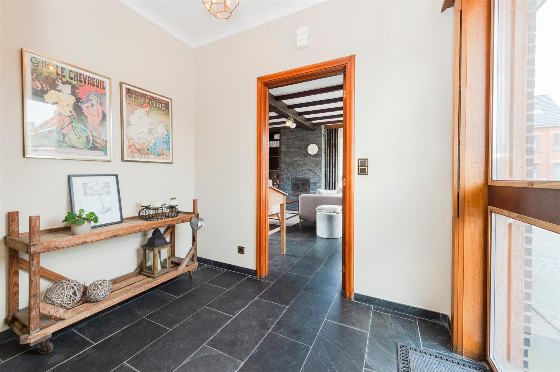 U komt binnen in een ruime inkomhall met gastentoilet. Aansluitend is de L-vormige leefruimte met open haard alsook directe toegang tot het terras. Verder beschikt U over een gesloten ingerichte keuken (muur tussen keuken en leefruimte kan opengemaakt worden indien gewenst) met toegang tot de ruime droge kelder.