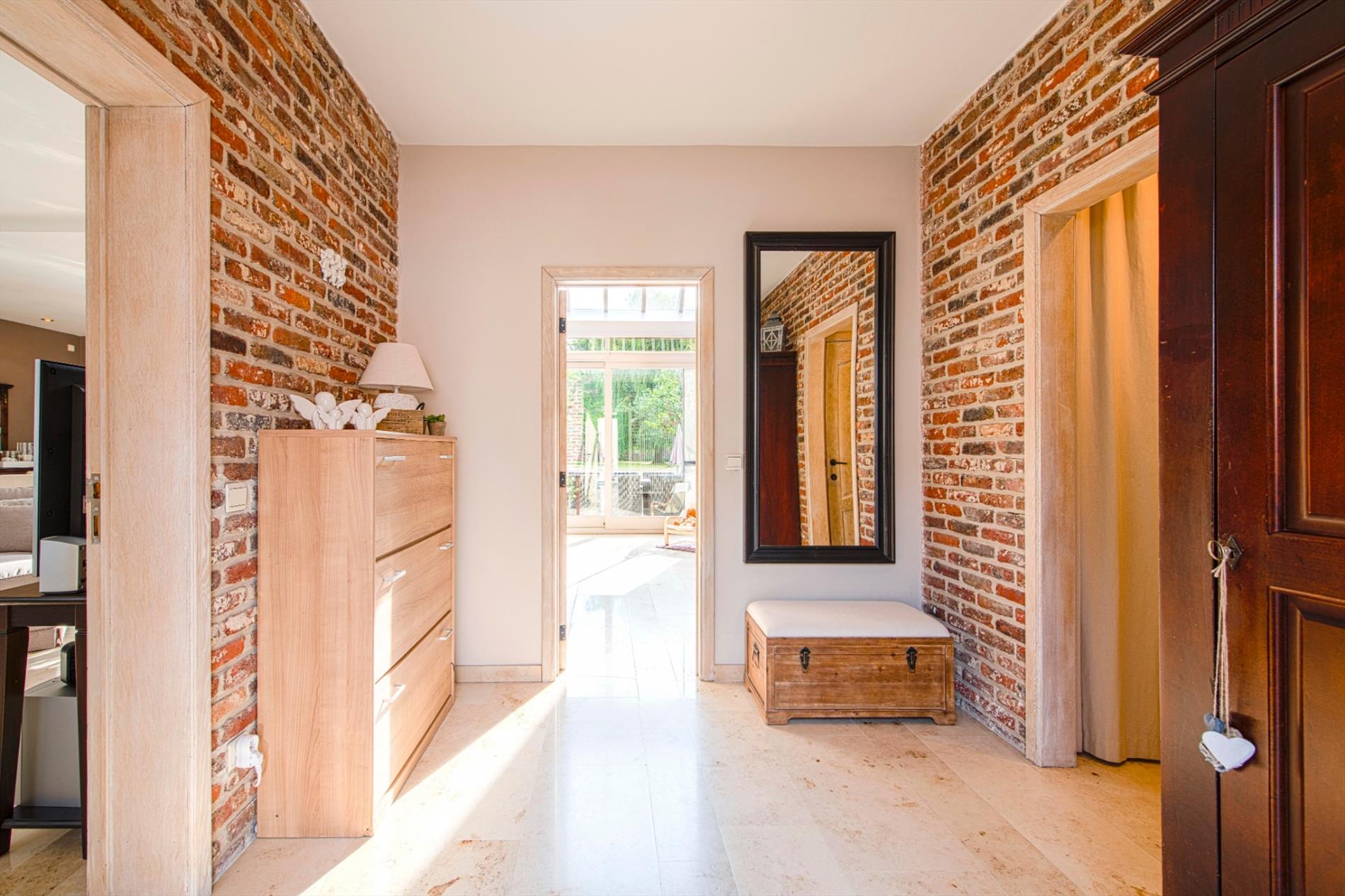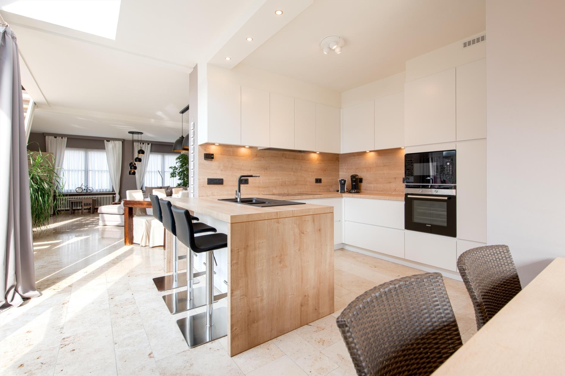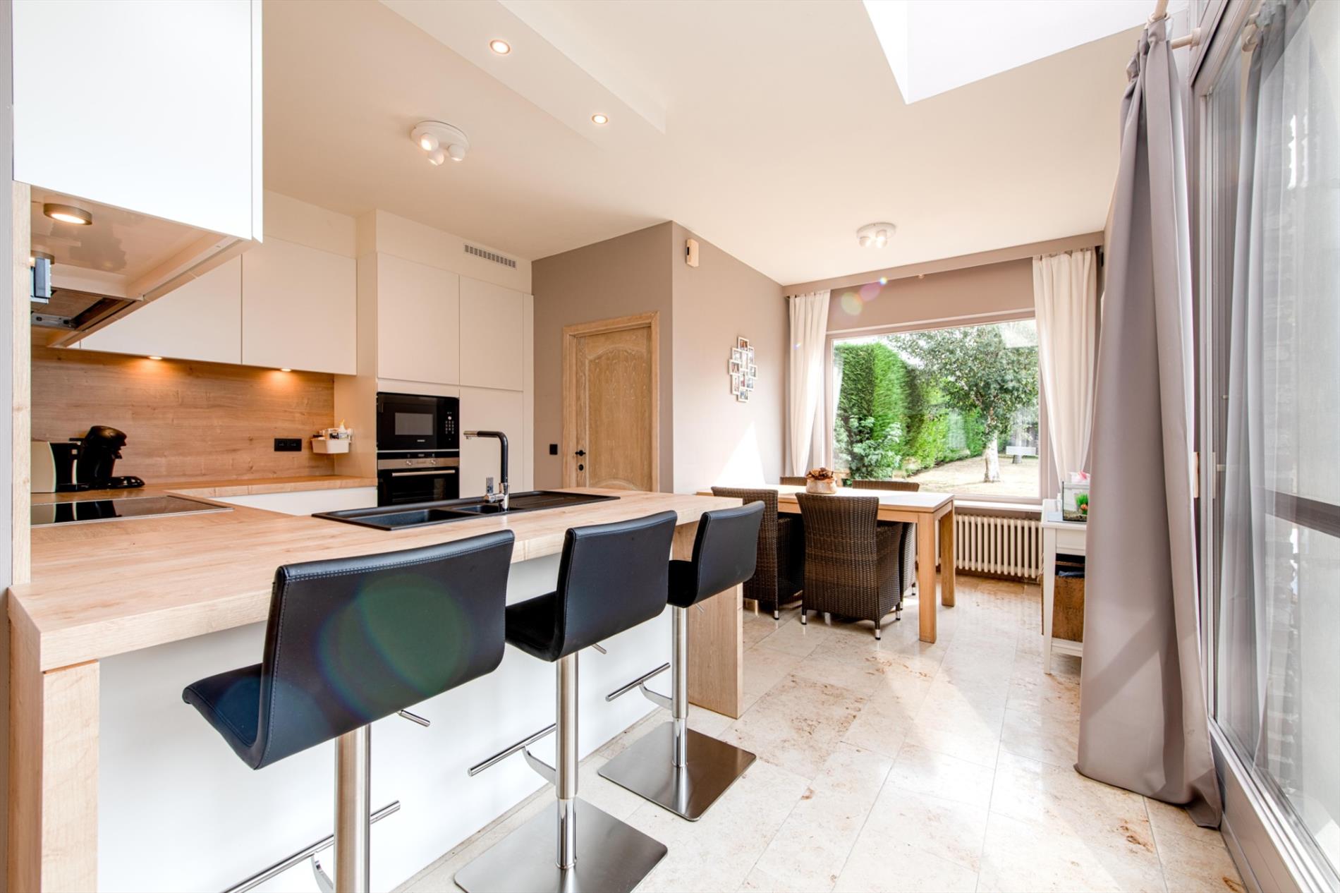Gelijkvloers:U komt de eigendom binnen via de ruime inkom het gastentoilet. Vanuit de inkom is er toegang tot de leefruimte van 49 m² met bureauruimte. Aansluitend is er de recente (DOVY 2017) volledig ingerichte leefkeuken (23 m²) met aansluitende berging/wasplaats. Door de grote raampartijen is enorm veel natuurlijk lichtinval.