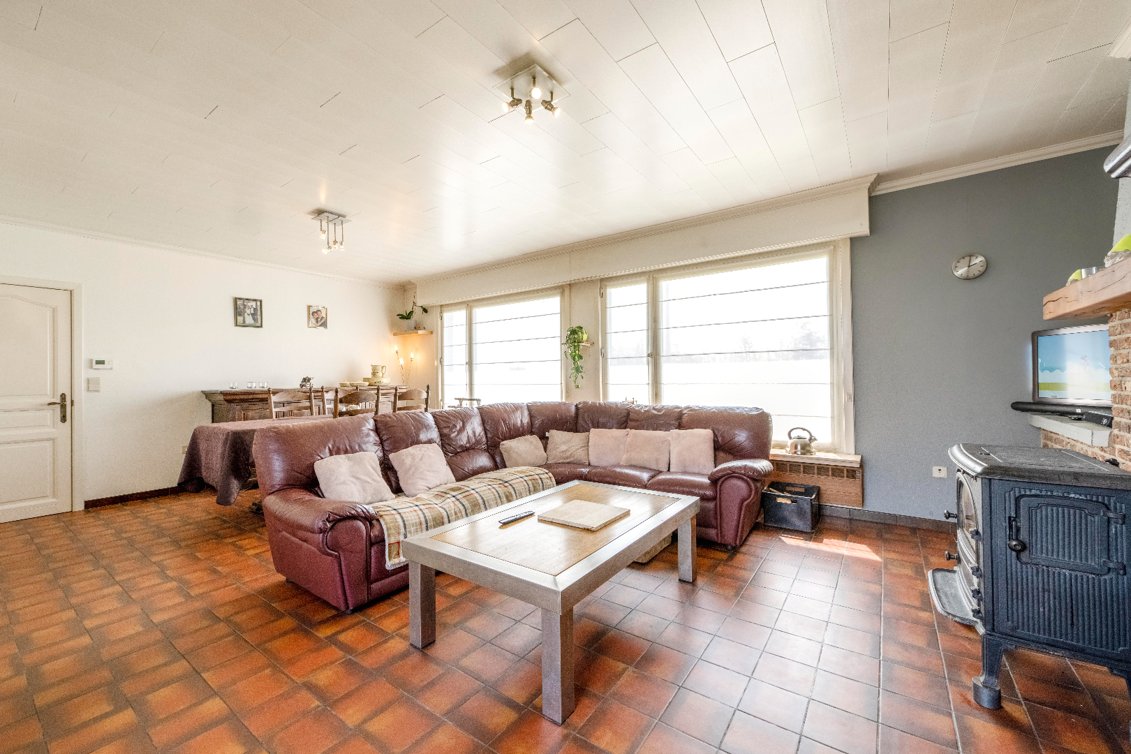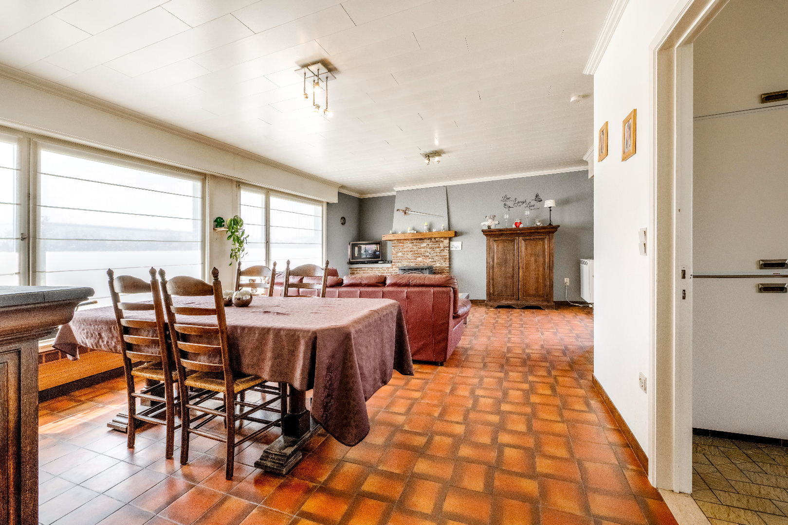 U komt binnen via de inkomhal met apart gastentoilet. Aansluitend is er de ruime leefruimte (35 m²) met zit- en eethoek. U kan tevens via het schuifraam direct het terras/achtertuin betreden.