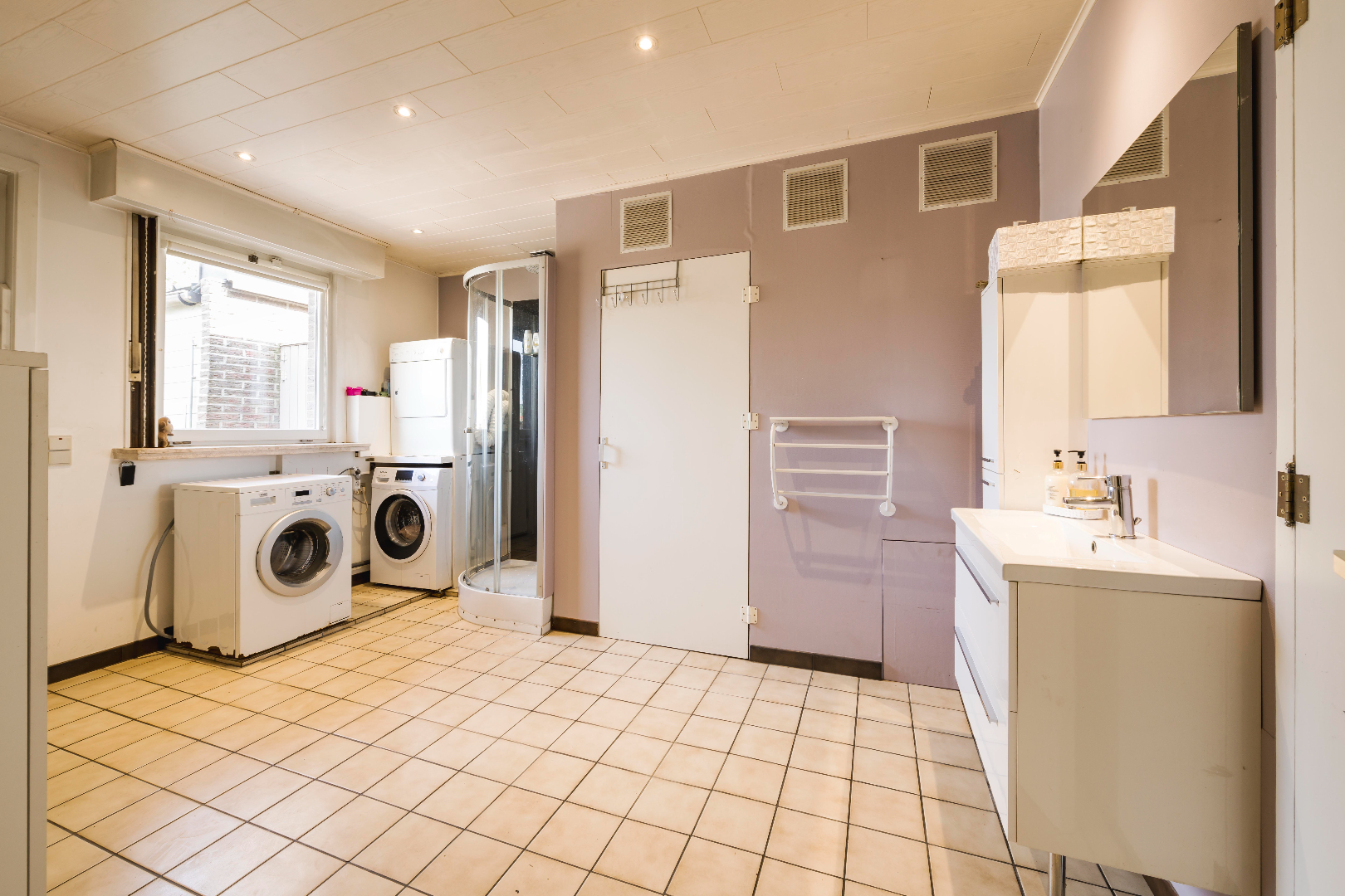 Op het gelijkvloers beschikt U ook over een ruime wasplaats/achterinkom met douche/lavabo. Als laatste is er de inpandige garage met geautomatiseerde poort.